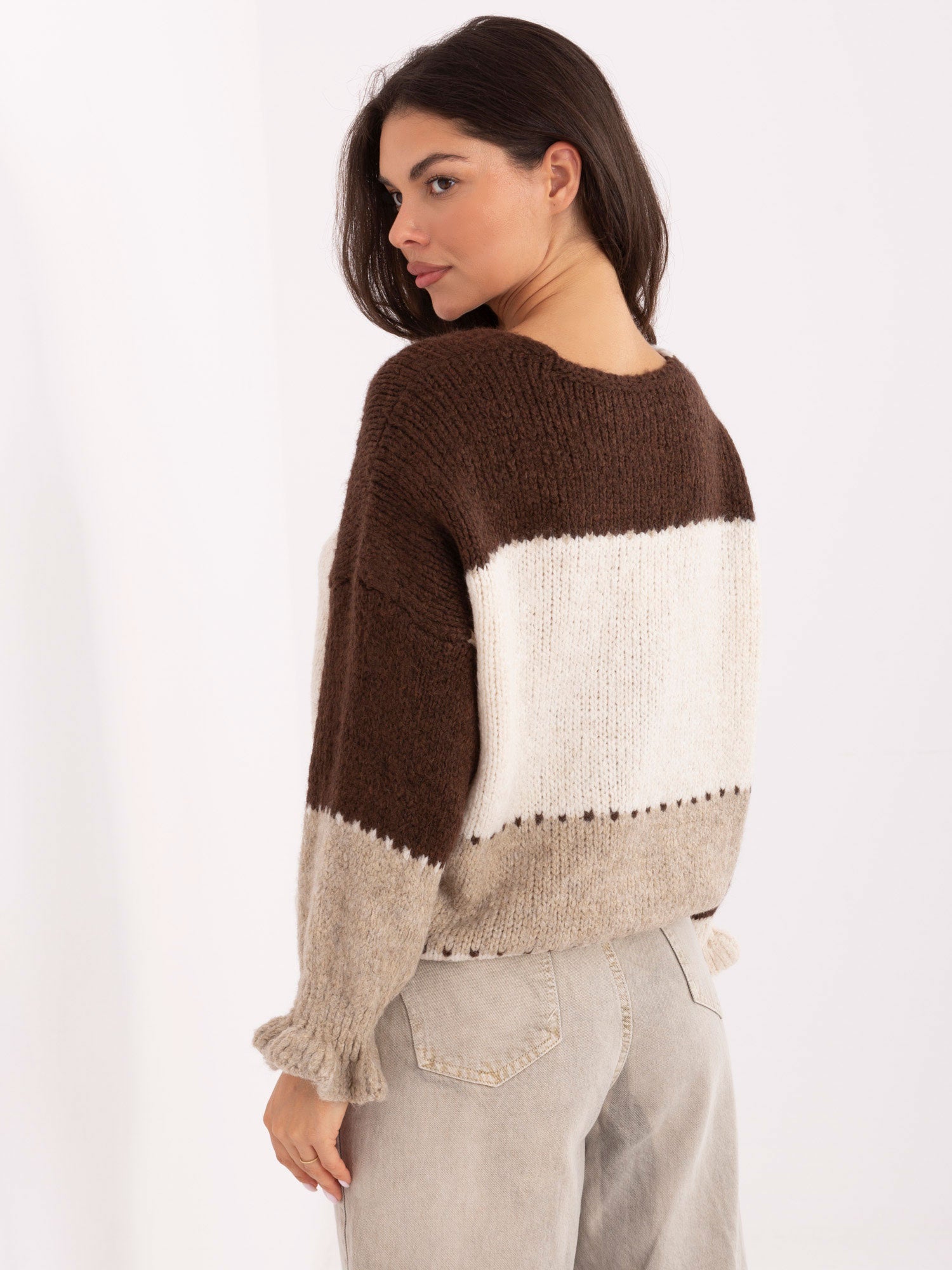 Wymiary swetra w rozmiarze one size mierzone na płasko: szerokość pod pachami - 67 cm, długość rękawa - 42 cm (od szwu), szerokość w biodrach - 55 cm, szerokość w talii - 39 cm,  długość całkowita - 64 cm.