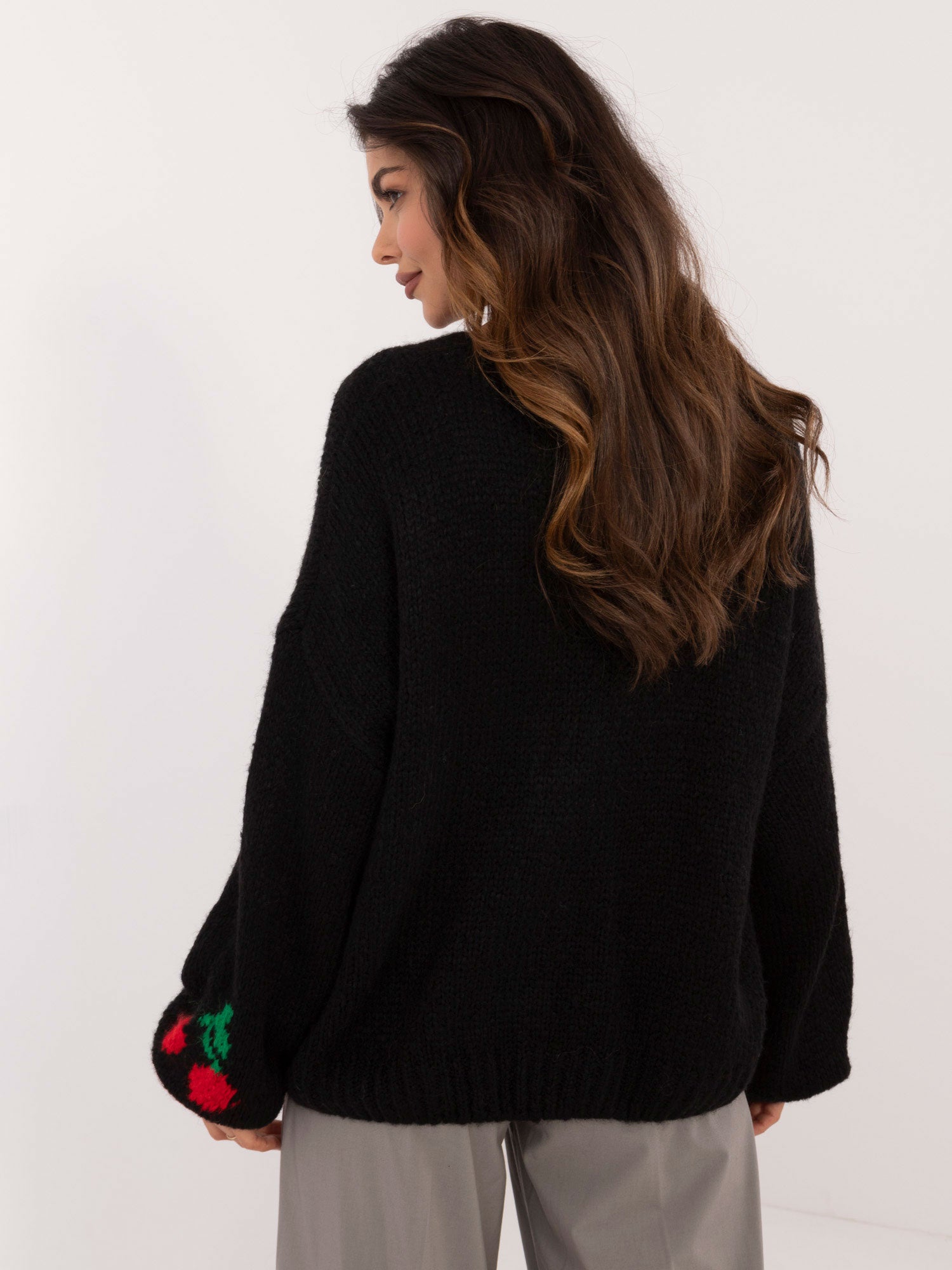 Wymiary swetra w rozmiarze one size mierzone na płasko: szerokość pod pachami - 69 cm, długość rękawa - 67 cm, długość całkowita - 63 cm.
