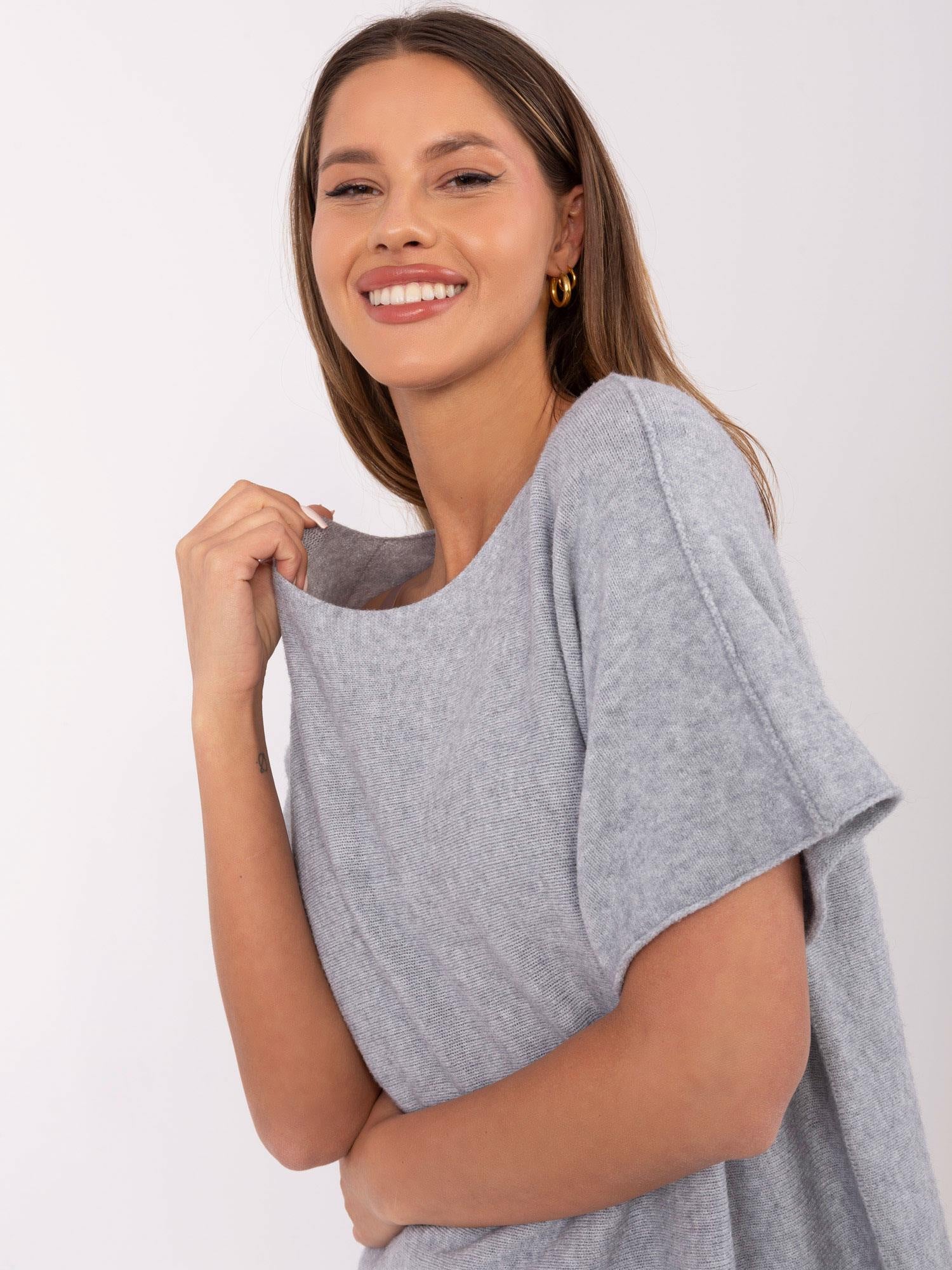Wymiary swetra w rozmiarze one size mierzone na płasko: szerokość pod pachami - 58 cm, długość rękawa - 12 cm (od pacy), szerokość w biodrach - 45 cm (na płasko), szerokość w biodrach - 60 cm (po rozciągnięciu), długość całkowita - 72 cm (materiał rozciągliwy).