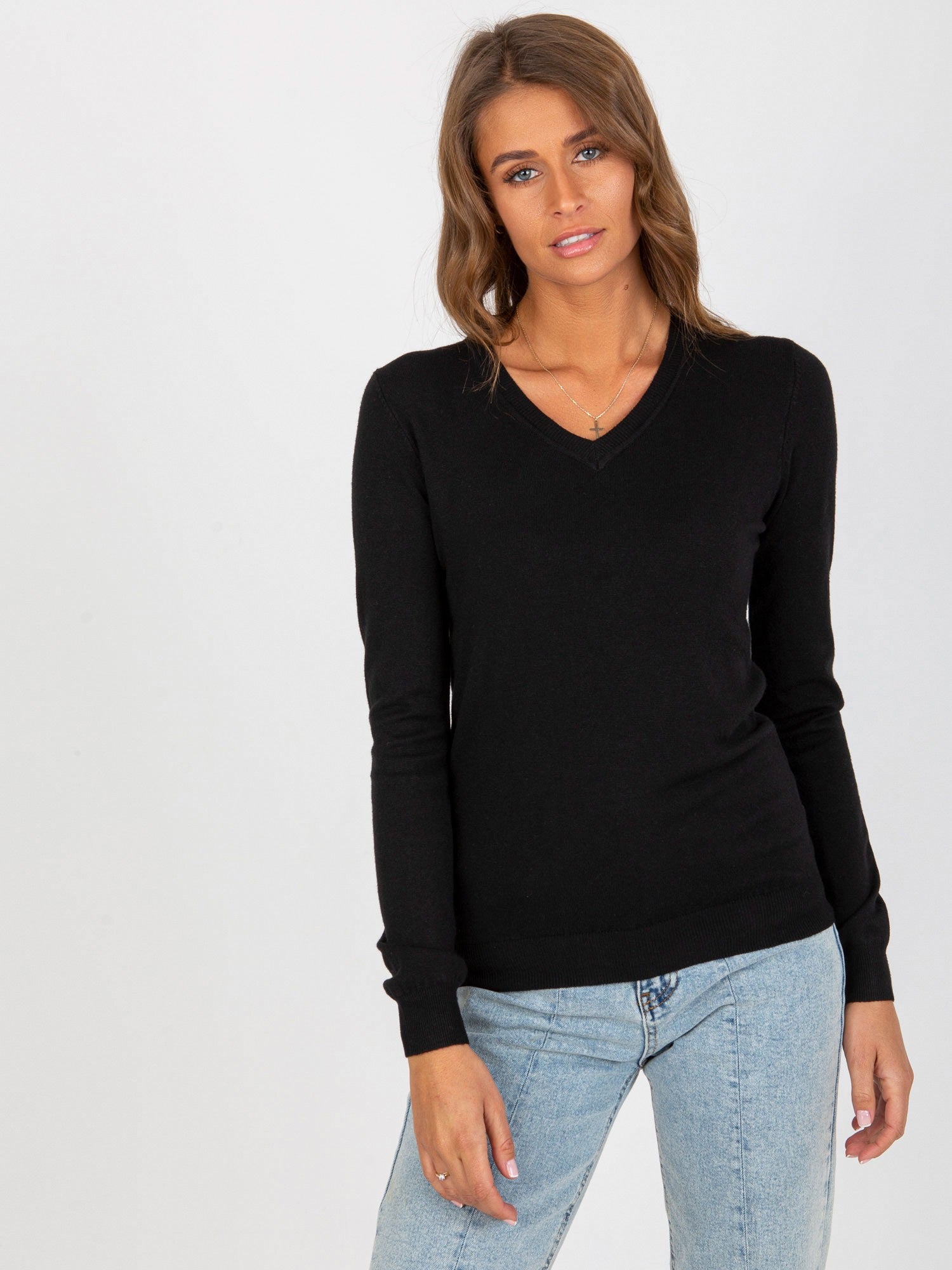 Czarny gładki sweter klasyczny z dekoltem w serek .