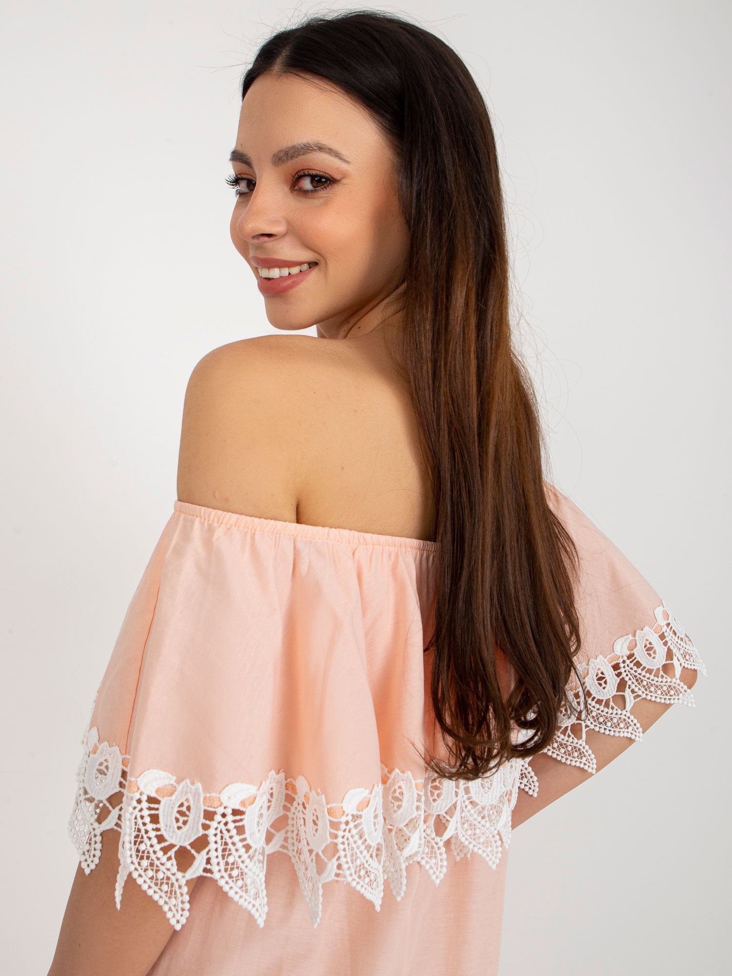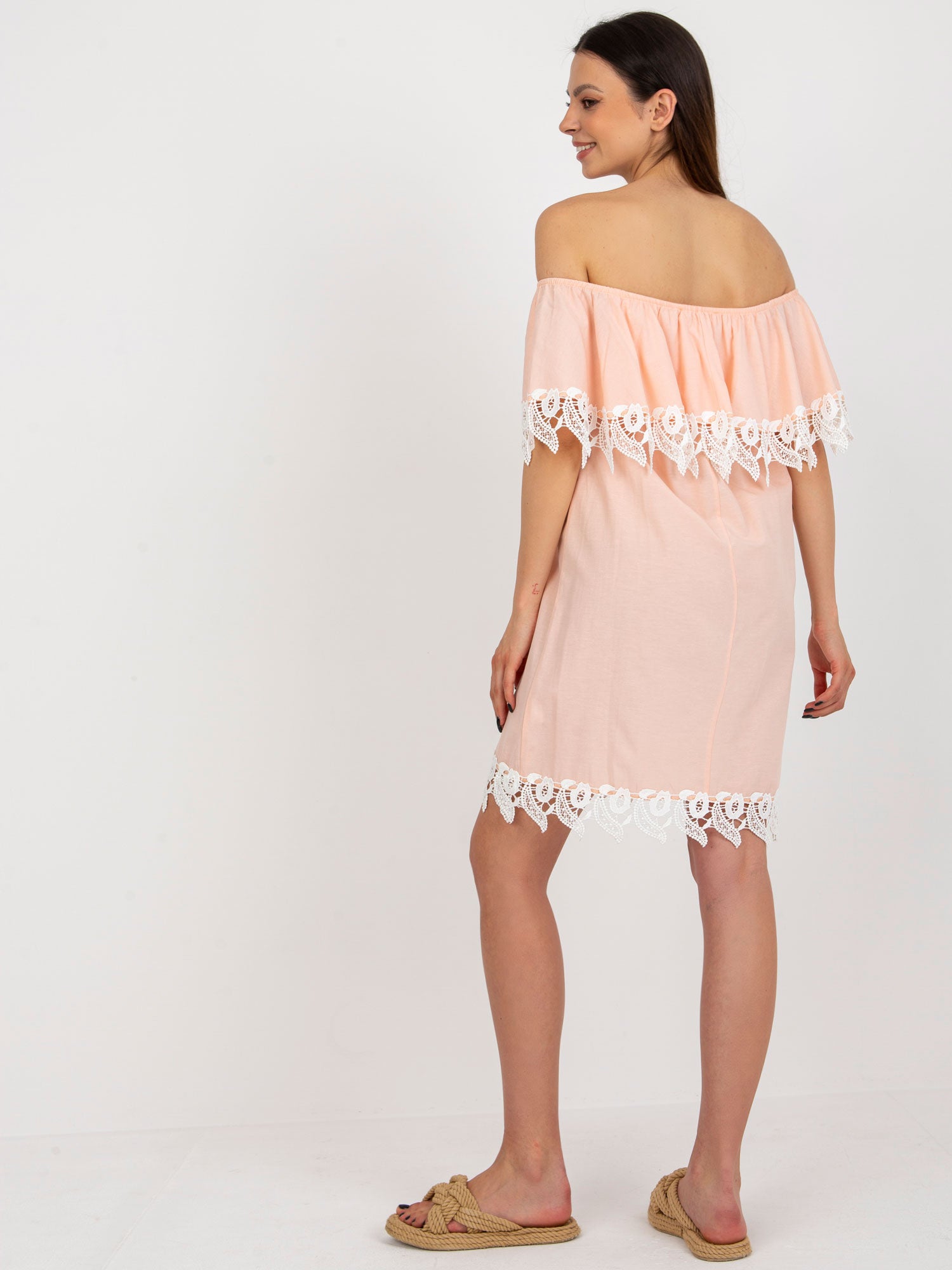 Brzoskwiniowa sukienka hiszpanka z koronką .
