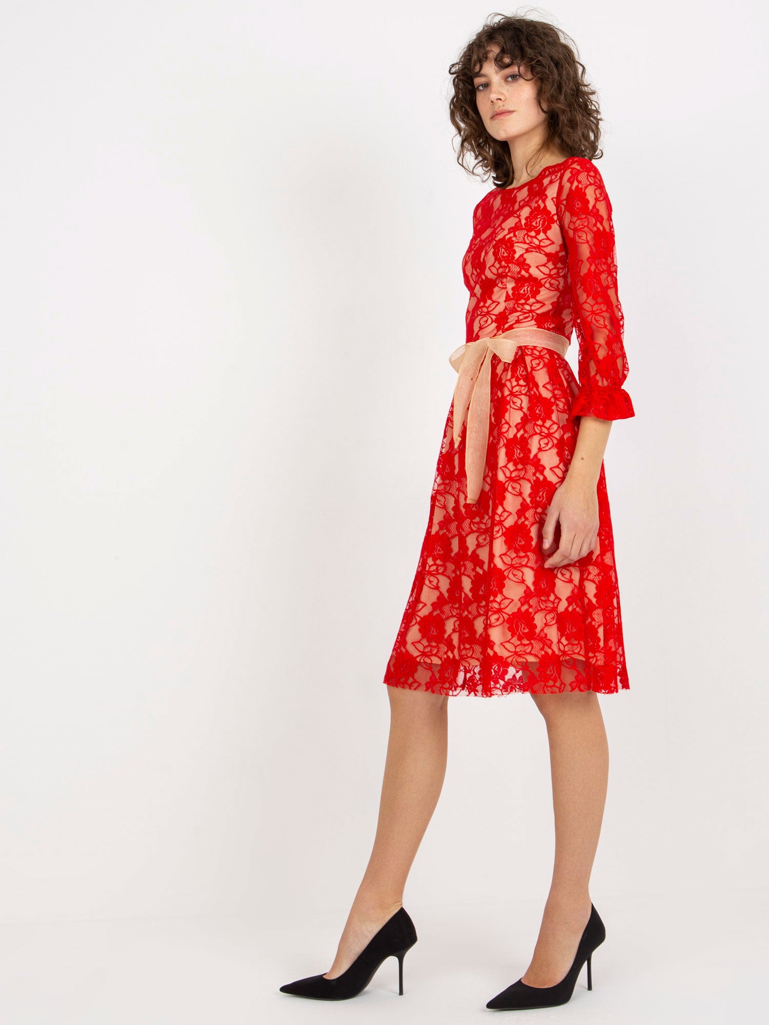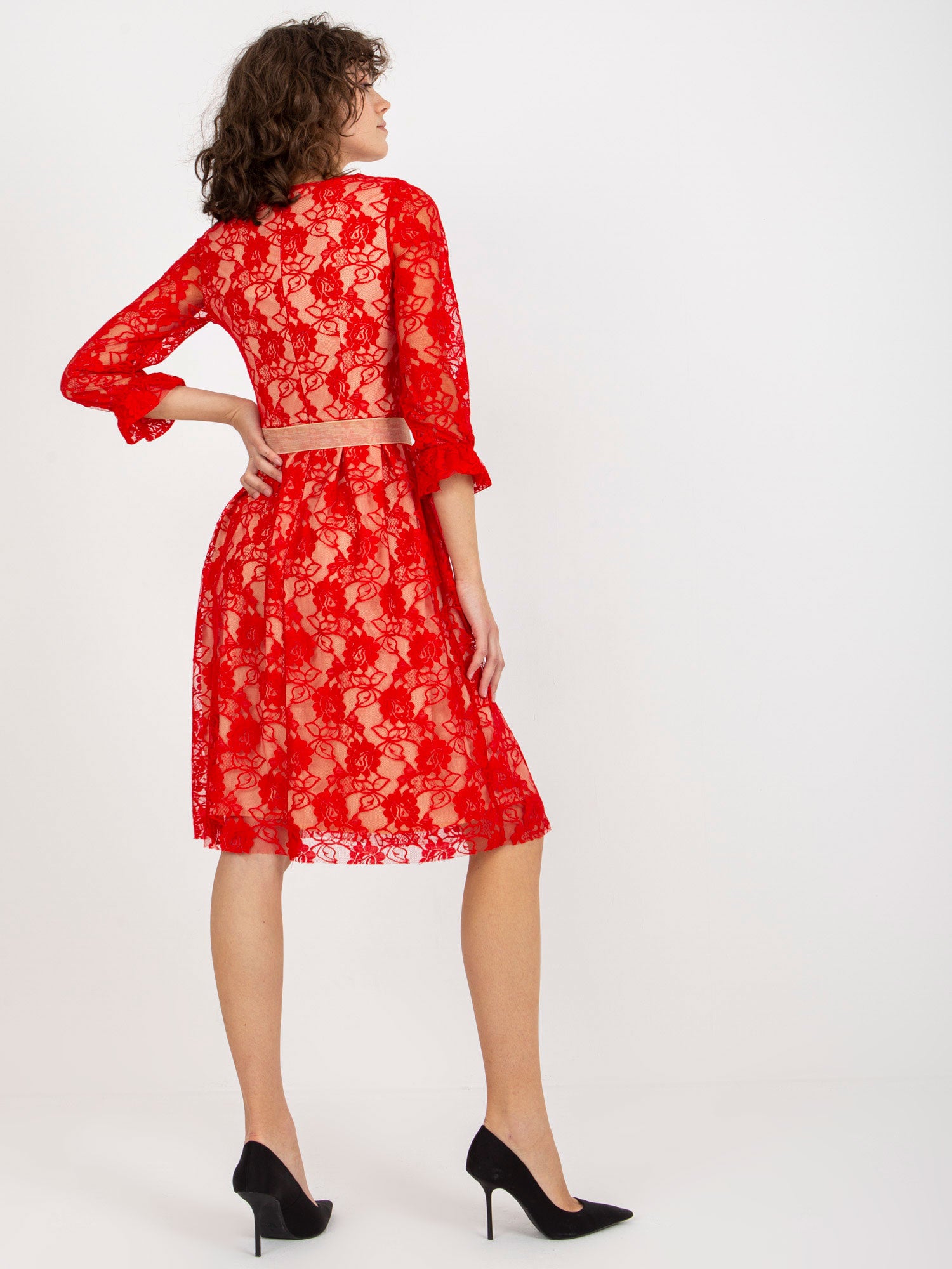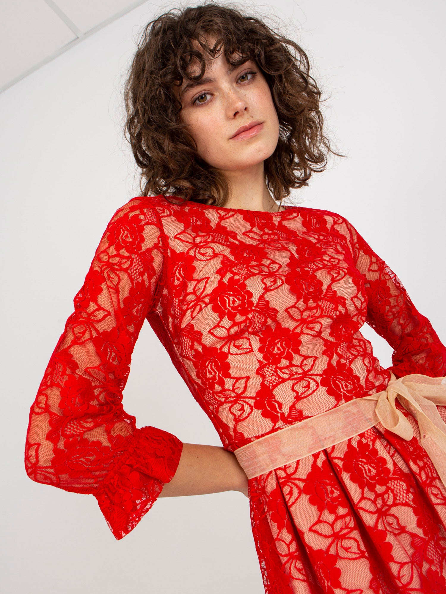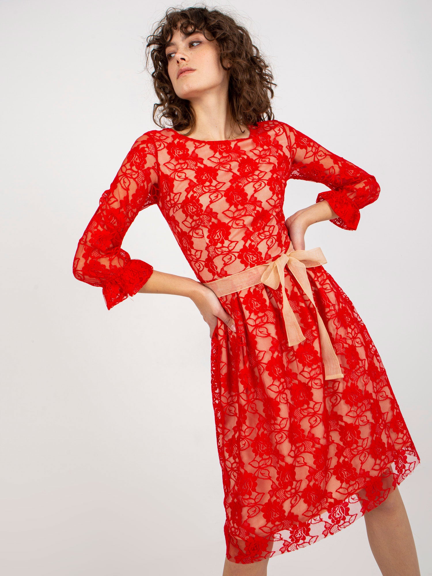 Czerwona elegancka midi sukienka koktajlowa z koronką .