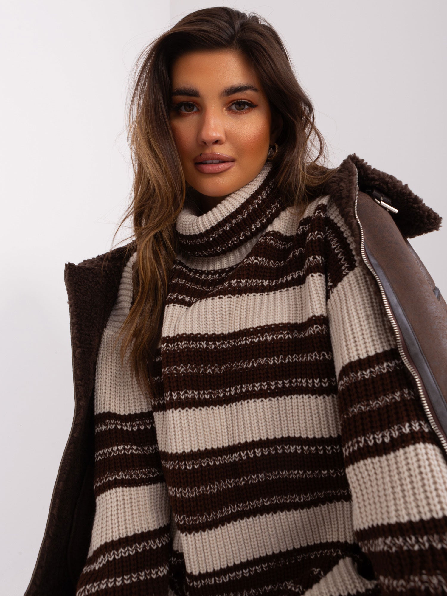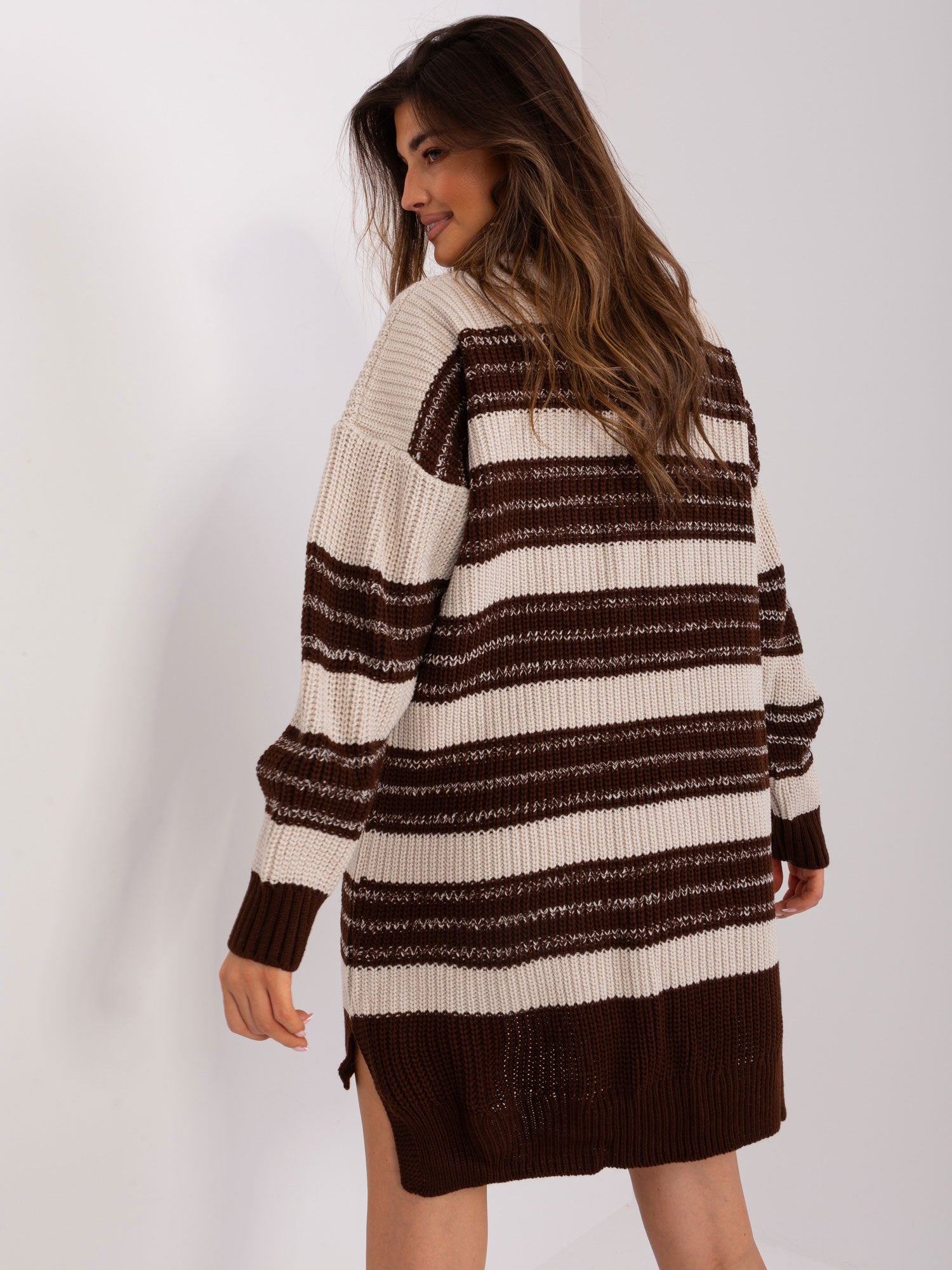 Beżowo-ciemnobrązowa sukienka z dzianiny w paski.
