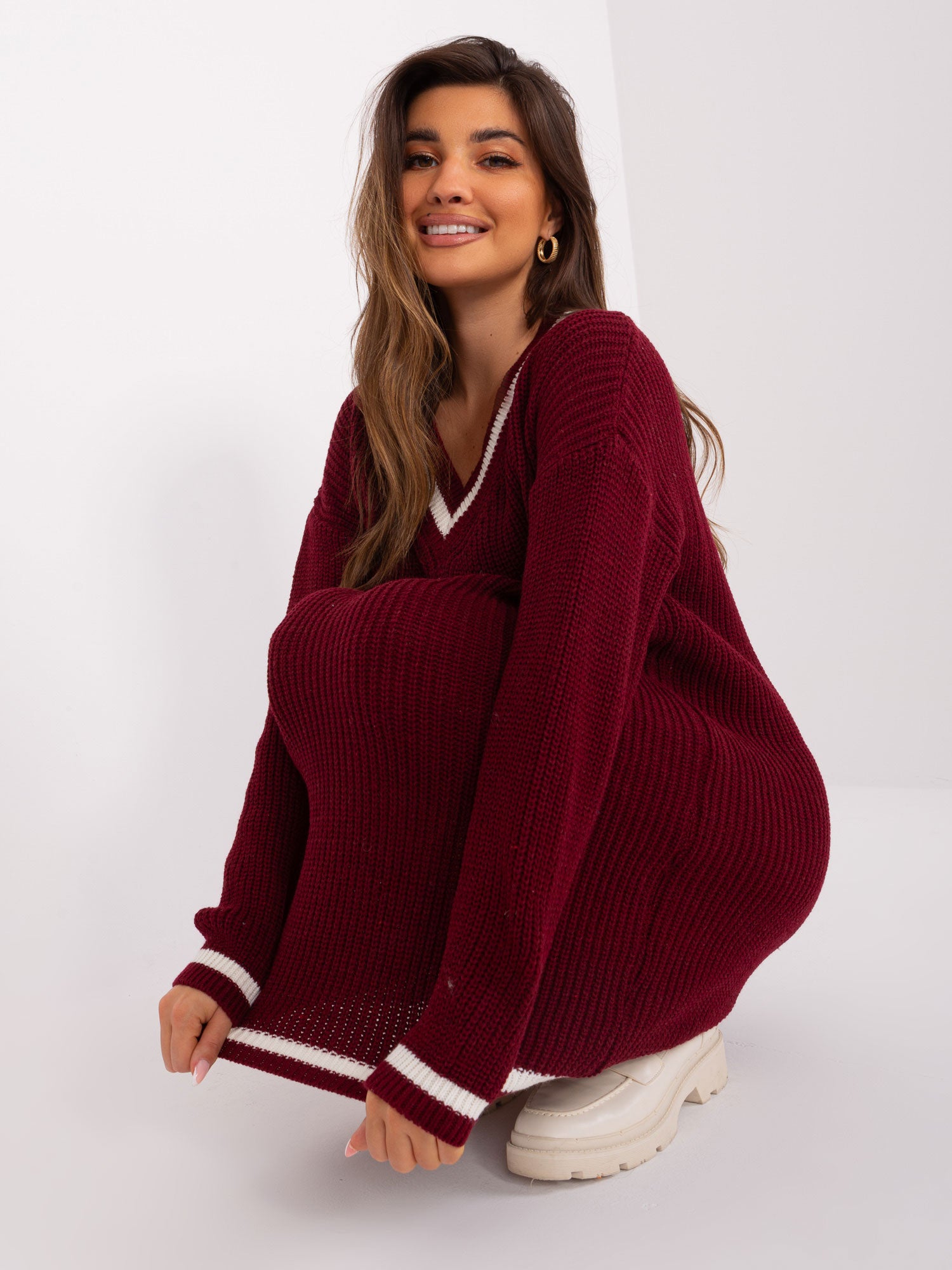 Bordowa luźna sukienka dzianinowa z dekoltem V.