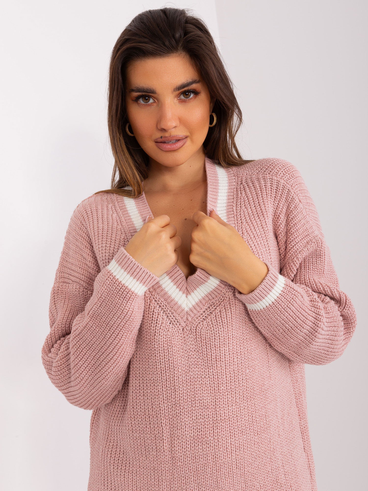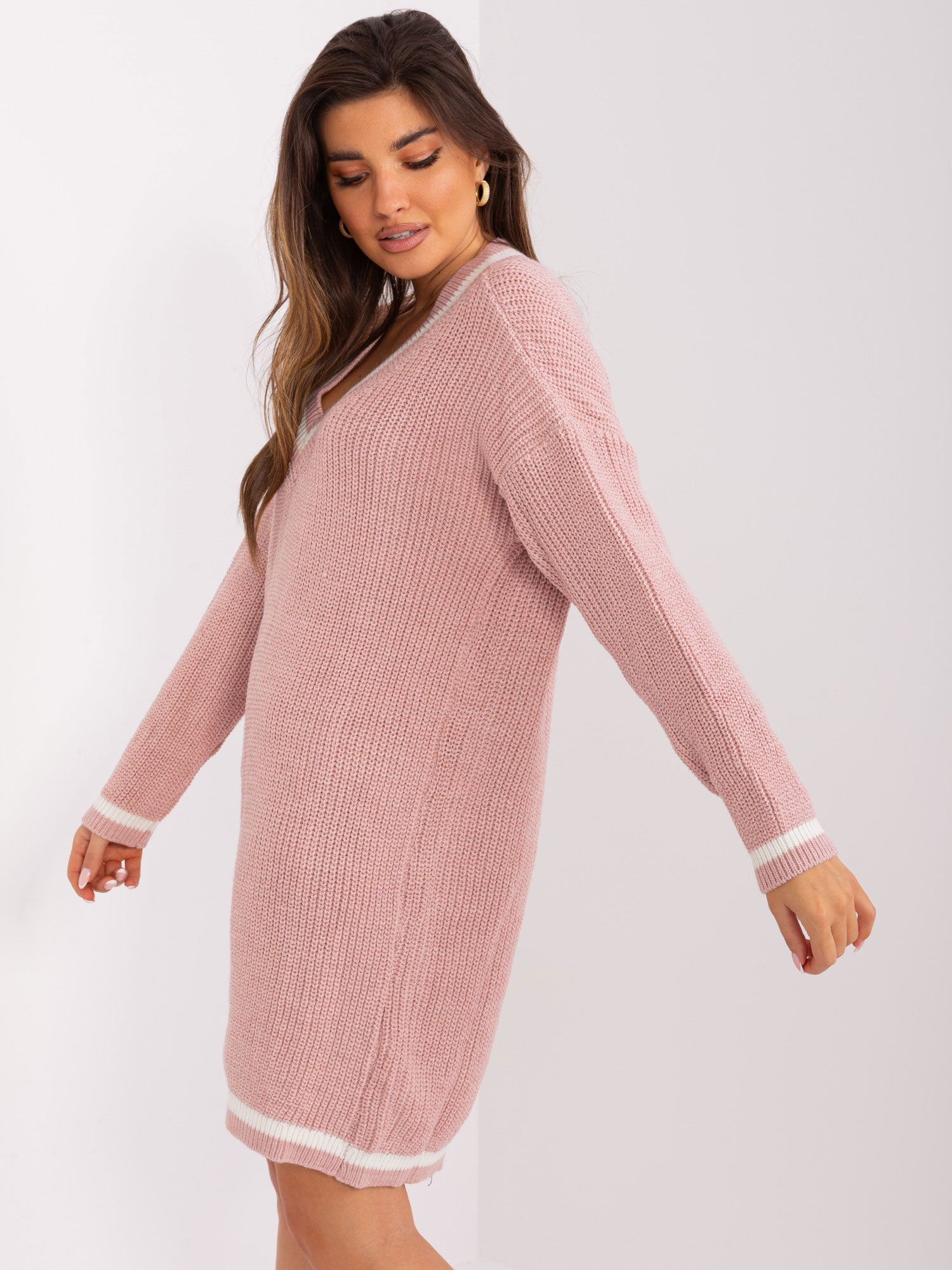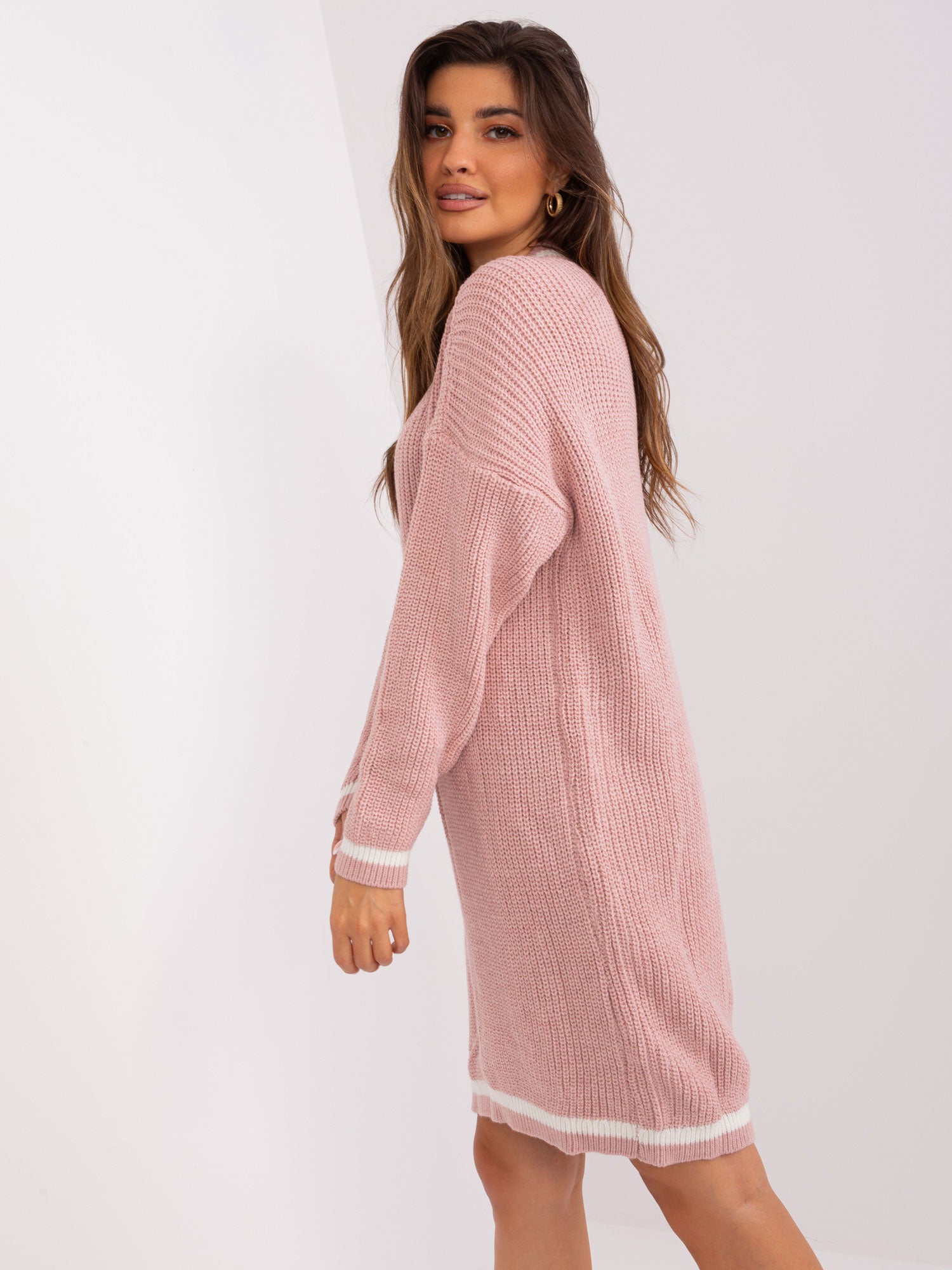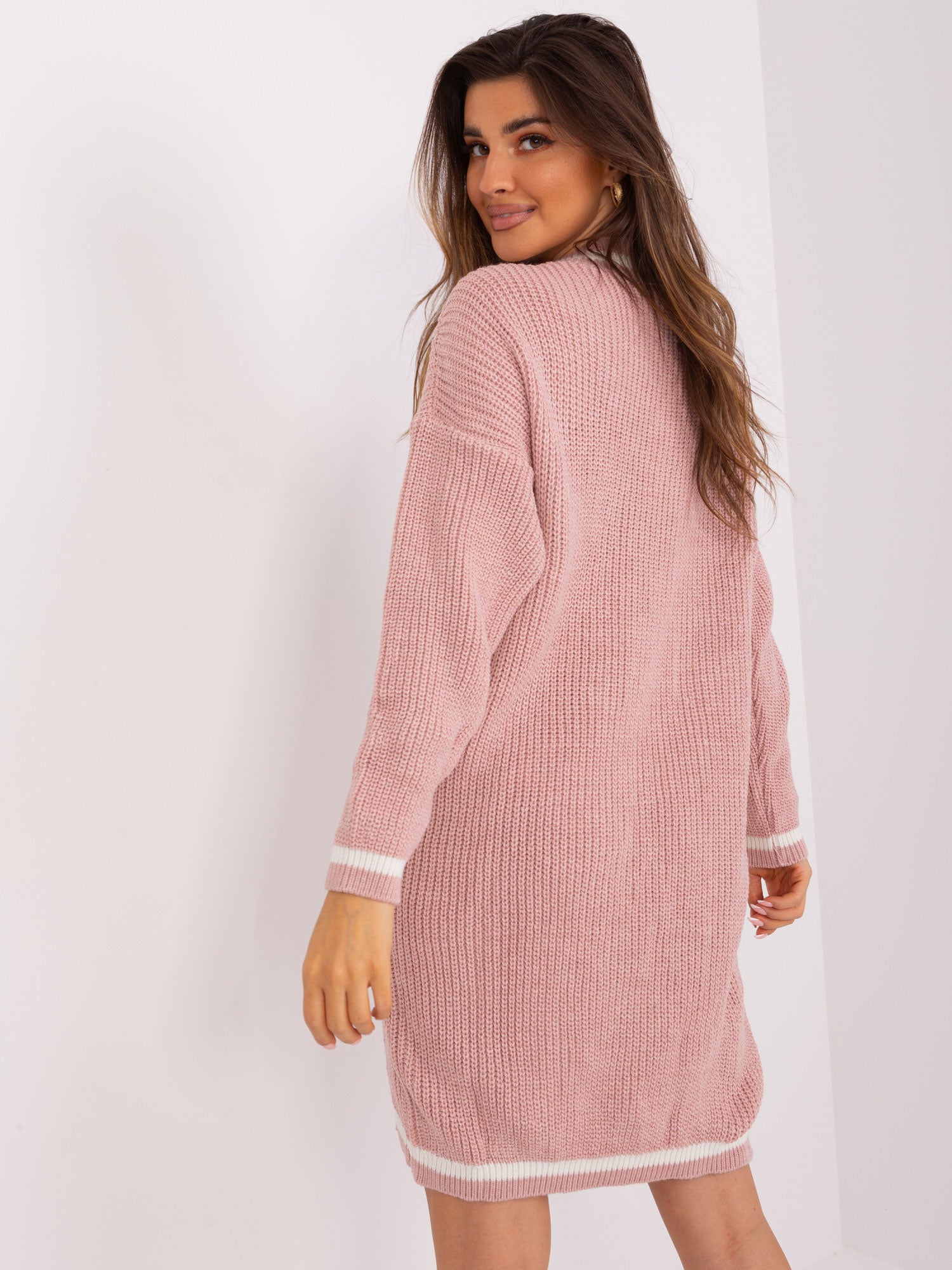 Jasnoróżowa luźna sukienka z dzianiny.