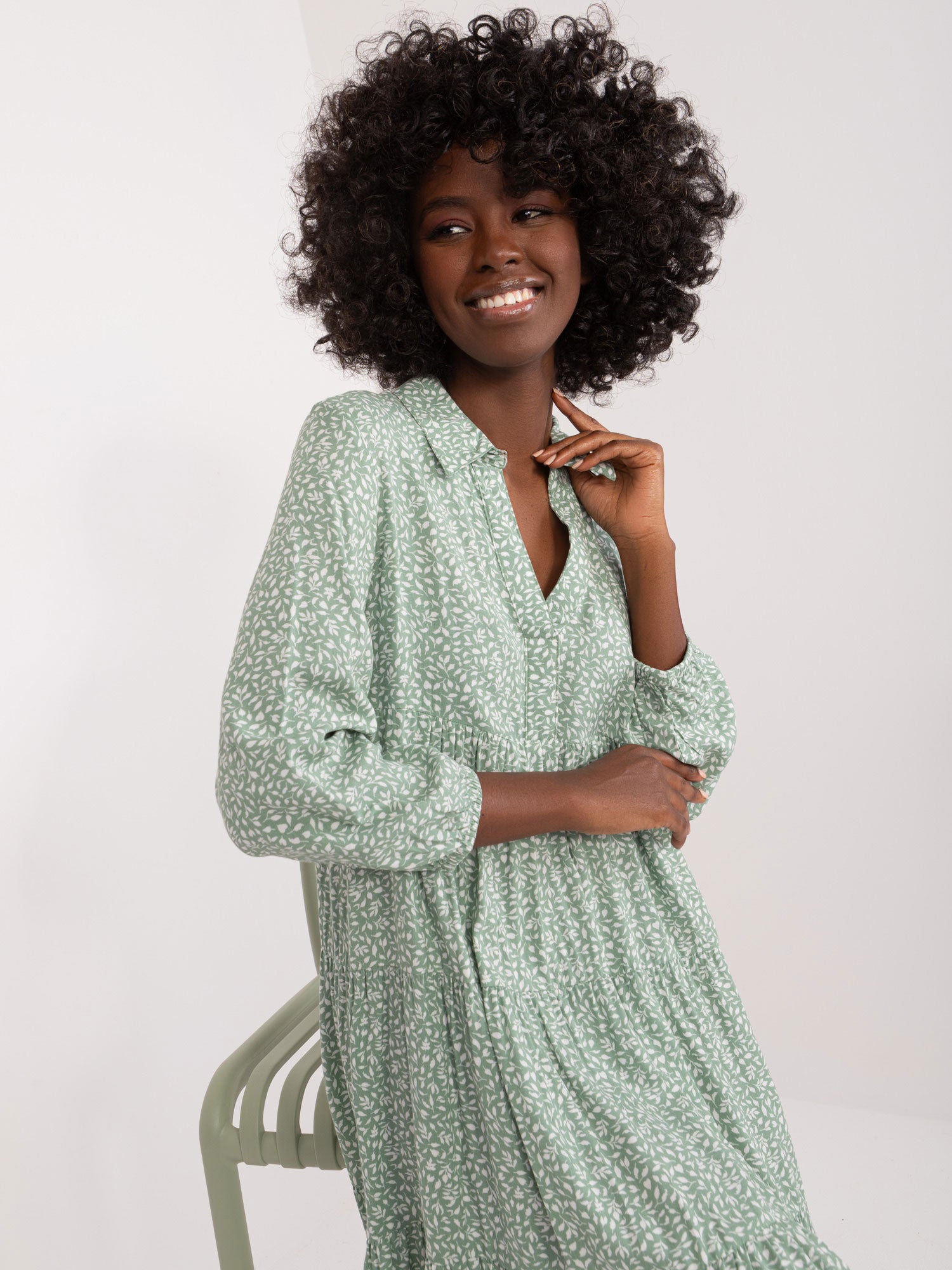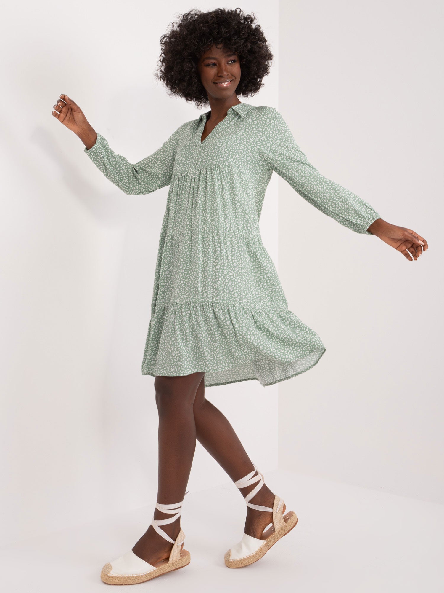 Wymiary sukienki w rozmiarze S mierzone na płasko: szerokość pod pachami - 50 cm, długość rękawa - 49 cm, długość całkowita - 94 cm.