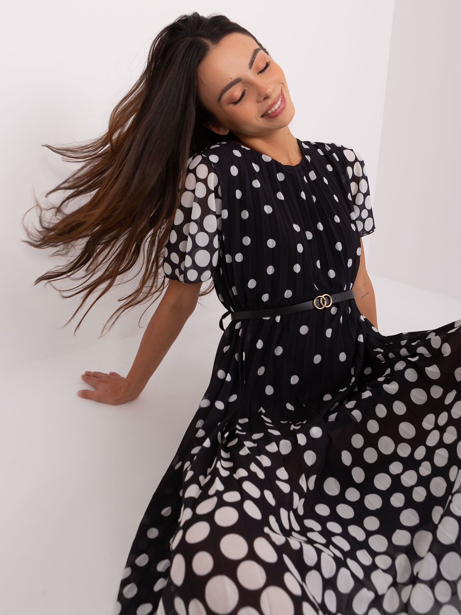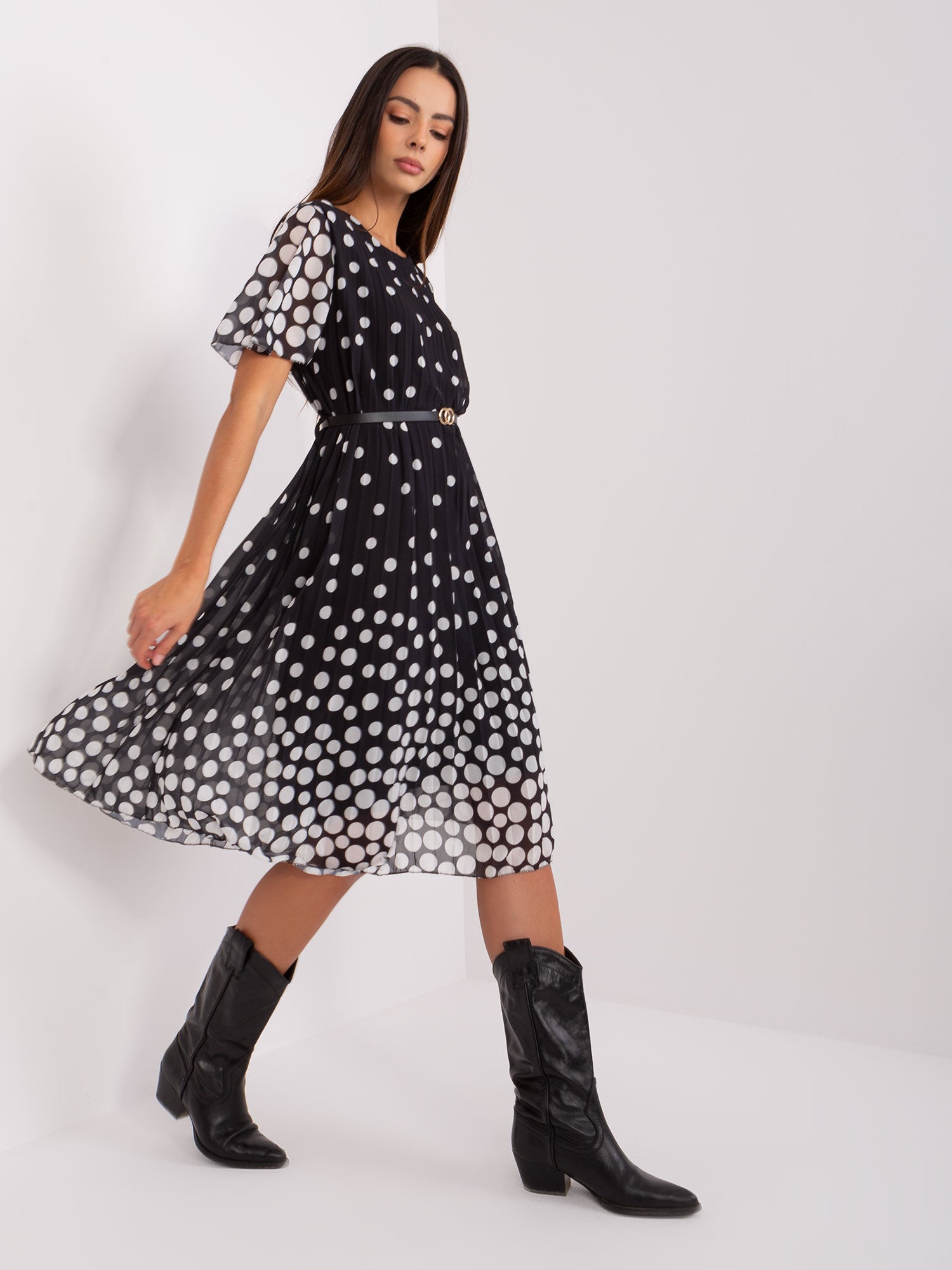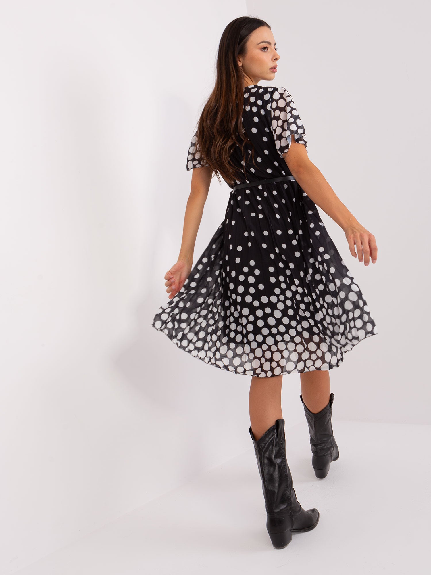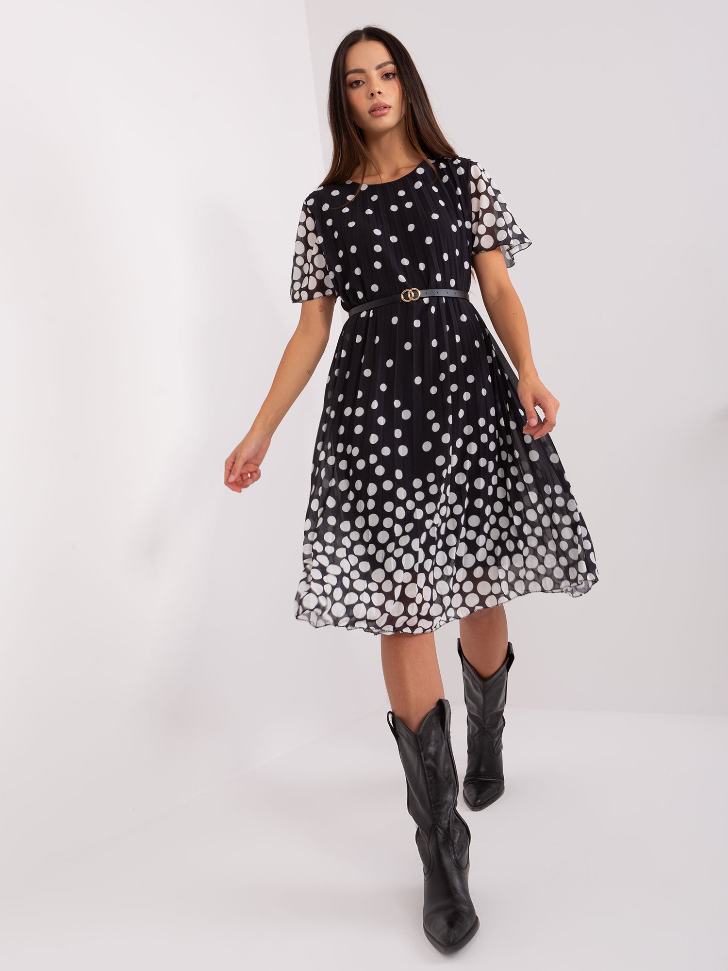 Czarno-biała rozkloszowana sukienka z paskiem .