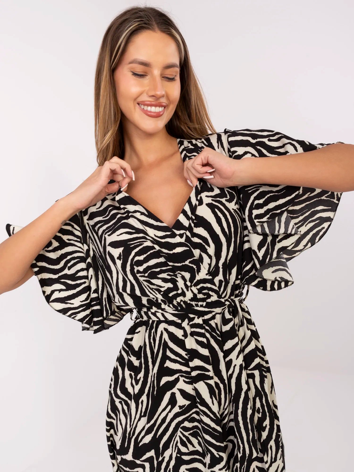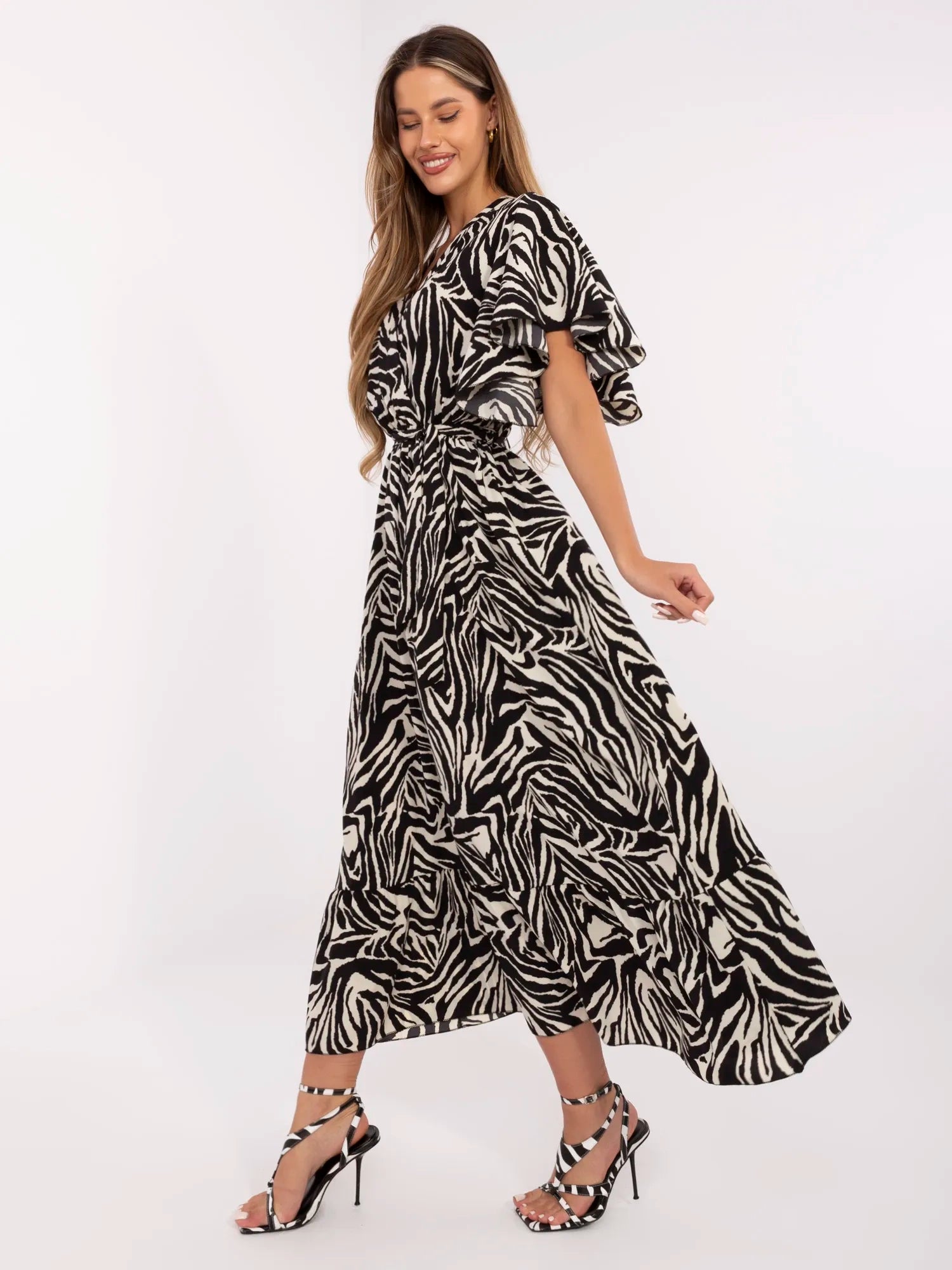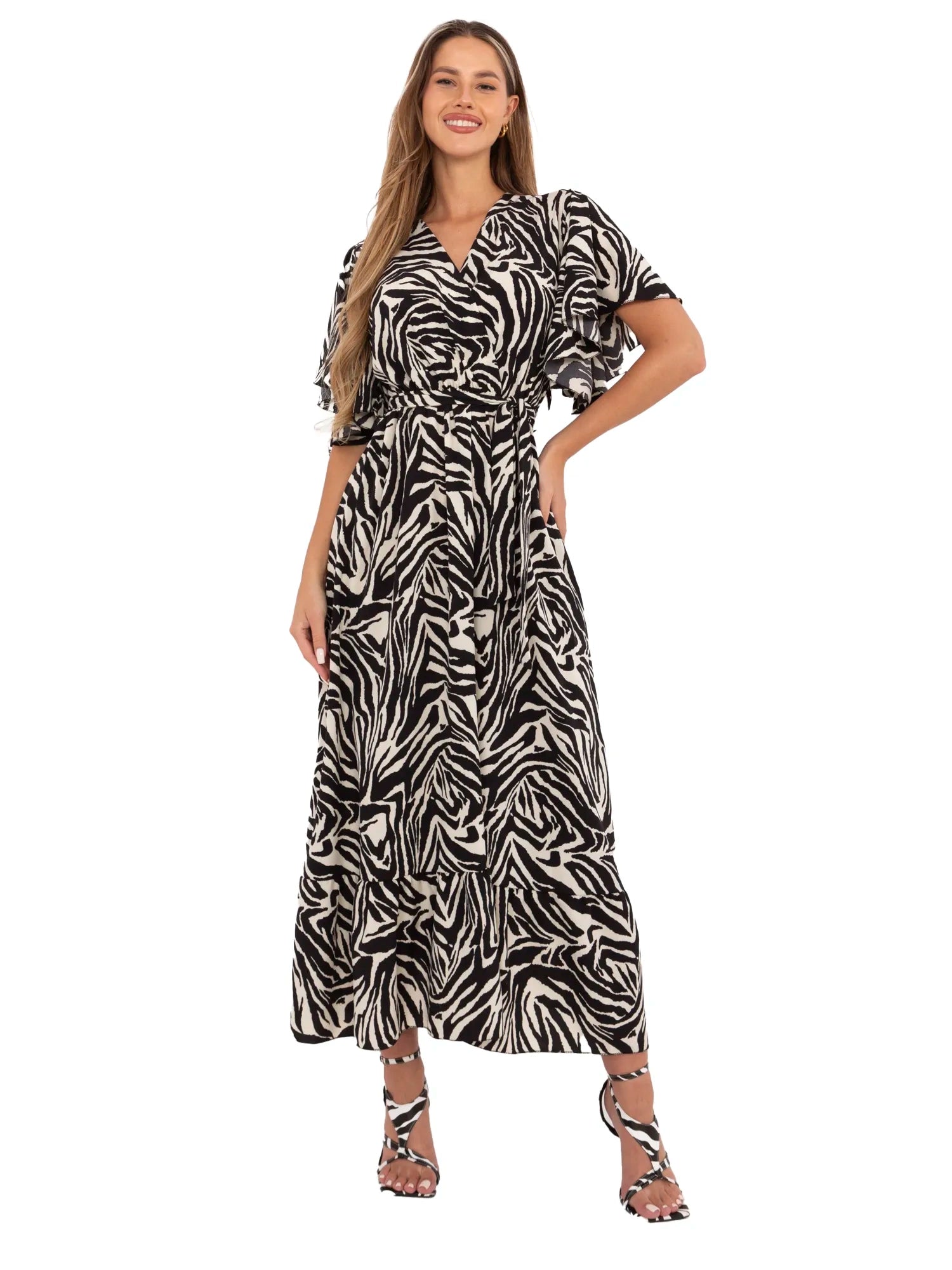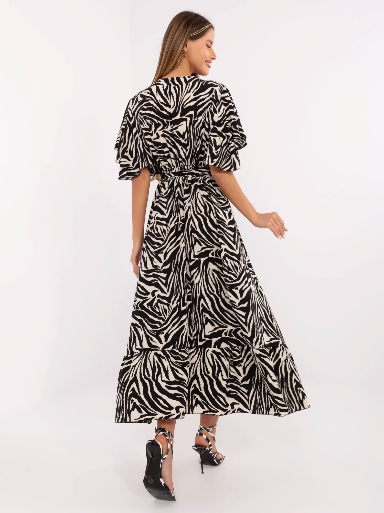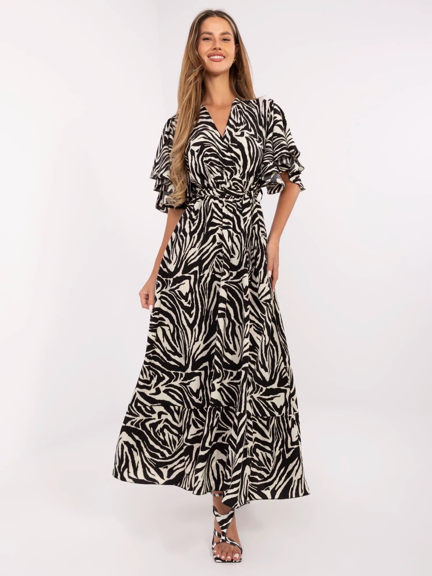 Wymiary sukienki w rozmiarze one size mierzone na płasko: szerokość pod pachami - 54 cm, szerokość w talii - 34 cm (na płasko), szerokość w talii - 62 cm ( po rozciągnięciu), długość rękawa - 26 cm, szerokość w biodrach - 68 cm, długość całkowita - 134 cm.
