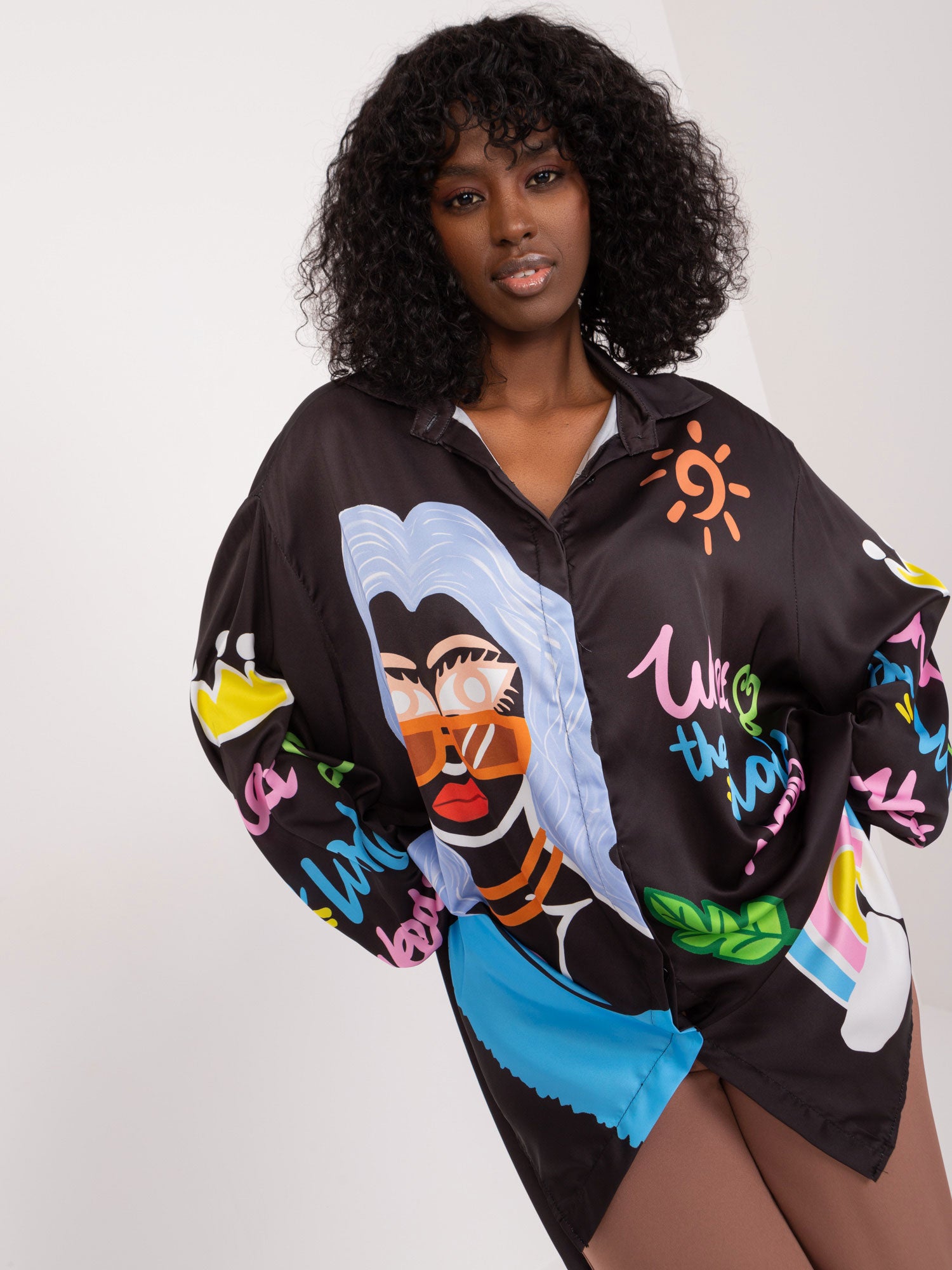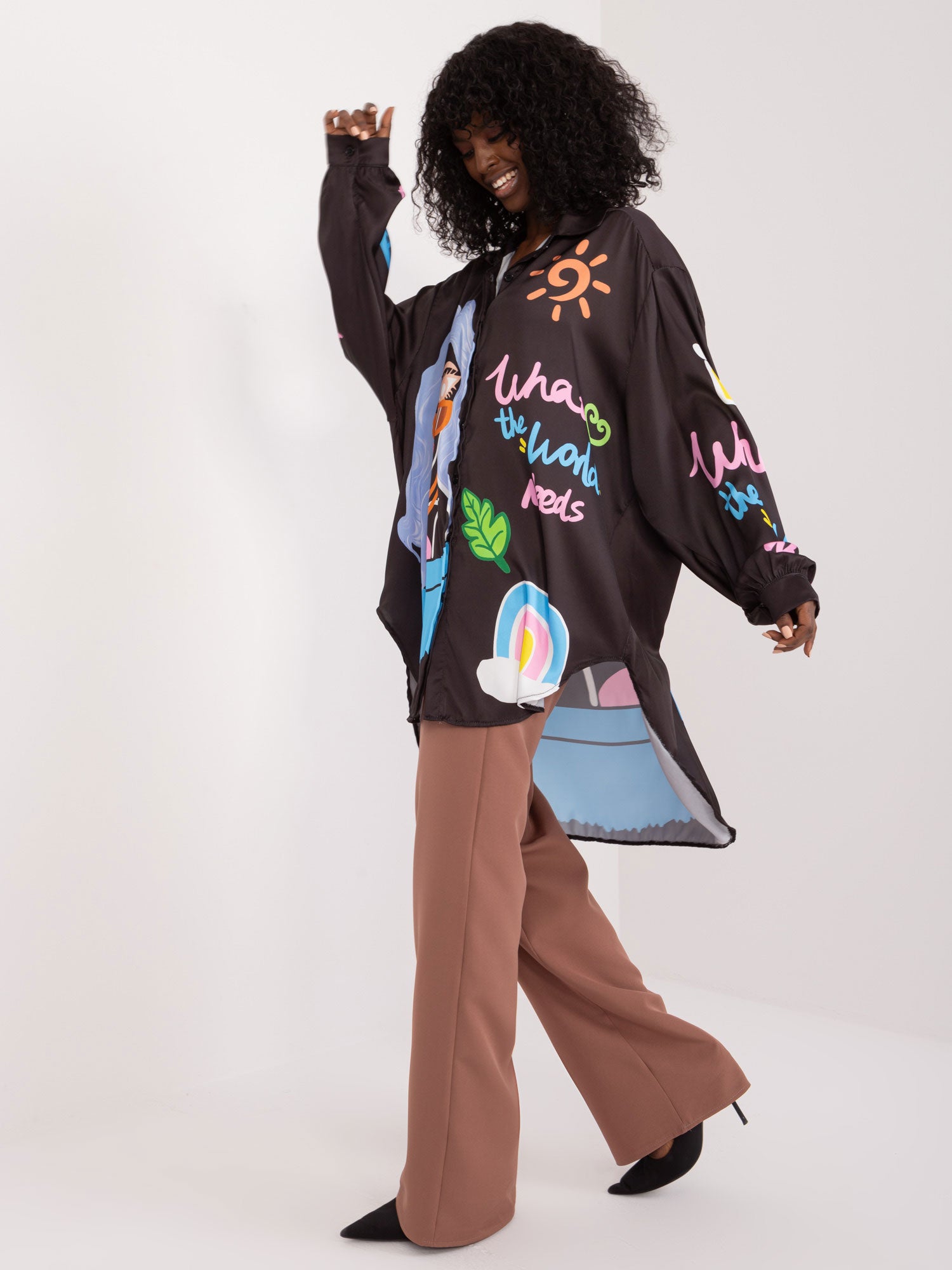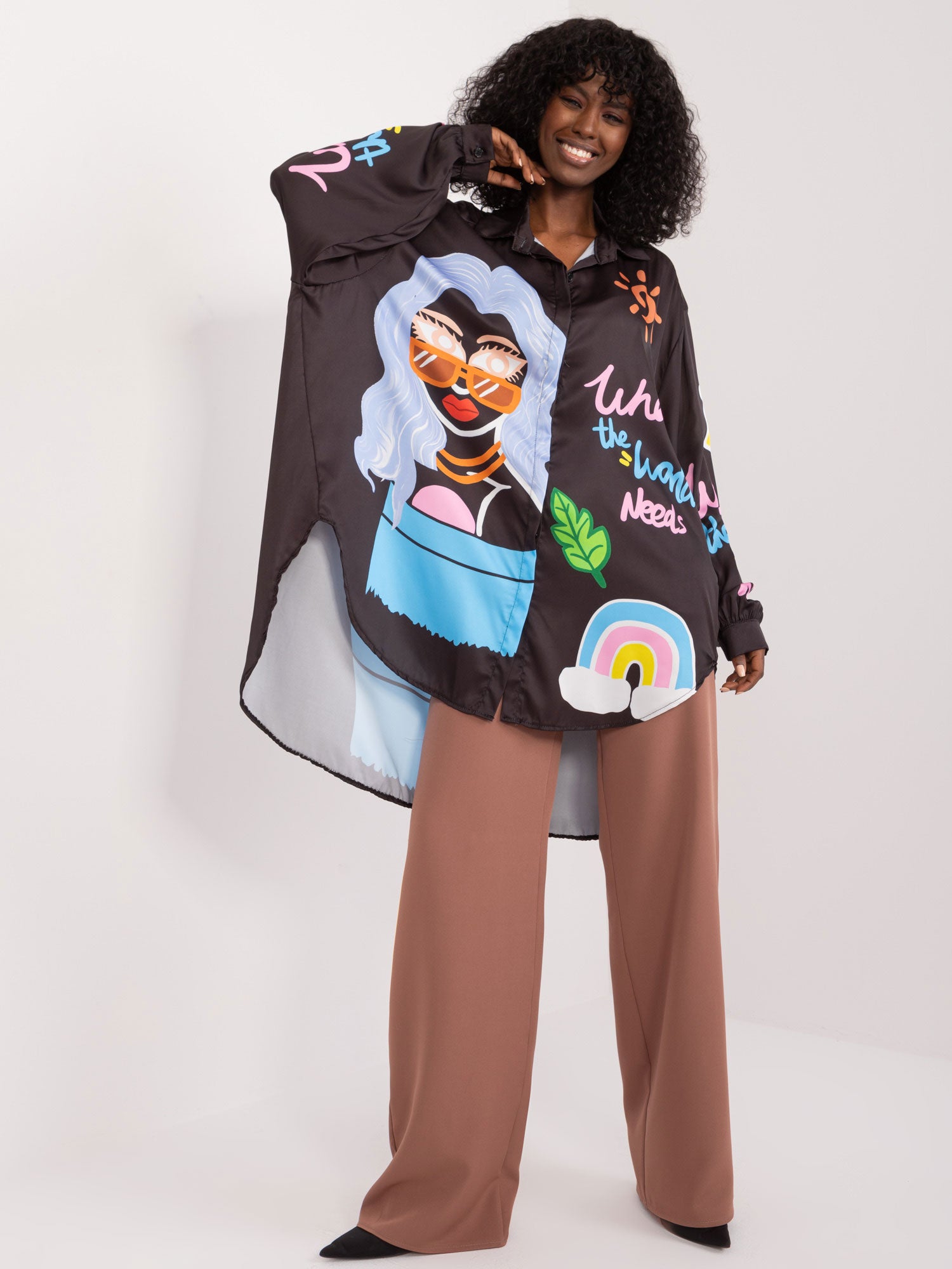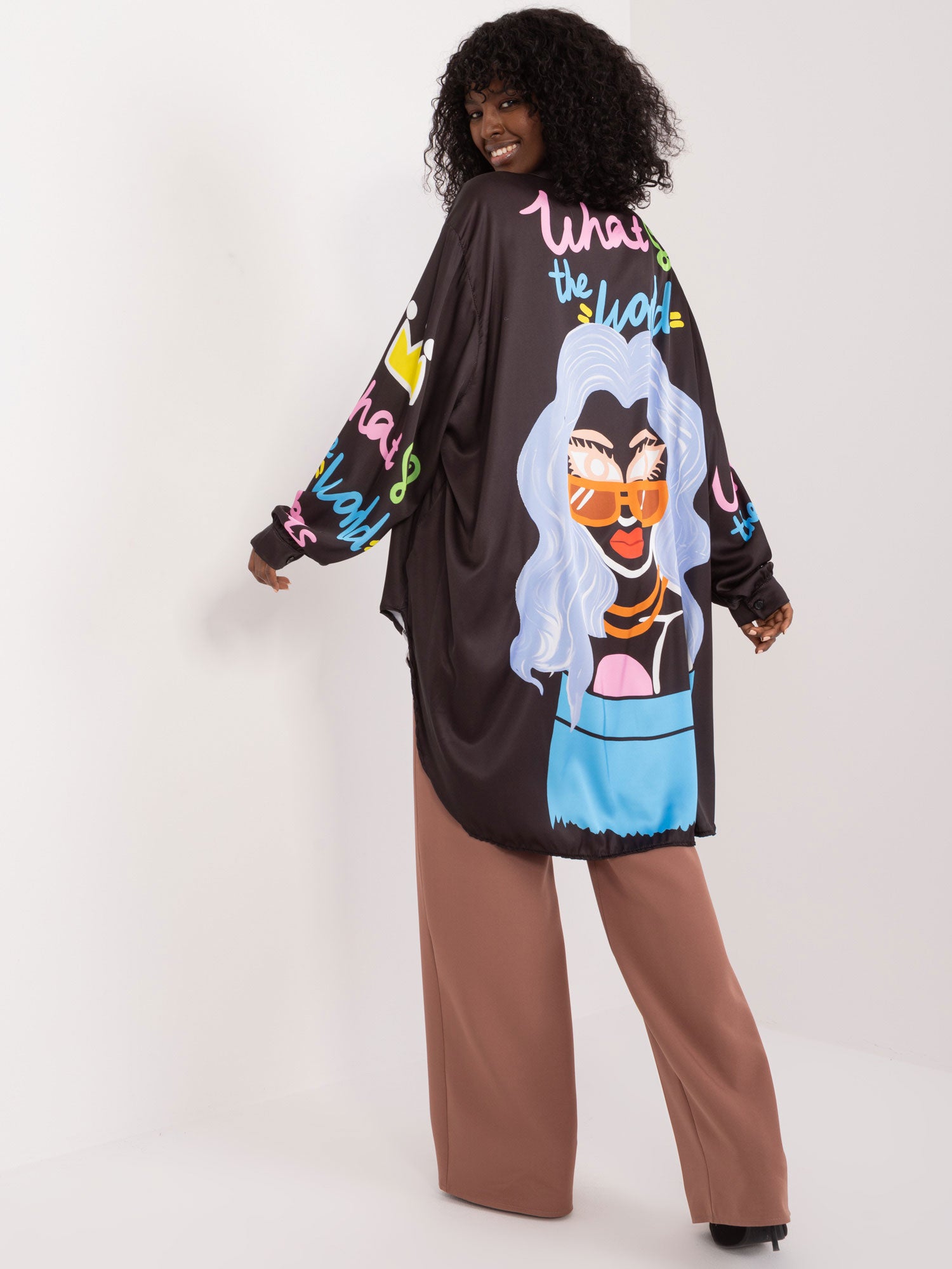 Wymiary koszuli w rozmiarze one size mierzone na płasko: szerokość pod pachami - 75 cm, długość rękawa - 64 cm, długość całkowita (przód) - 75 cm, długość całkowita (tył) - 95 cm