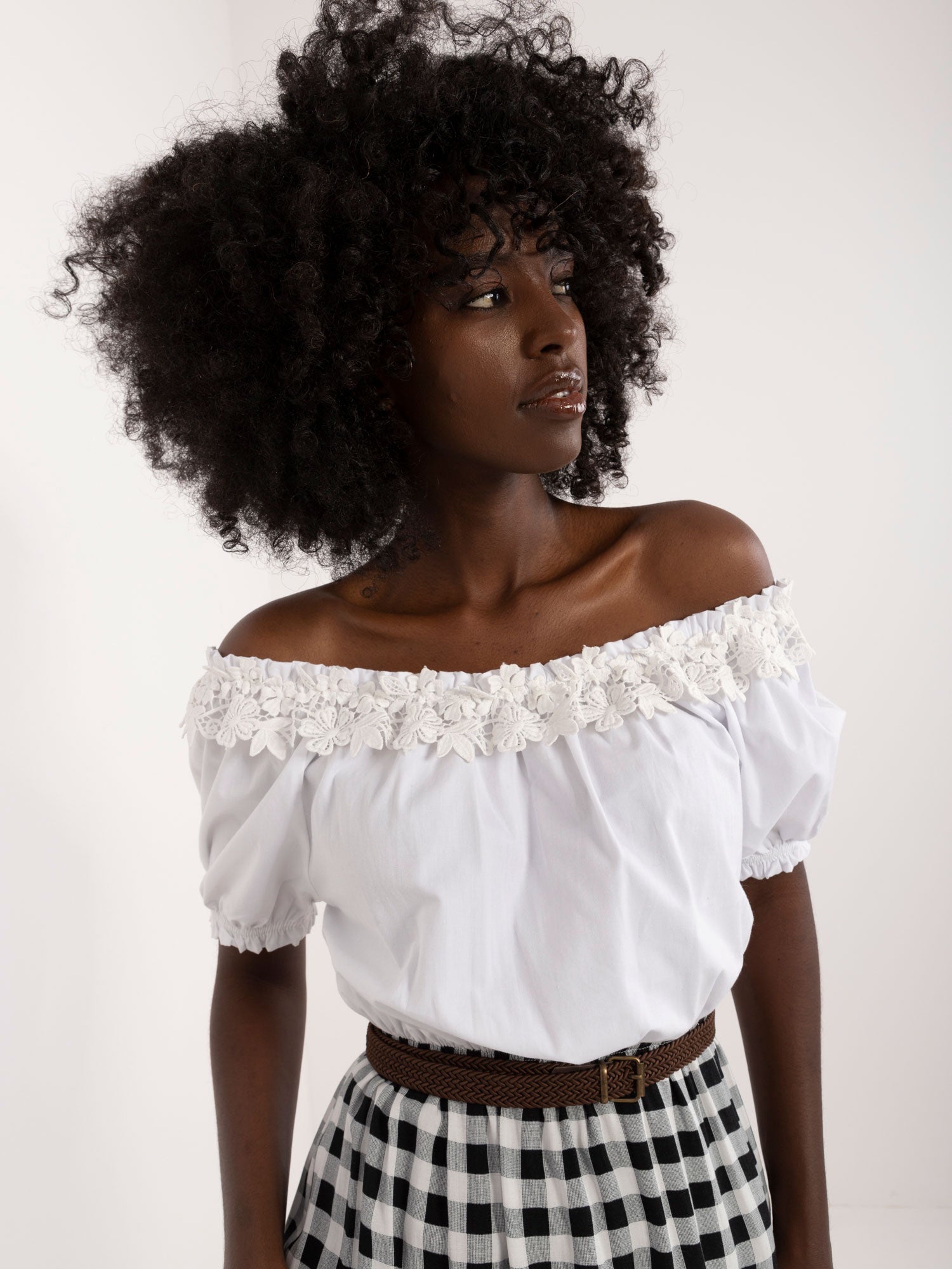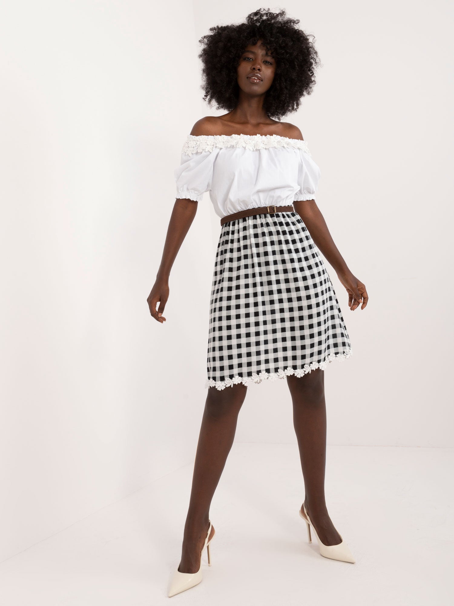 Modelka ma na sobie rozmiar 36. Wymiary modelki: wzrost 168 cm, biust 82 cm, talia 62 cm, biodra 93 cm.