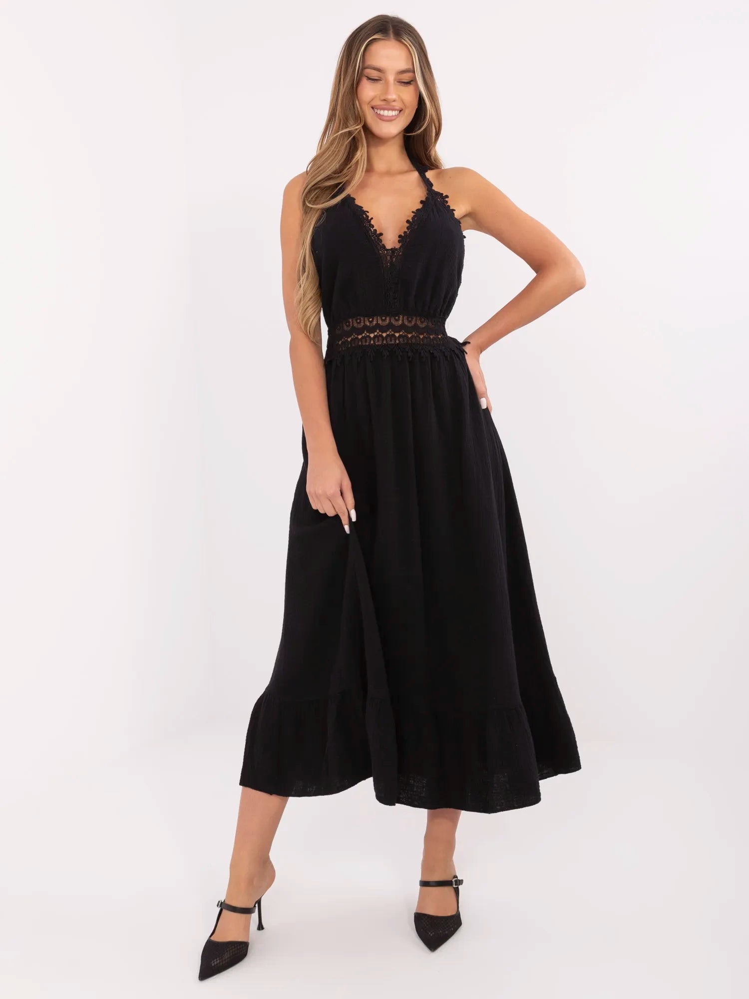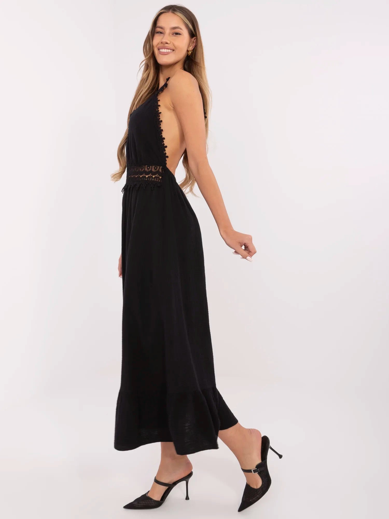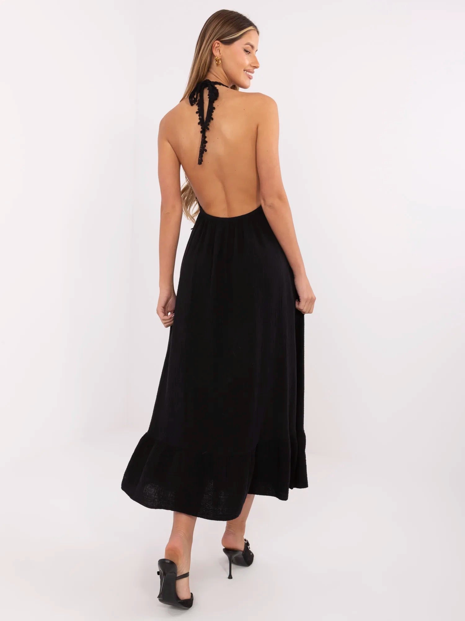Wymiary sukienka w rozmiarze one size mierzone na płasko: szerokość pod pachami - 45 cm, szerokość w talii - 34 cm, szerokość w biodrach - 61 cm, długość całkowita - 122 cm (bez wiązania), długość wiązania - 72 cm.