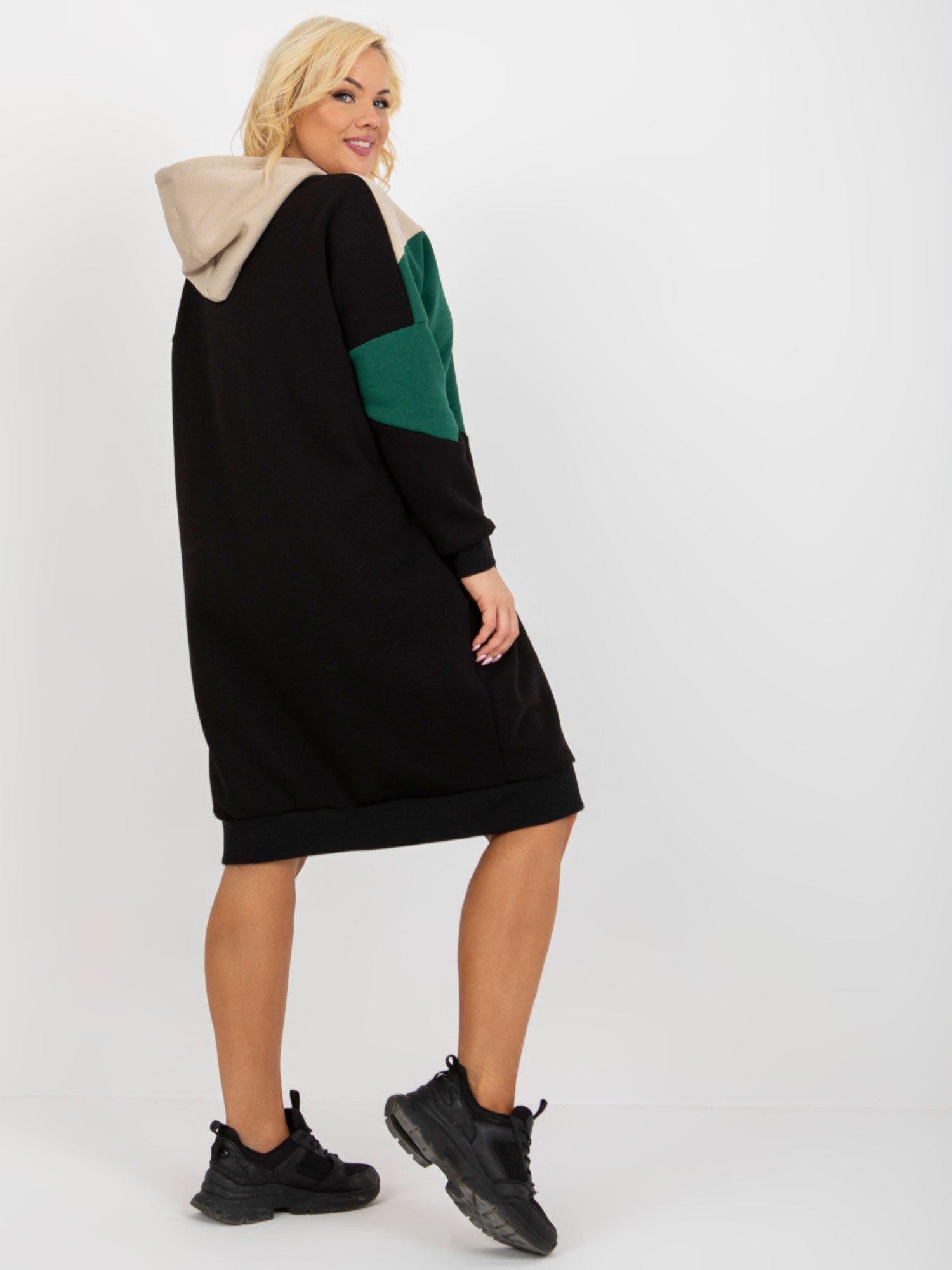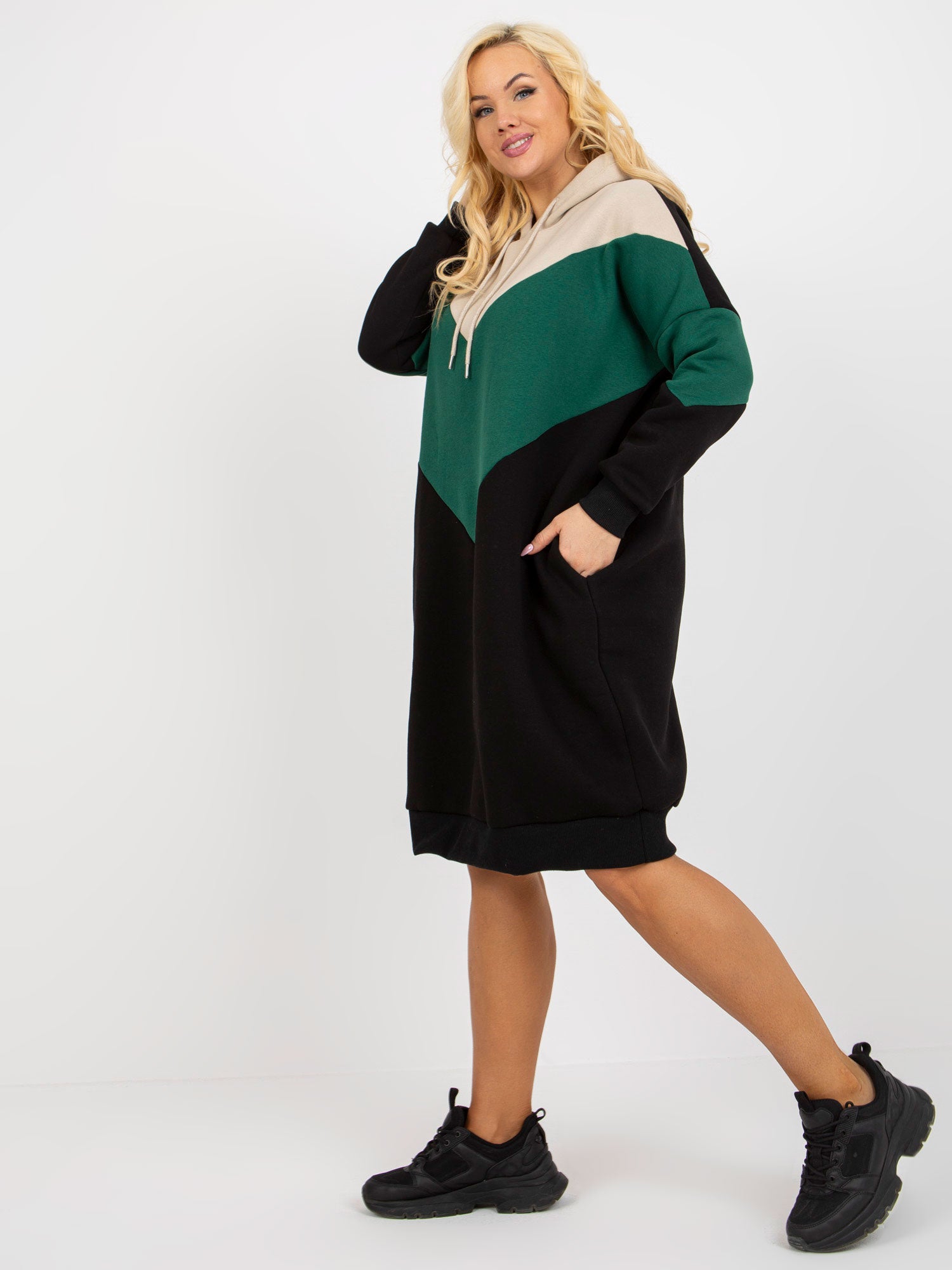Beżowo-ciemnozielona dresowa sukienka plus size basic z kapturem .