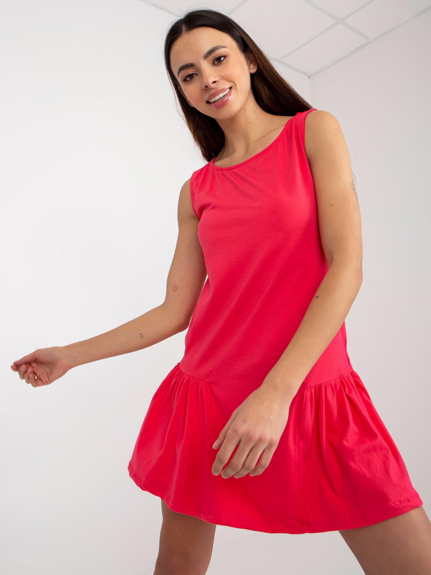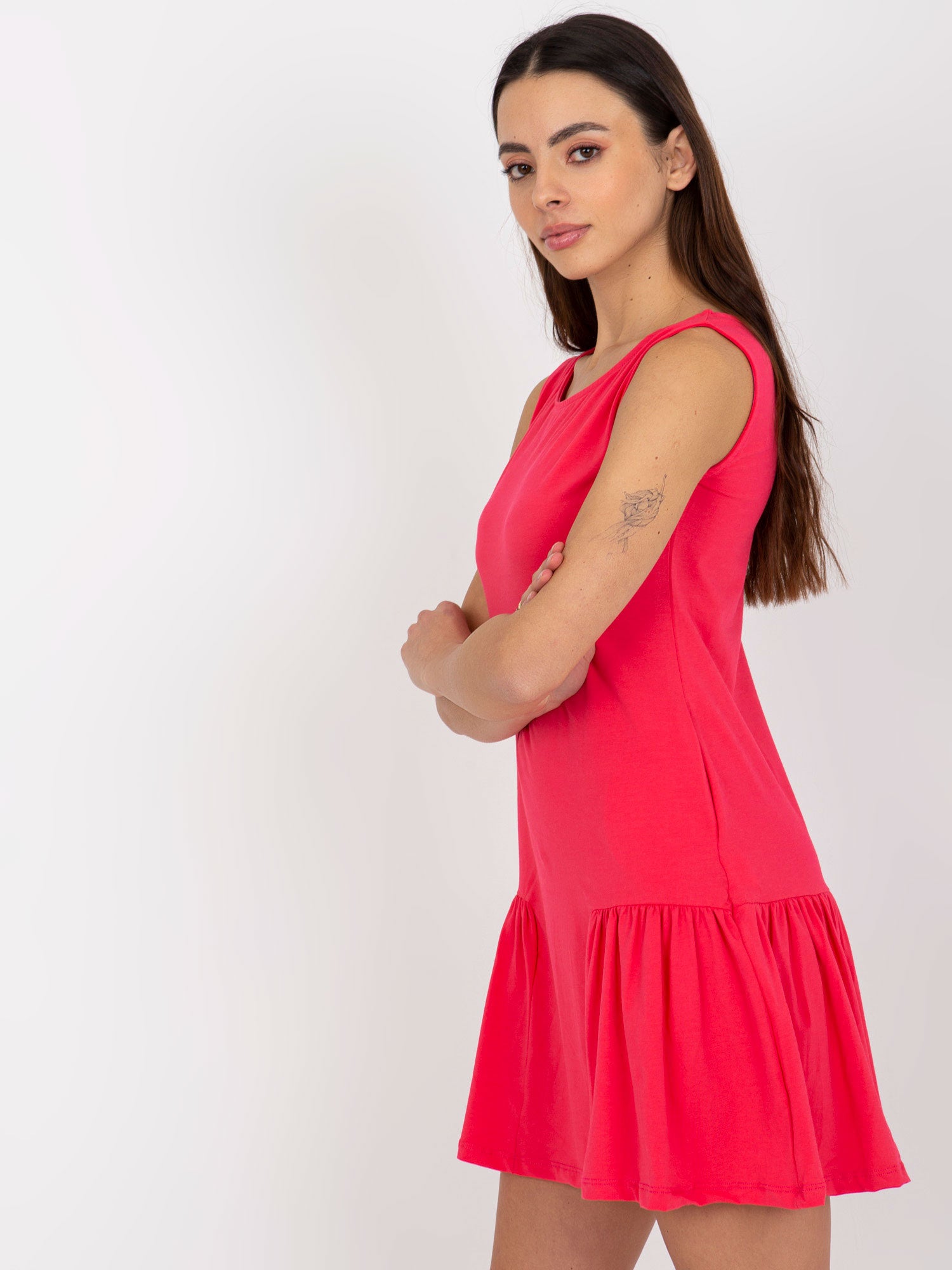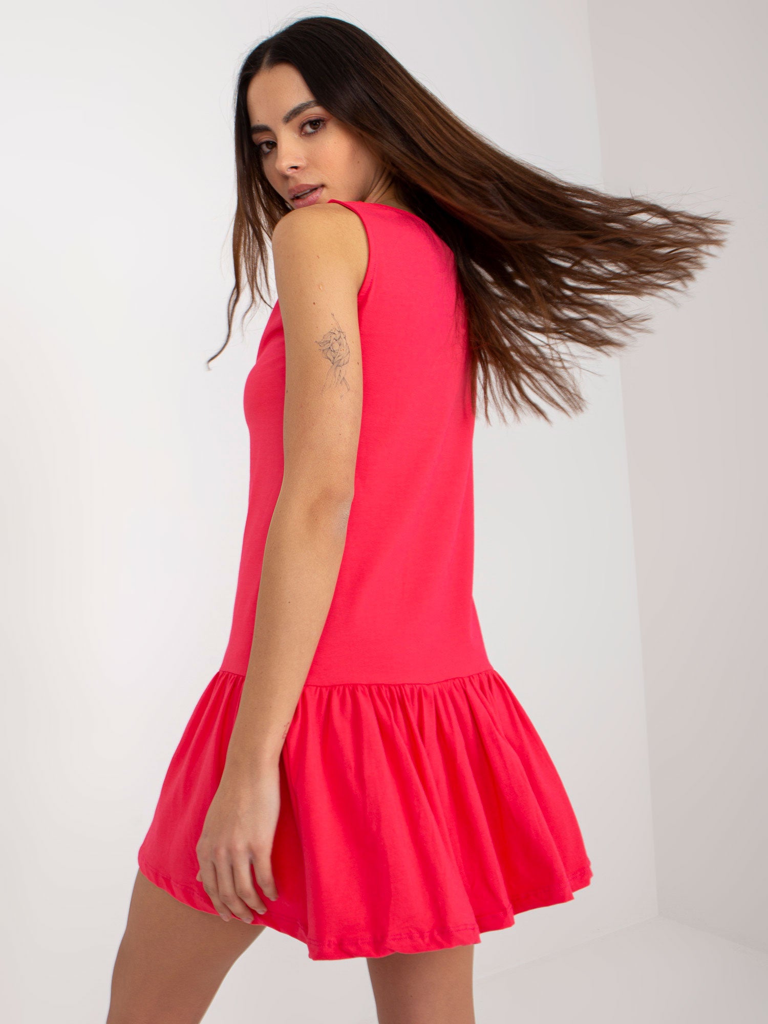 Koralowa mini sukienka basic z falbaną bez rękawów .