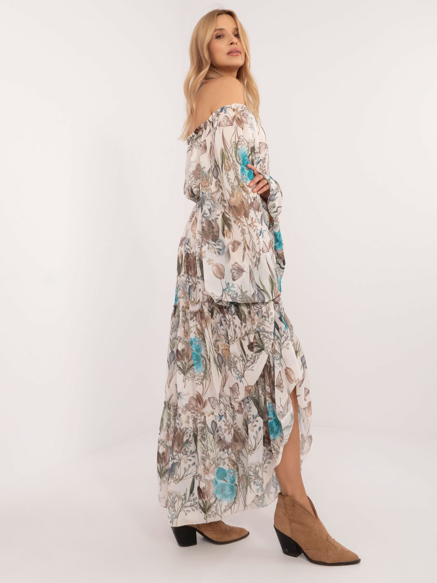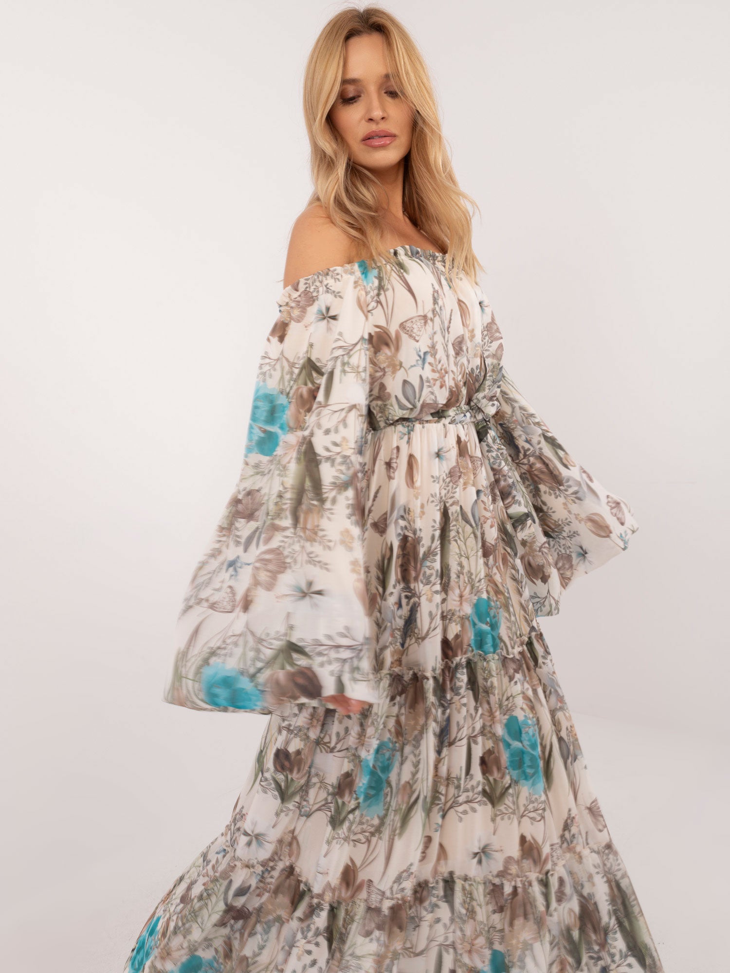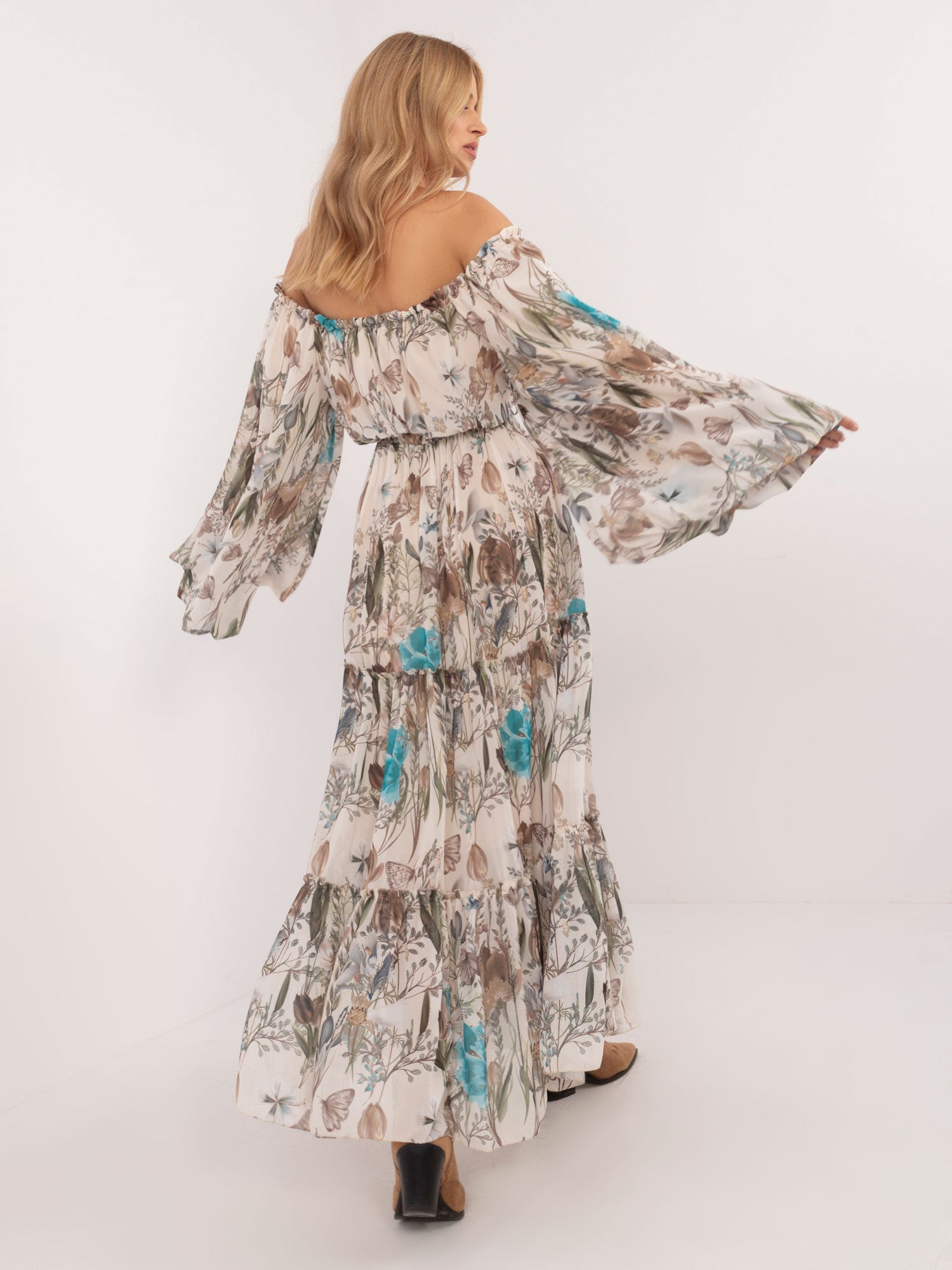 Wymiary sukienki w rozmiarze one size mierzone na płasko: szerokość pod pachami - 45 cm, długość rękawa - 61 cm, długość całkowita - 122 cm.