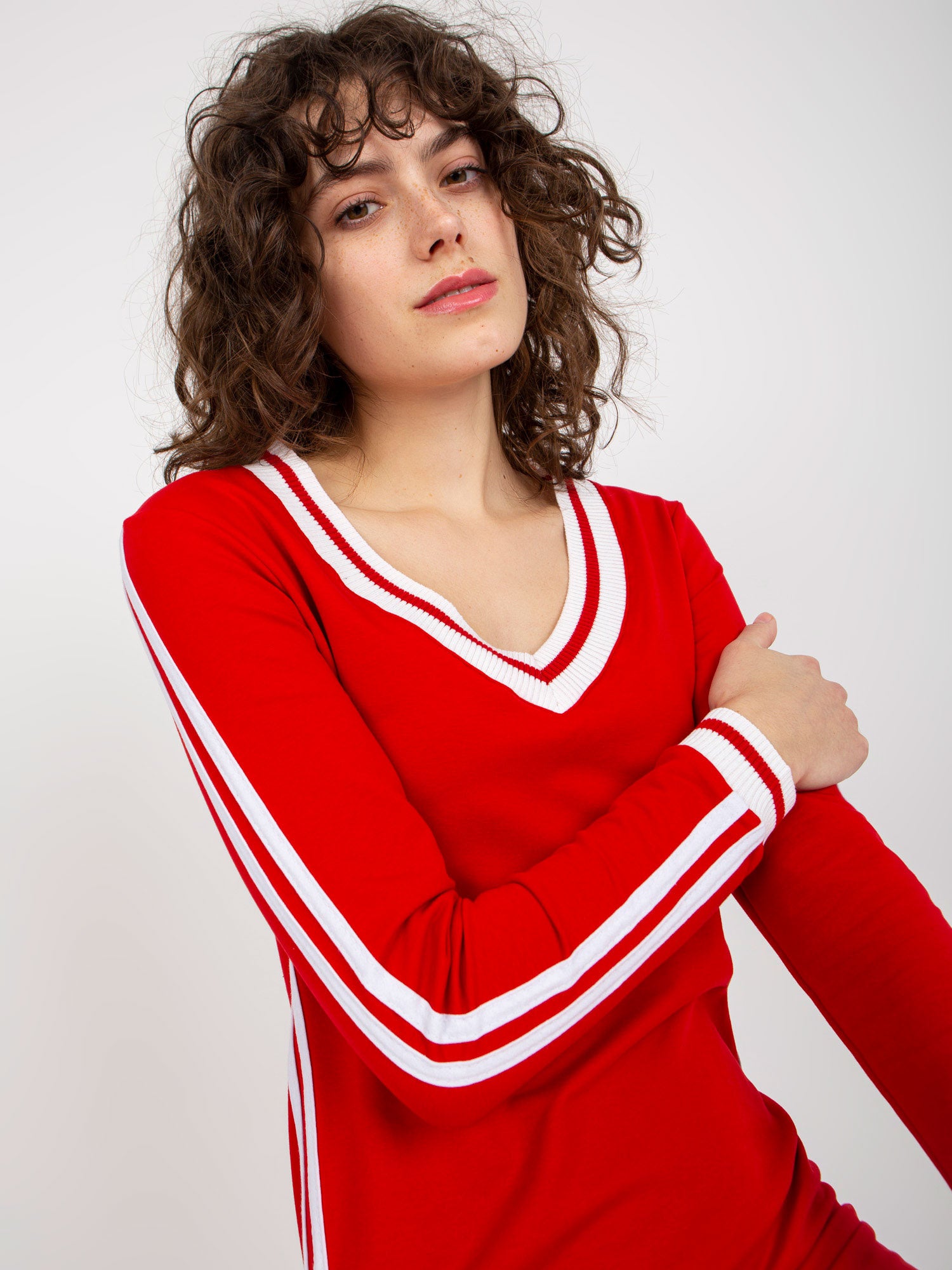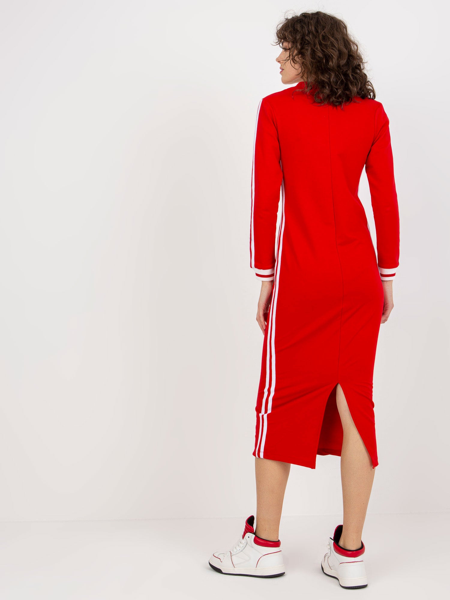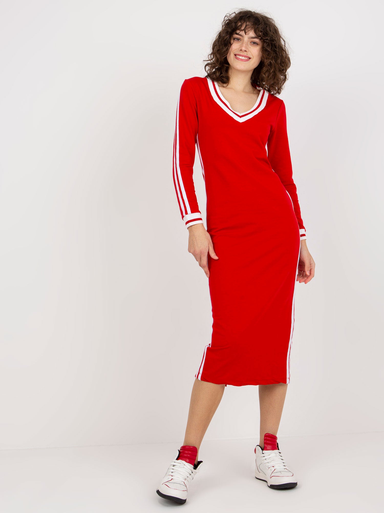 Czerwona midi sukienka dresowa z dekoltem w serek .