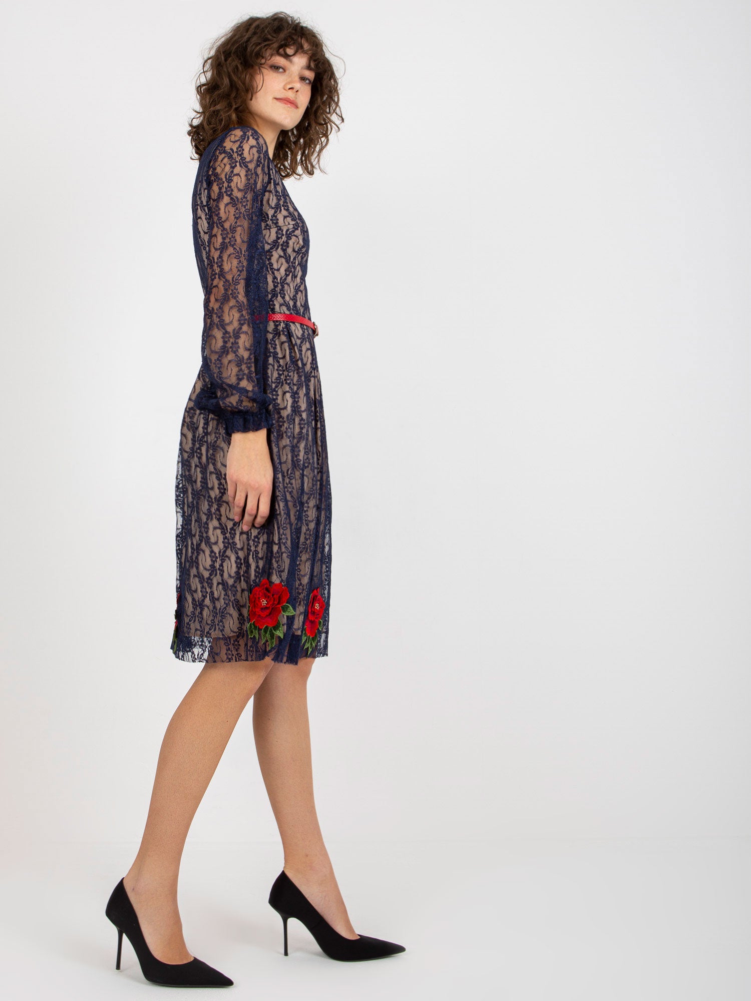 Granatowa koronkowa sukienka koktajlowa z naszywkami .