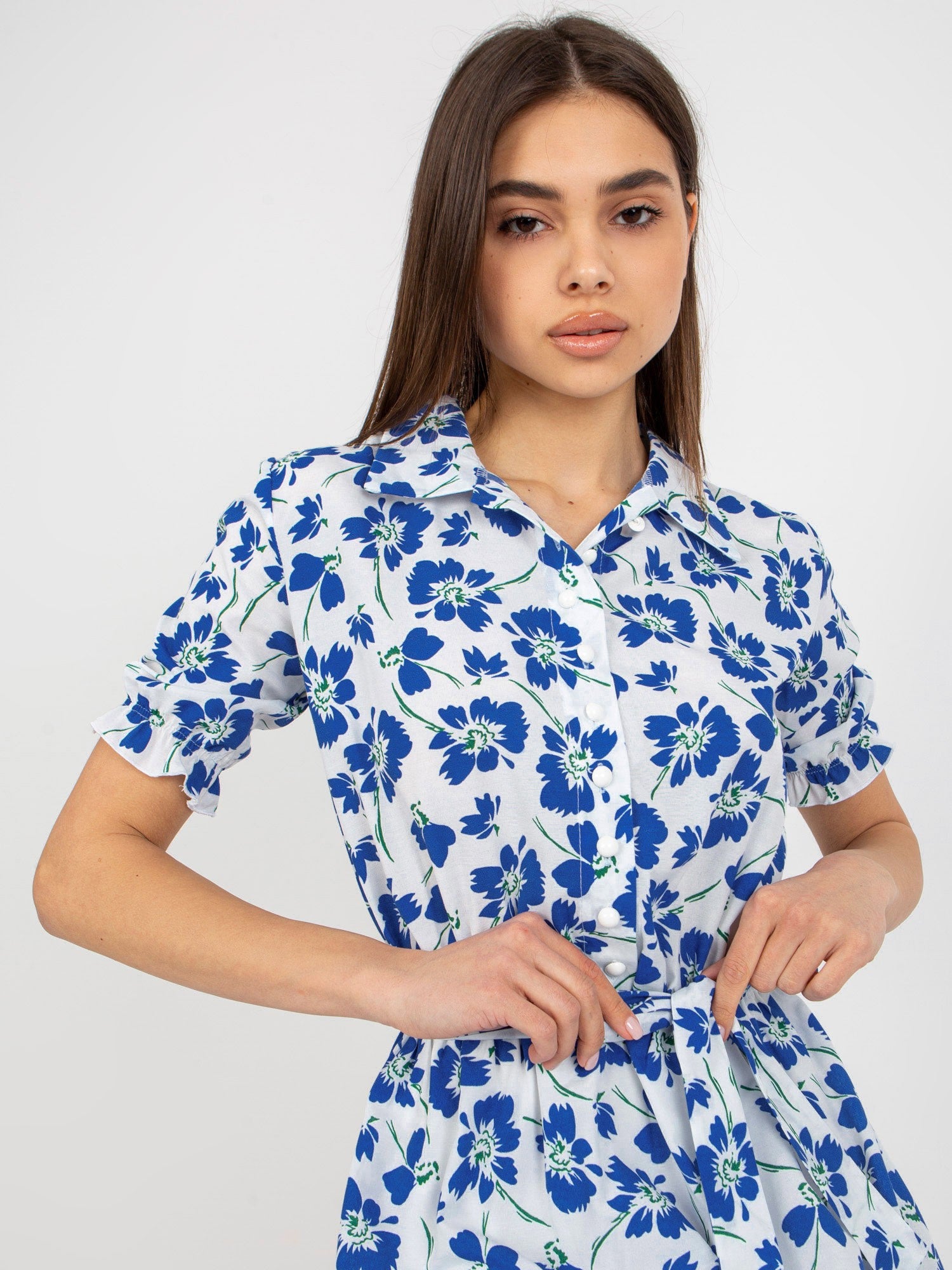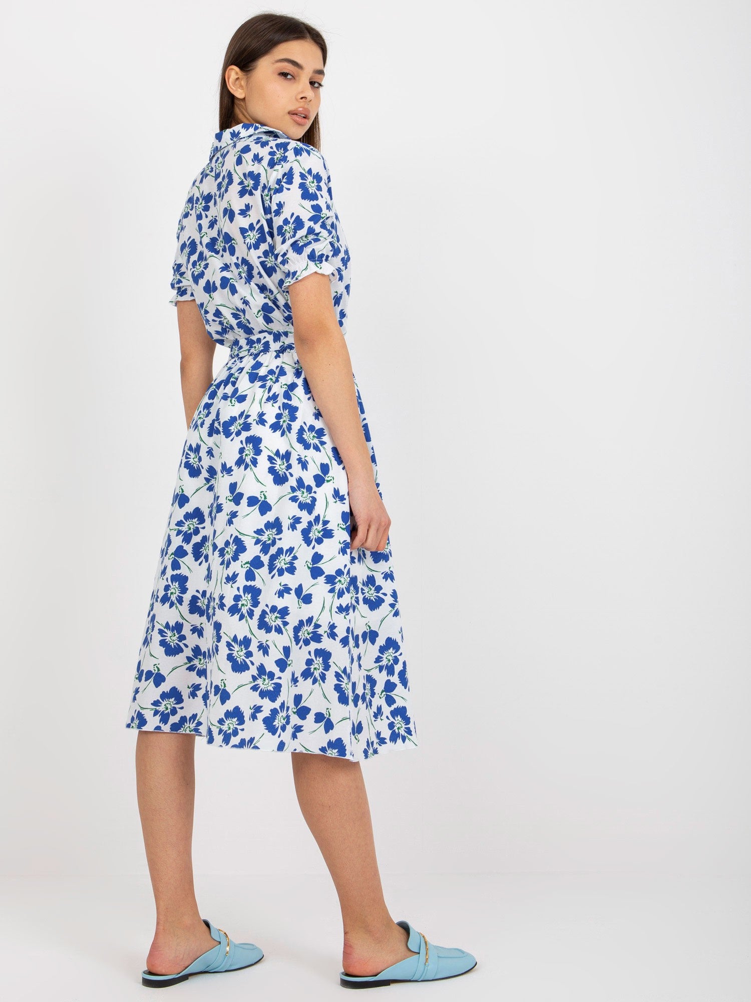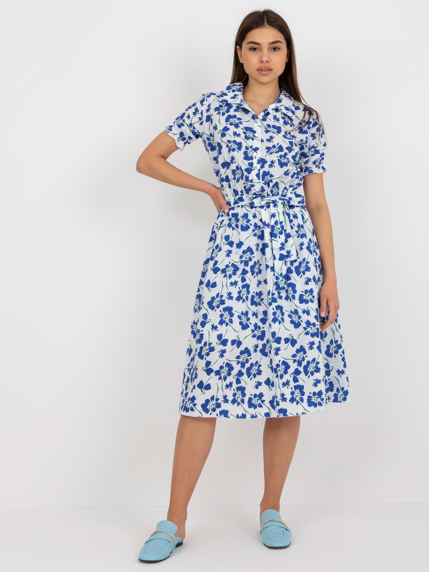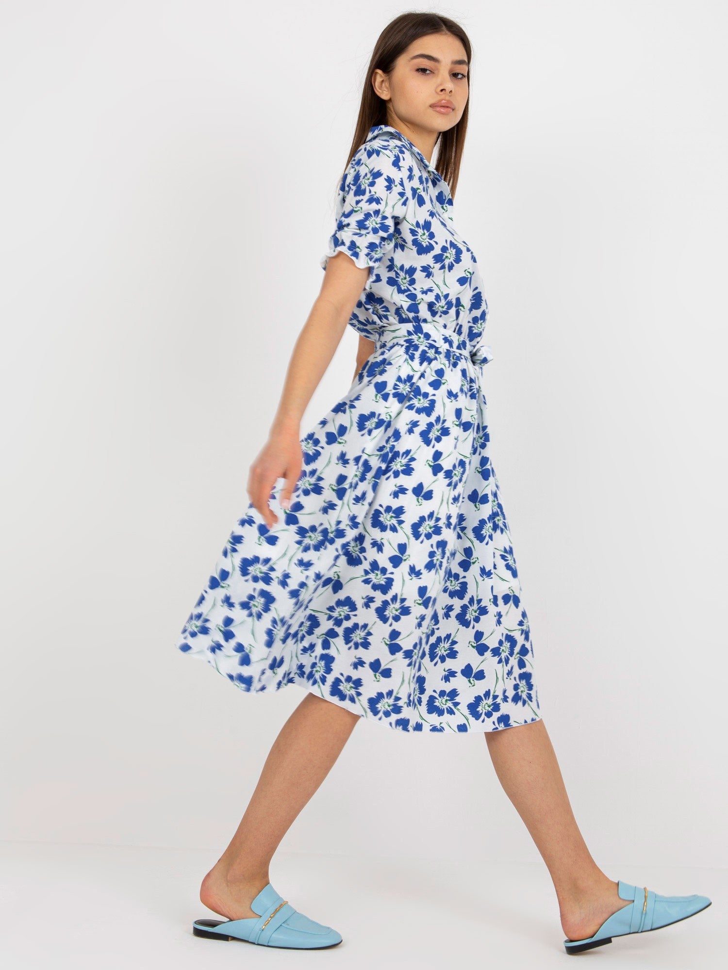 Biało-ciemnoniebieska rozkloszowana sukienka w kwiaty z paskiem .
