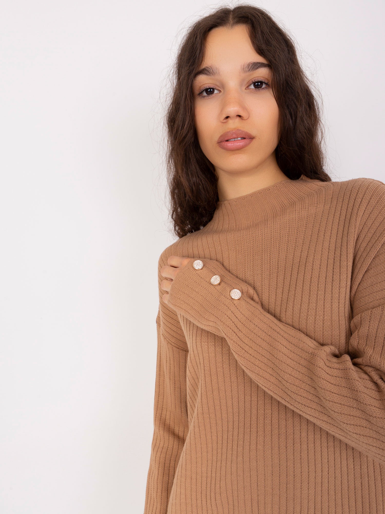 Camelowa sukienka dzianinowa z guzikami przy rękawach .