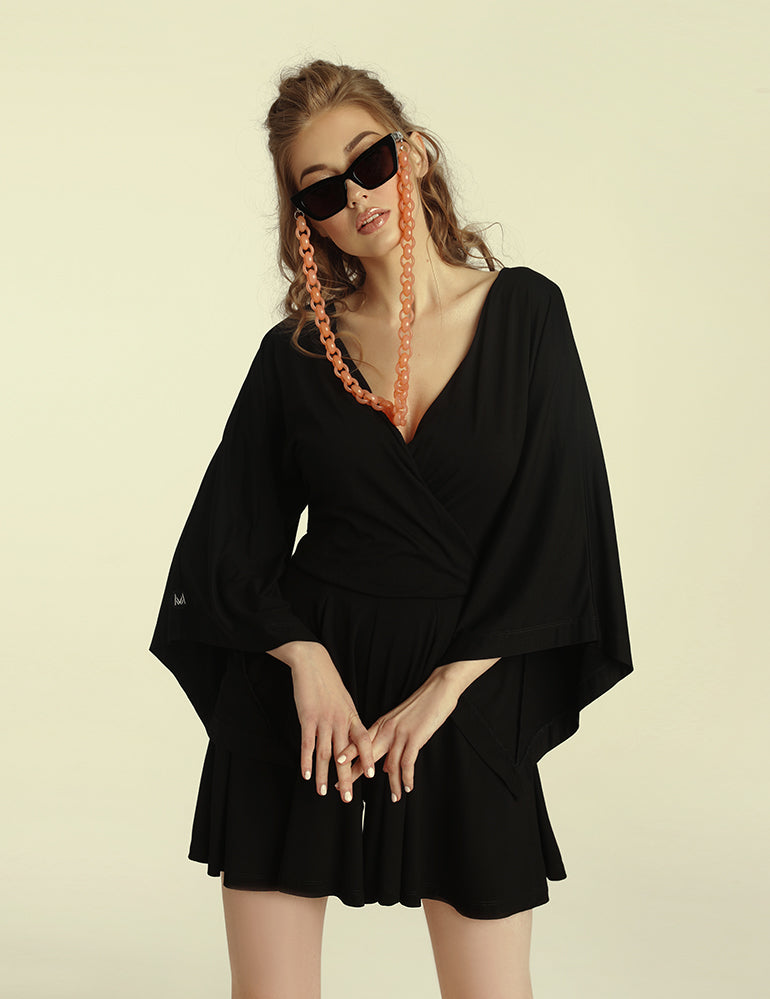 Kombinezon z luźną, kopertową górą i kimonowymi rękawami. Rozszerzane nogawki sięgają przed kolano. Kombinezon ma gumke w talii i kieszenie w szwach bocznych.