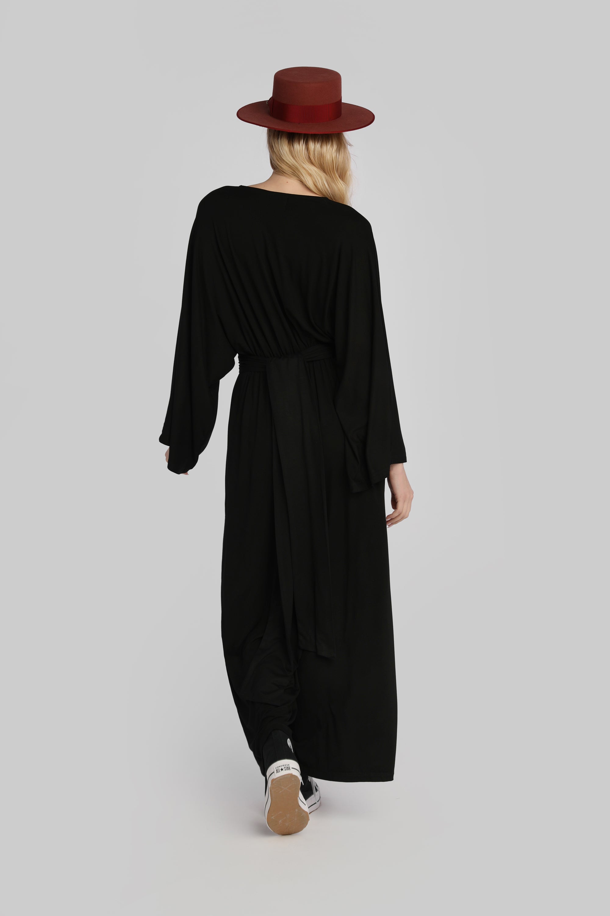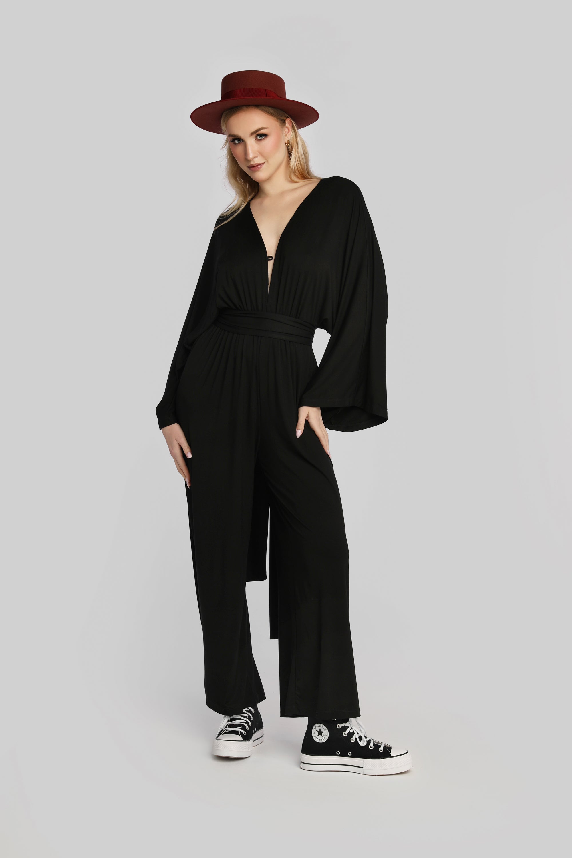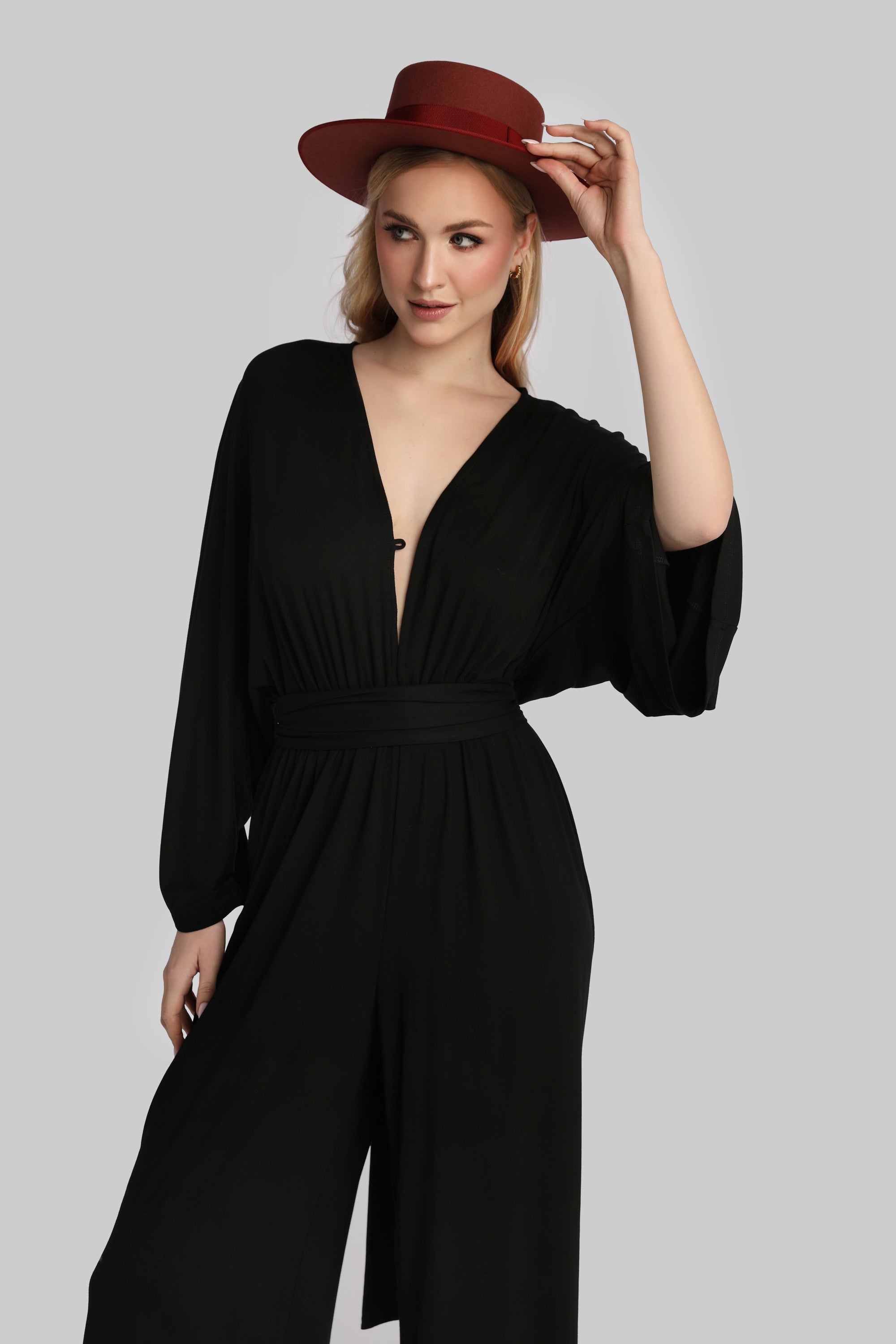 Luźny kombinezon marszczony w talii z szerokimi rękawami typu kimono oraz nogawkami o długości przed kostkę. Dekolt V-neck jest regulowany wszytymi po wewnętrznej stronie guziczkami – może być głęboki aż do samej talii lub zapięty na tyle wysoko, że zasłoni biustonosz. Do kombinezonu dołączony jest pasek o szerokości 10cm, który można wiązać i stylizować na różne sposoby. Model z kieszeniami.