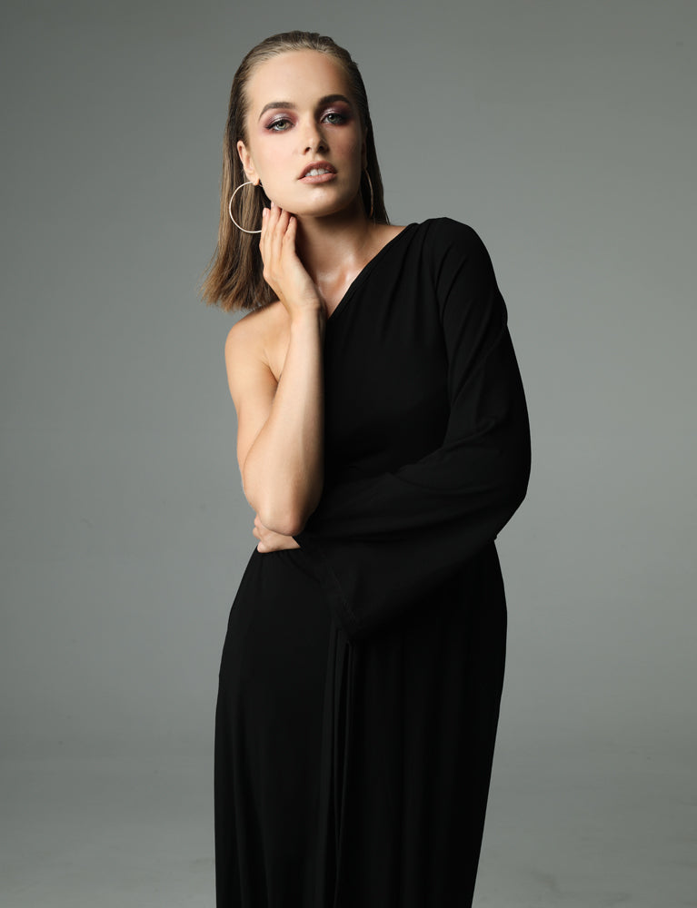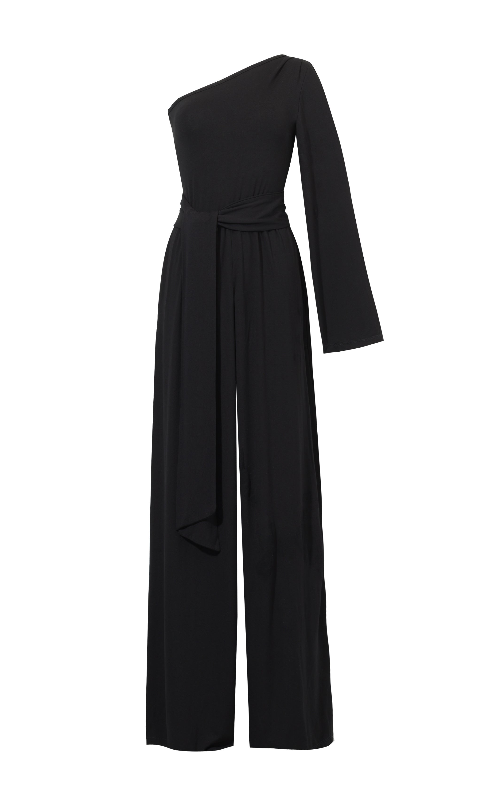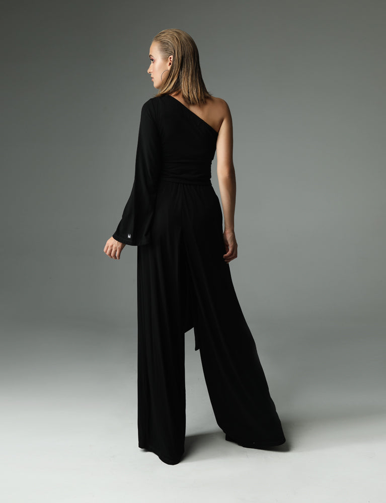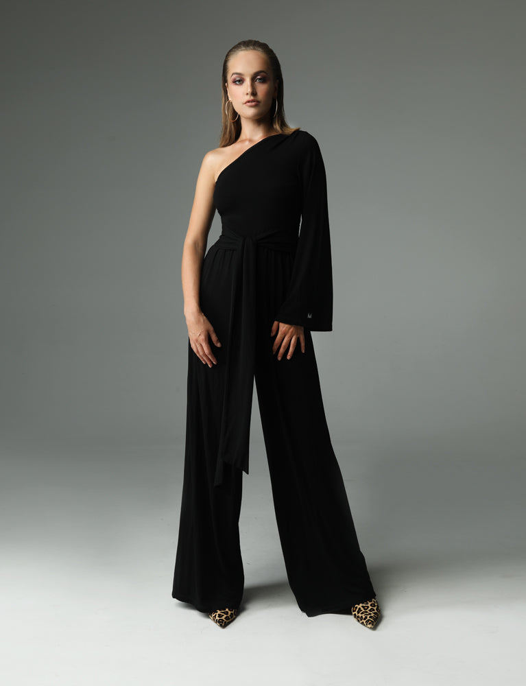 Kombinezon na jedno ramię z szerokimi stylowymi nogawkami i szerokim rękawem. Ma kieszenie w szwach bocznych i pasek w zestawie.