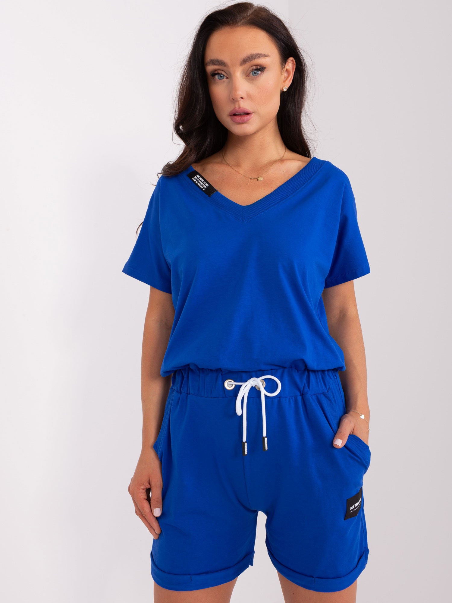 Kobaltowy damski kombinezon z krótkim rękawem .
