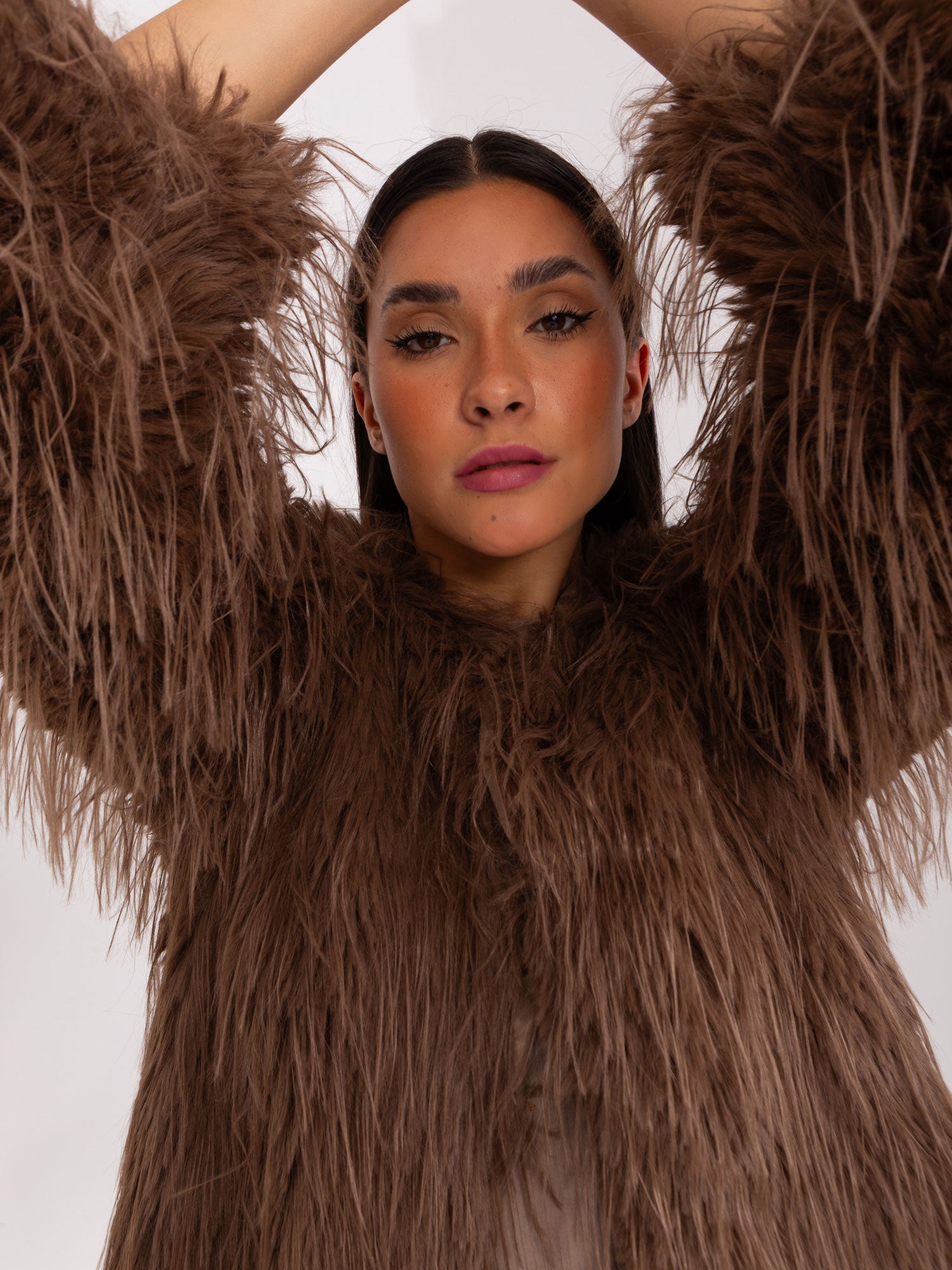 Brązowa futrzana kurtka przejściowa z kieszeniami .