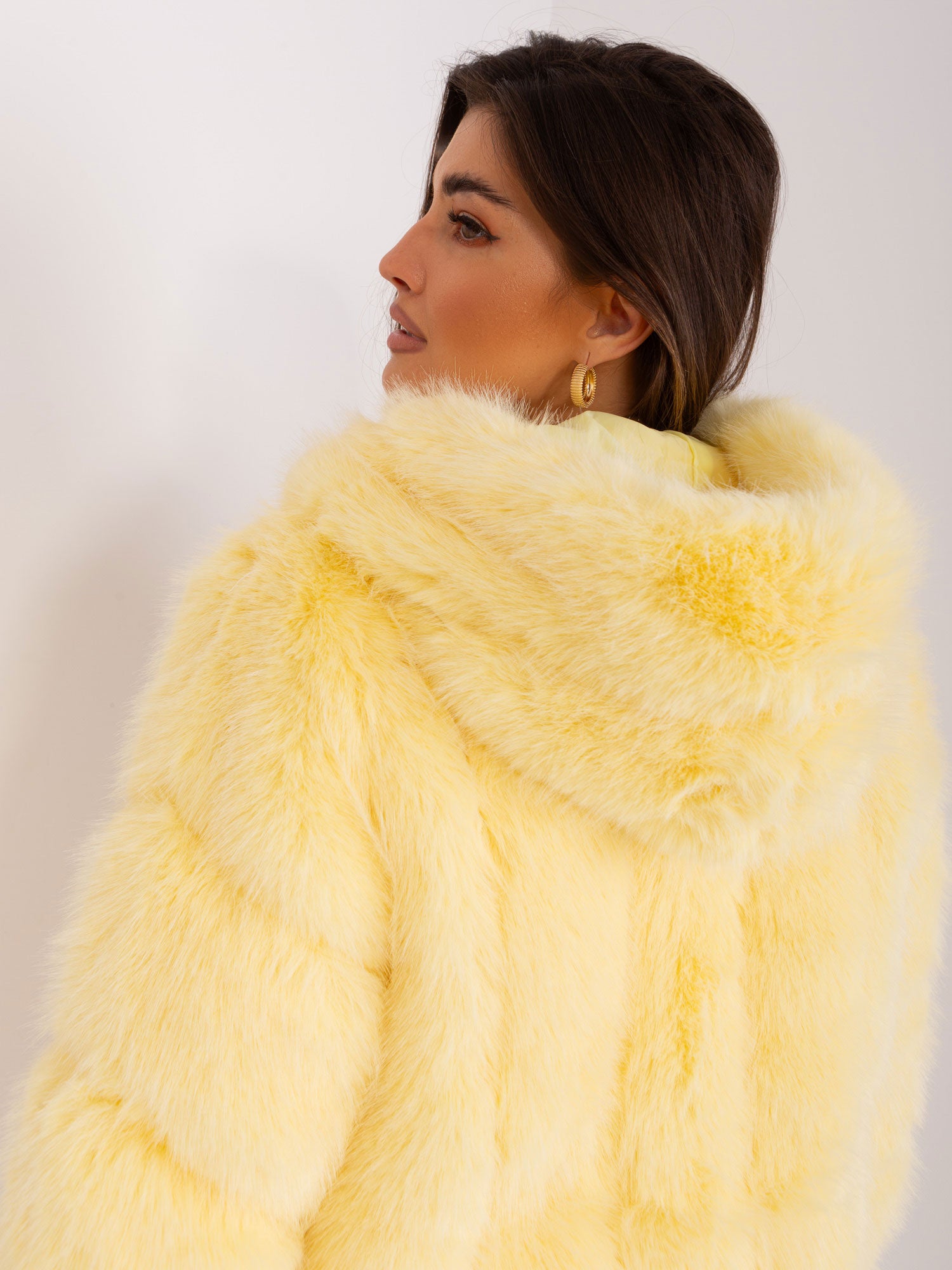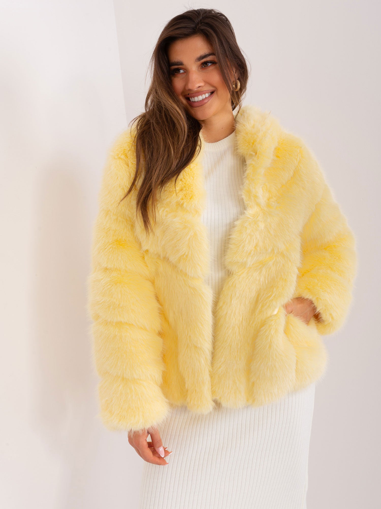 Jasnożółta kurtka futrzana z zapięciem na haftki.