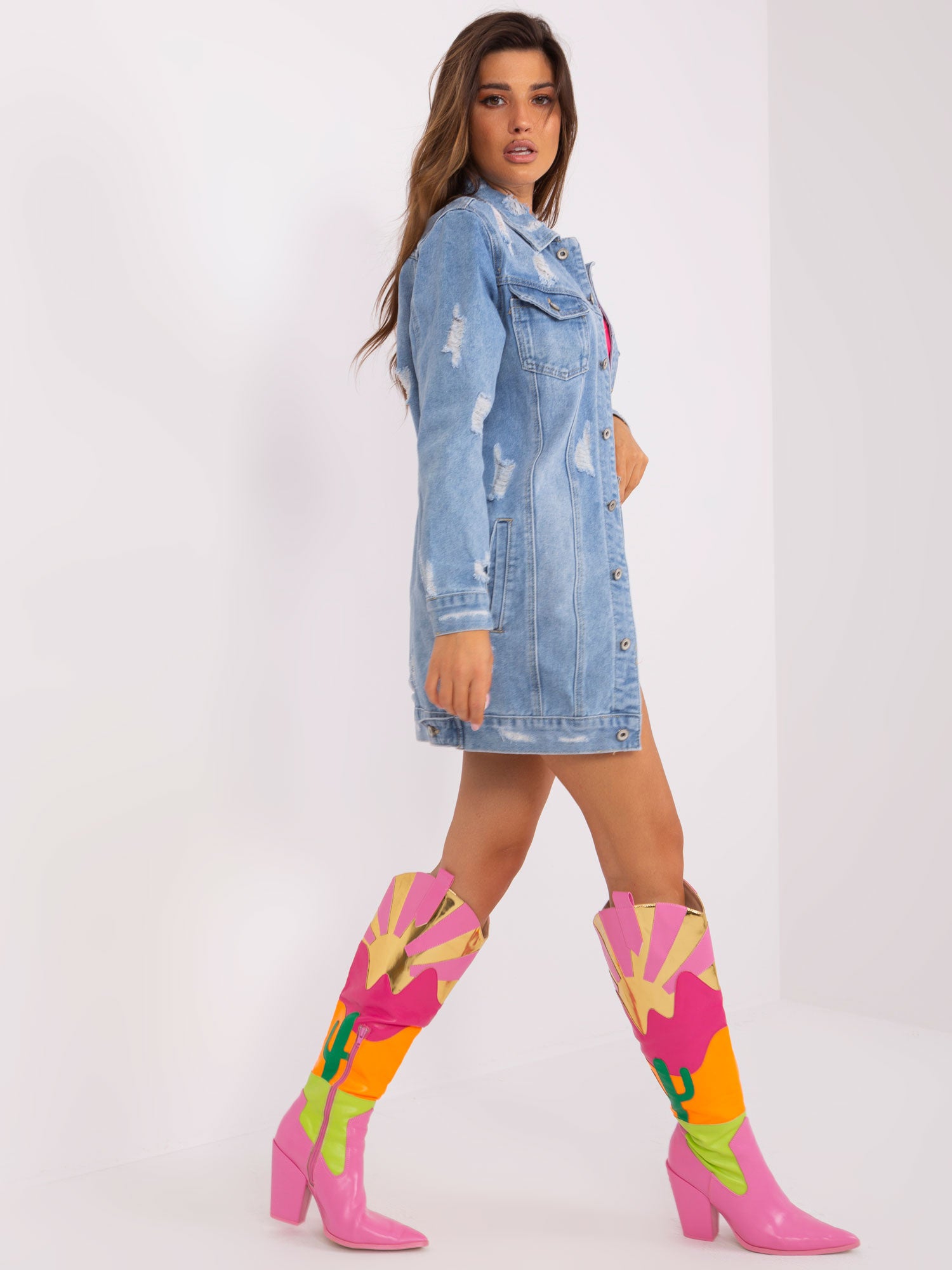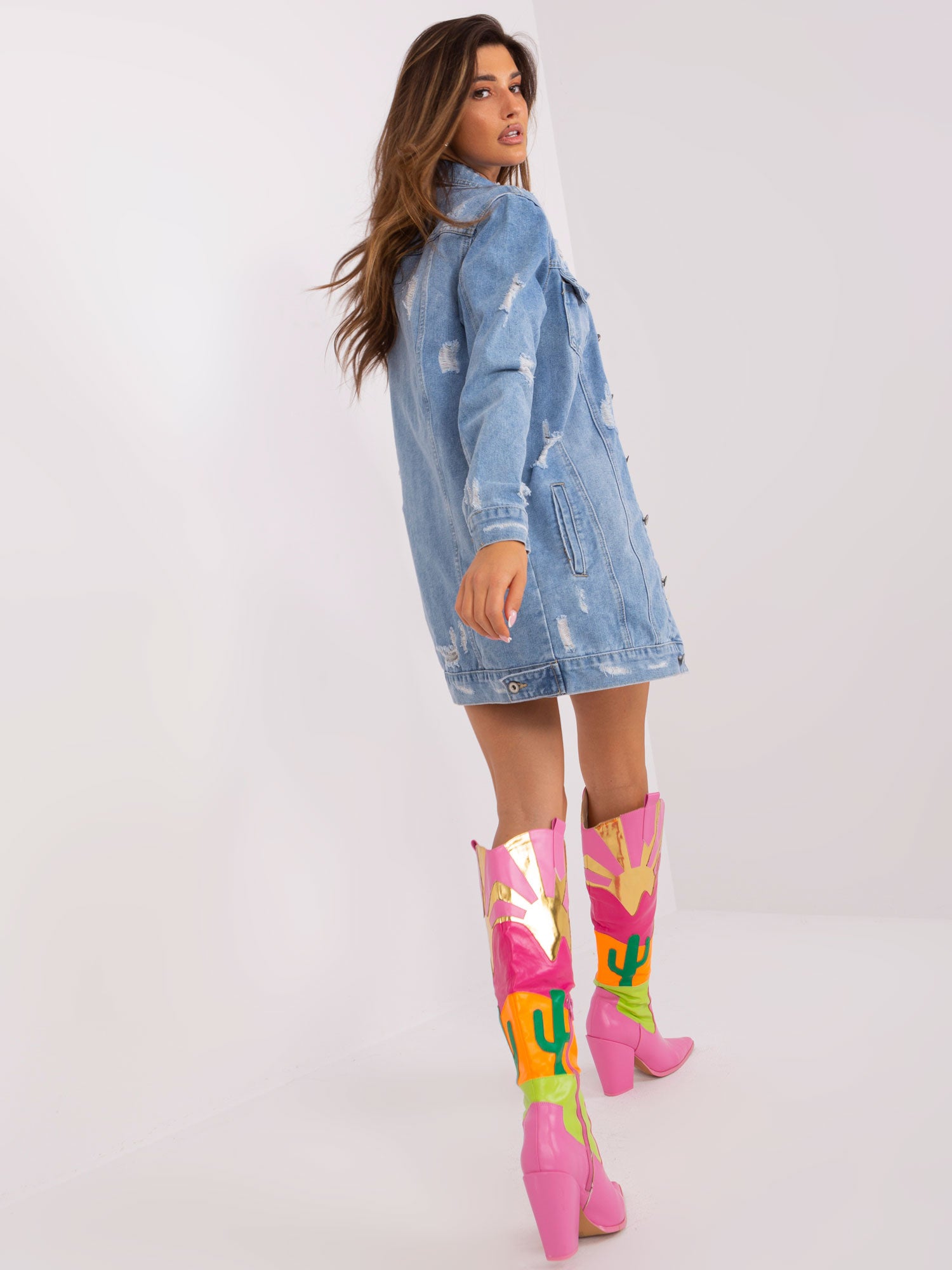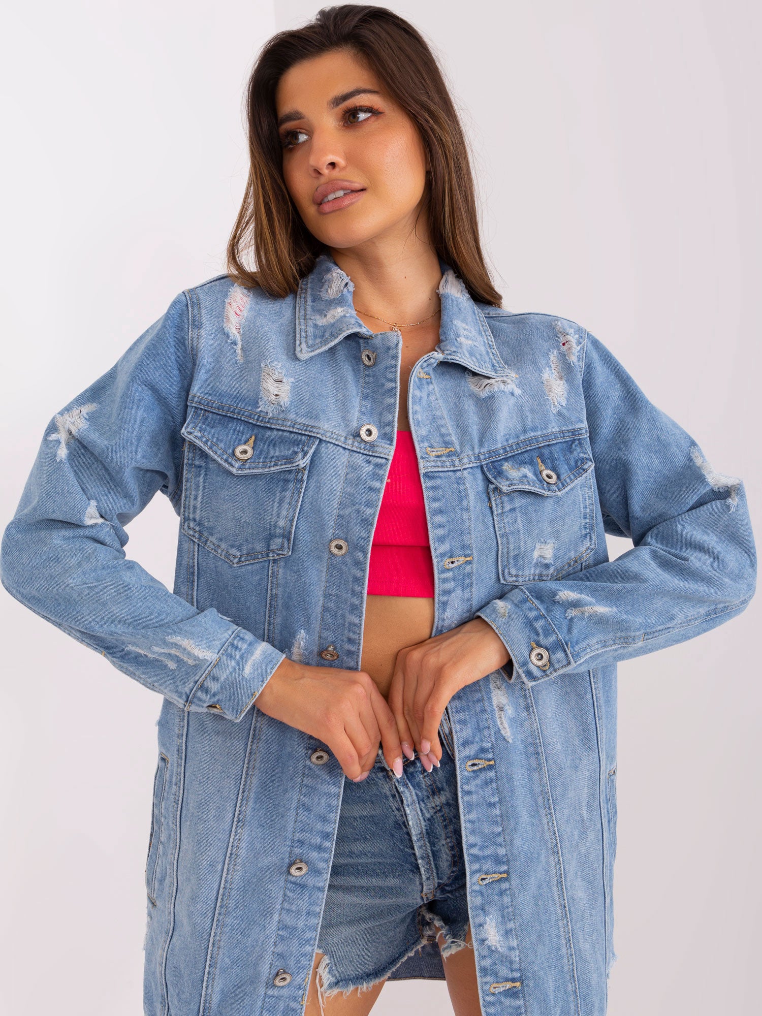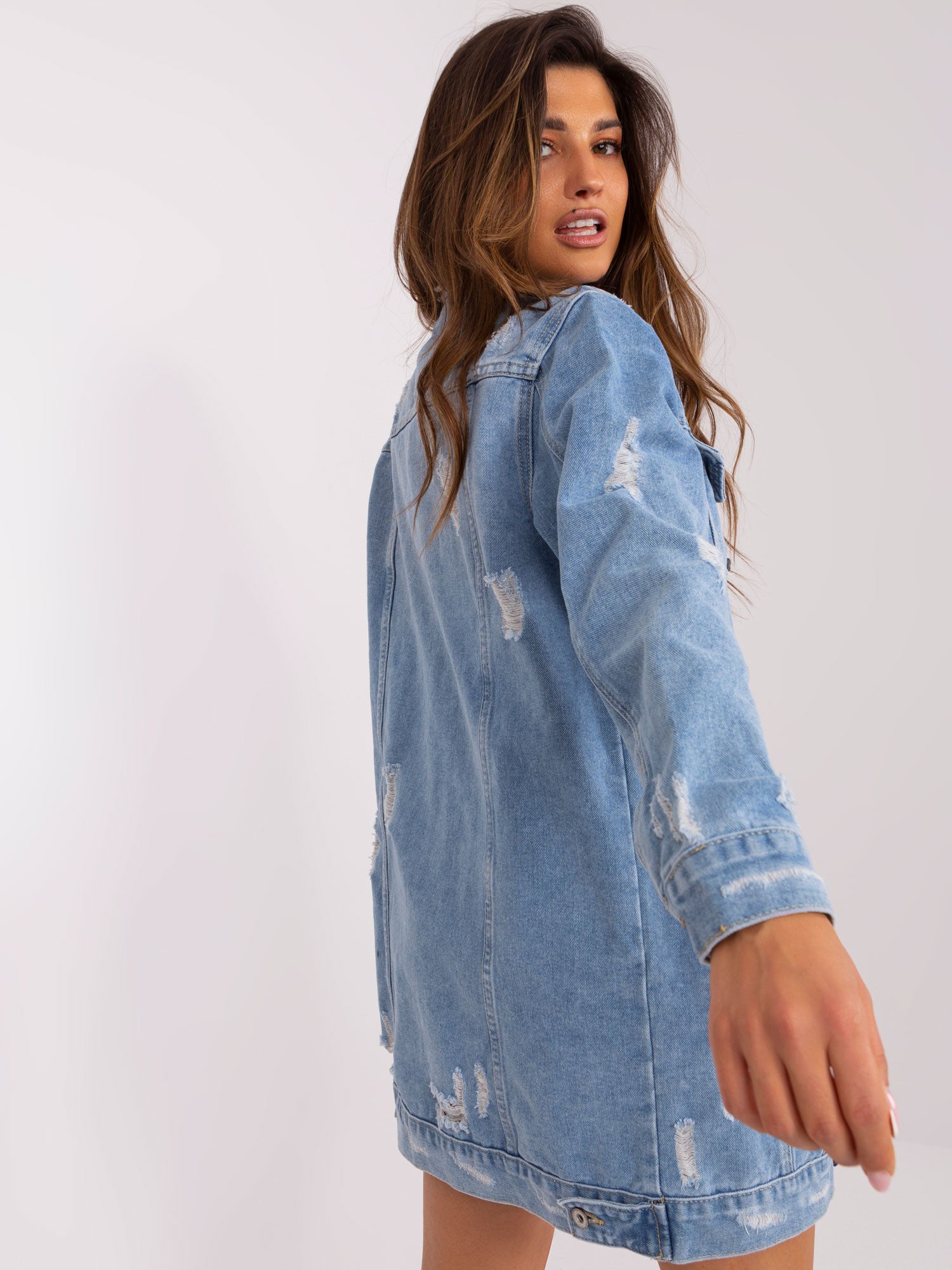 Niebieska długa kurtka jeansowa z kieszeniami .