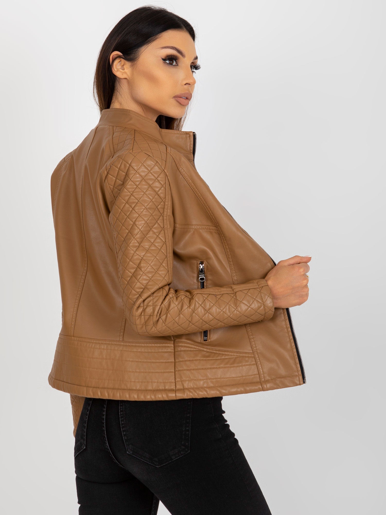 Camelowa damska kurtka z ekoskóry ze stójką .