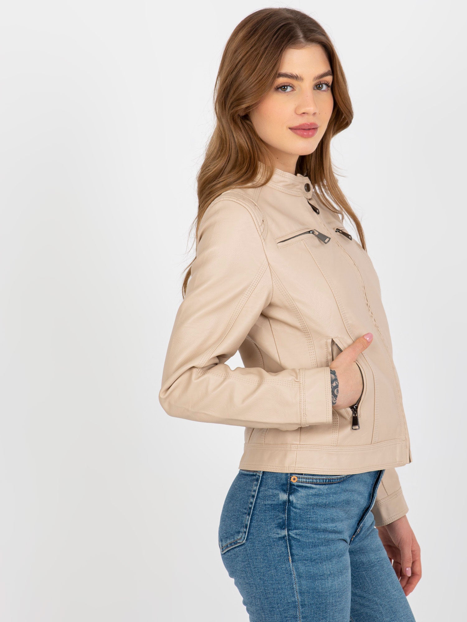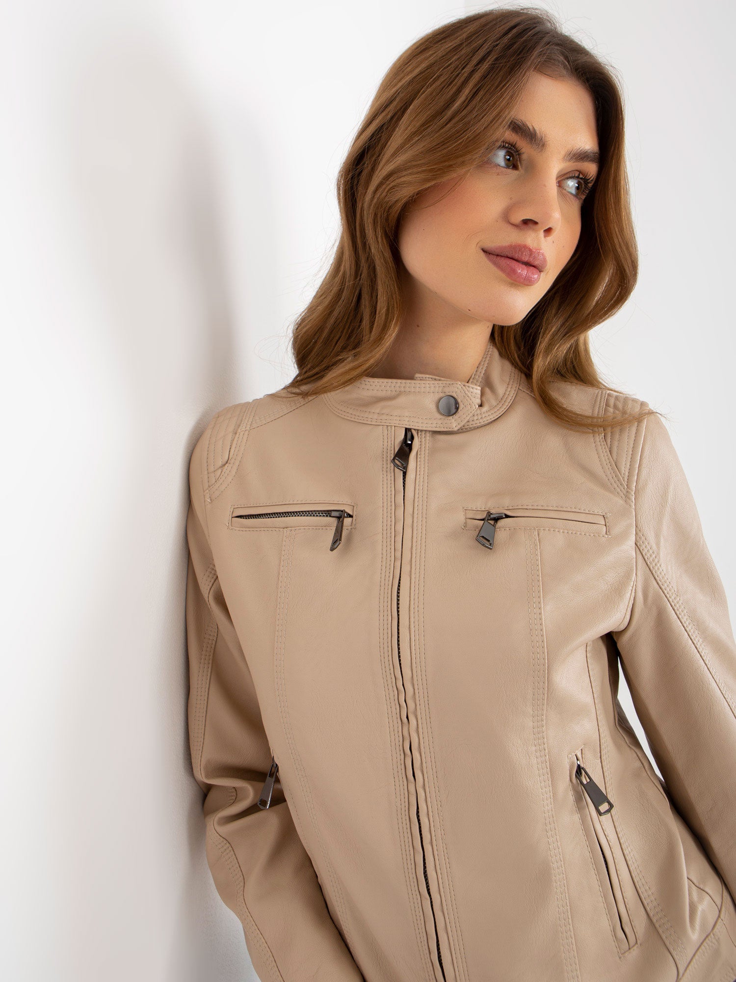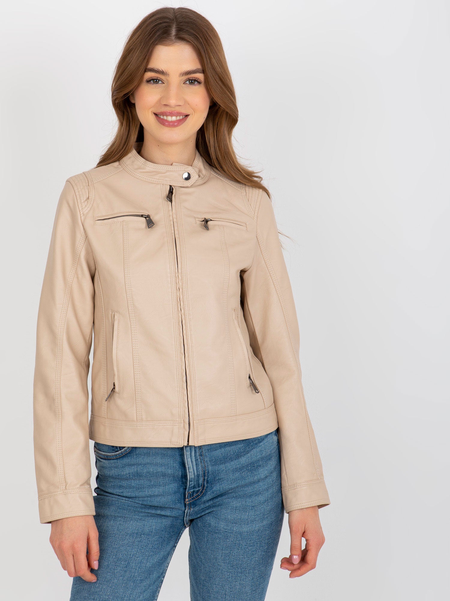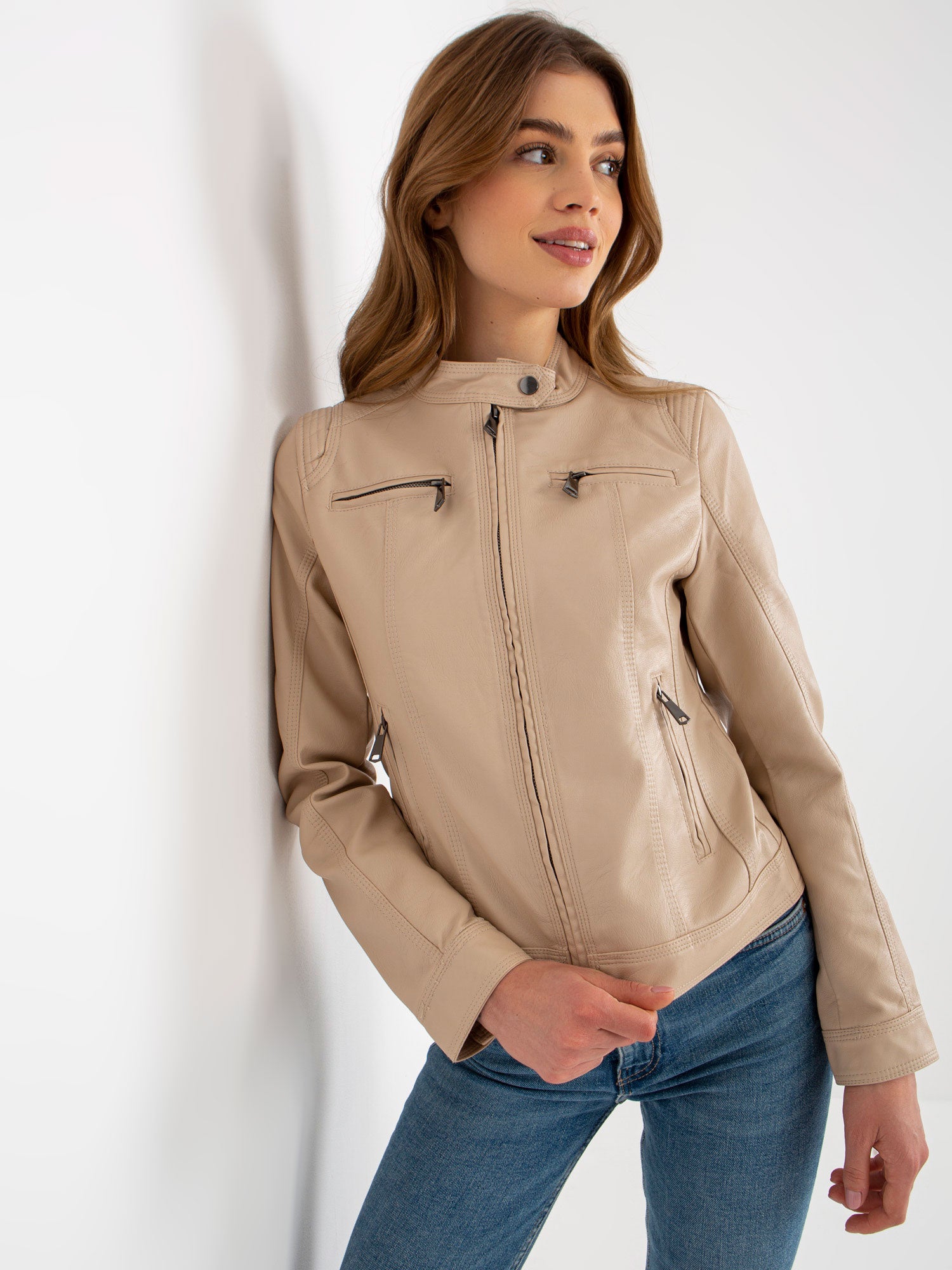 Beżowa kurtka z ekoskóry biker z kieszeniami .