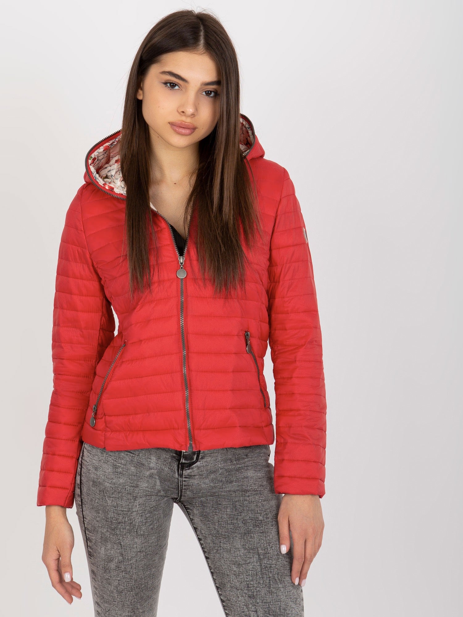 Czerwona kurtka pikowana z kieszeniami.