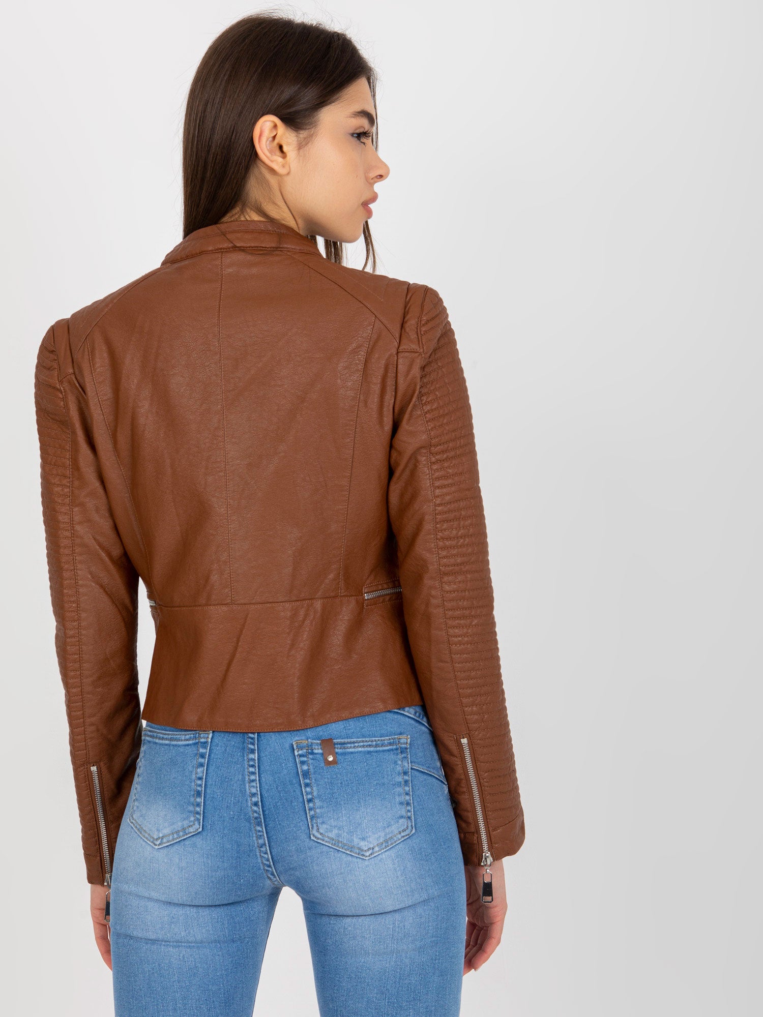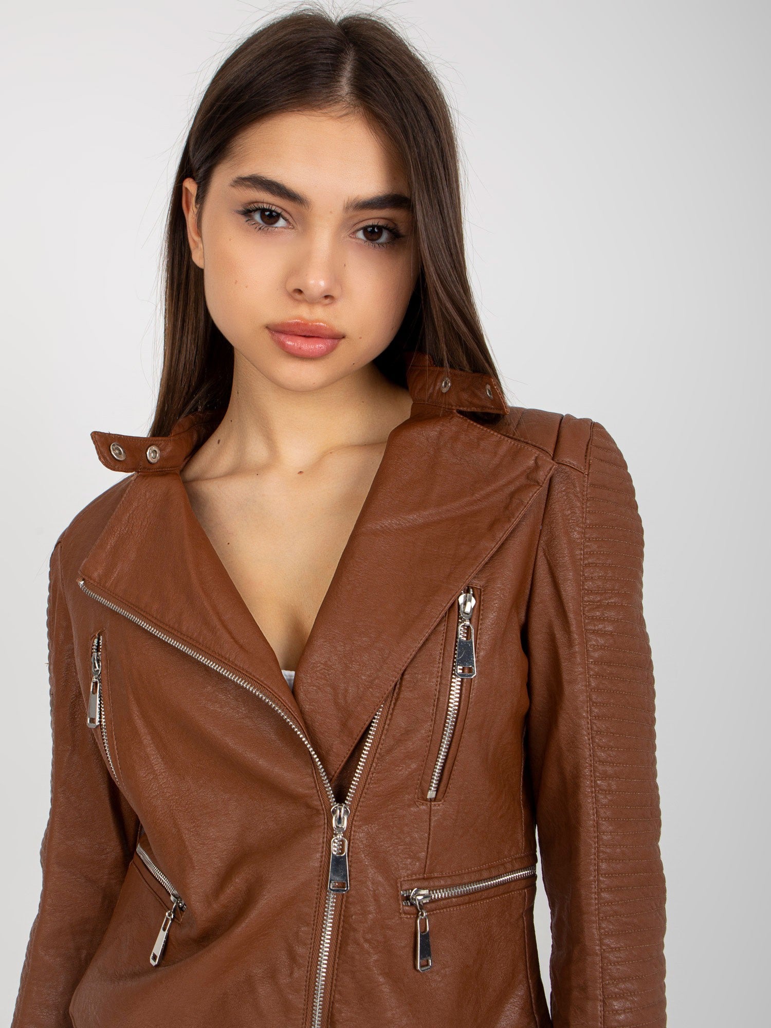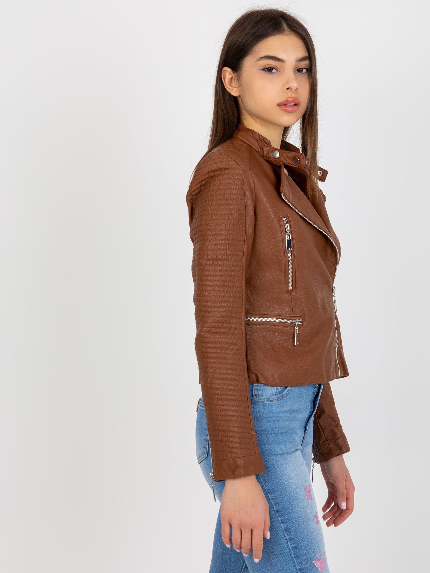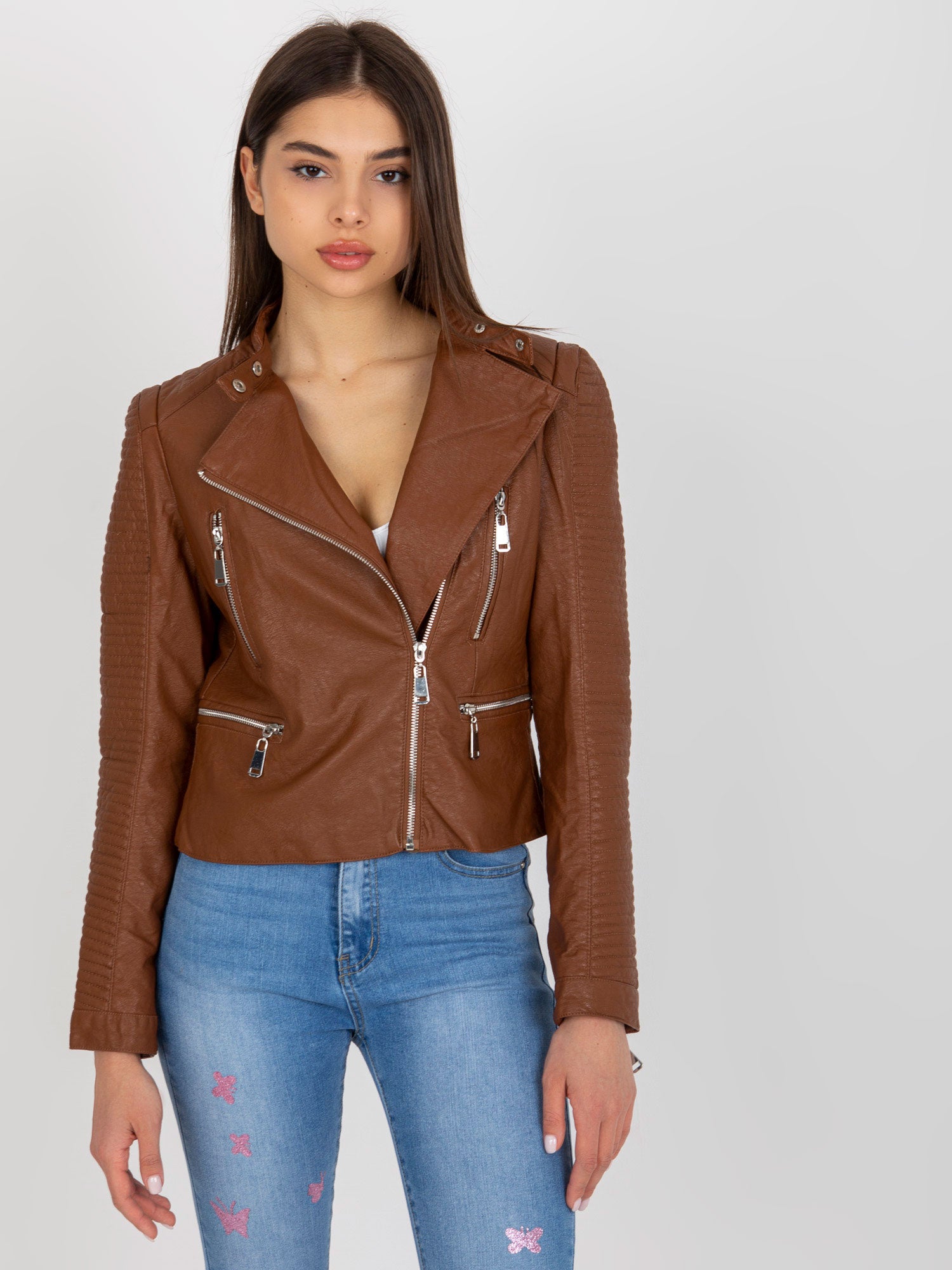 Brązowa damska kurtka ramoneska.