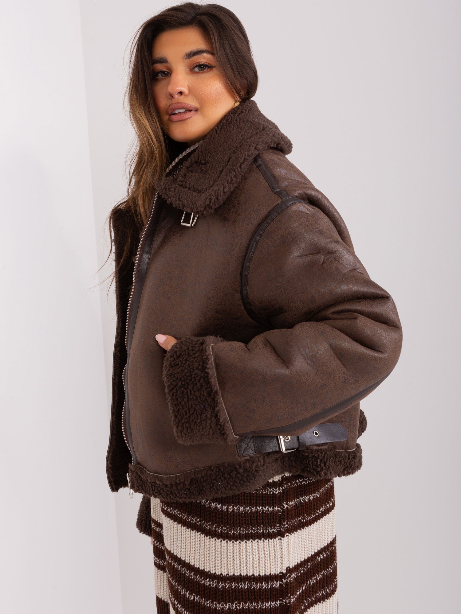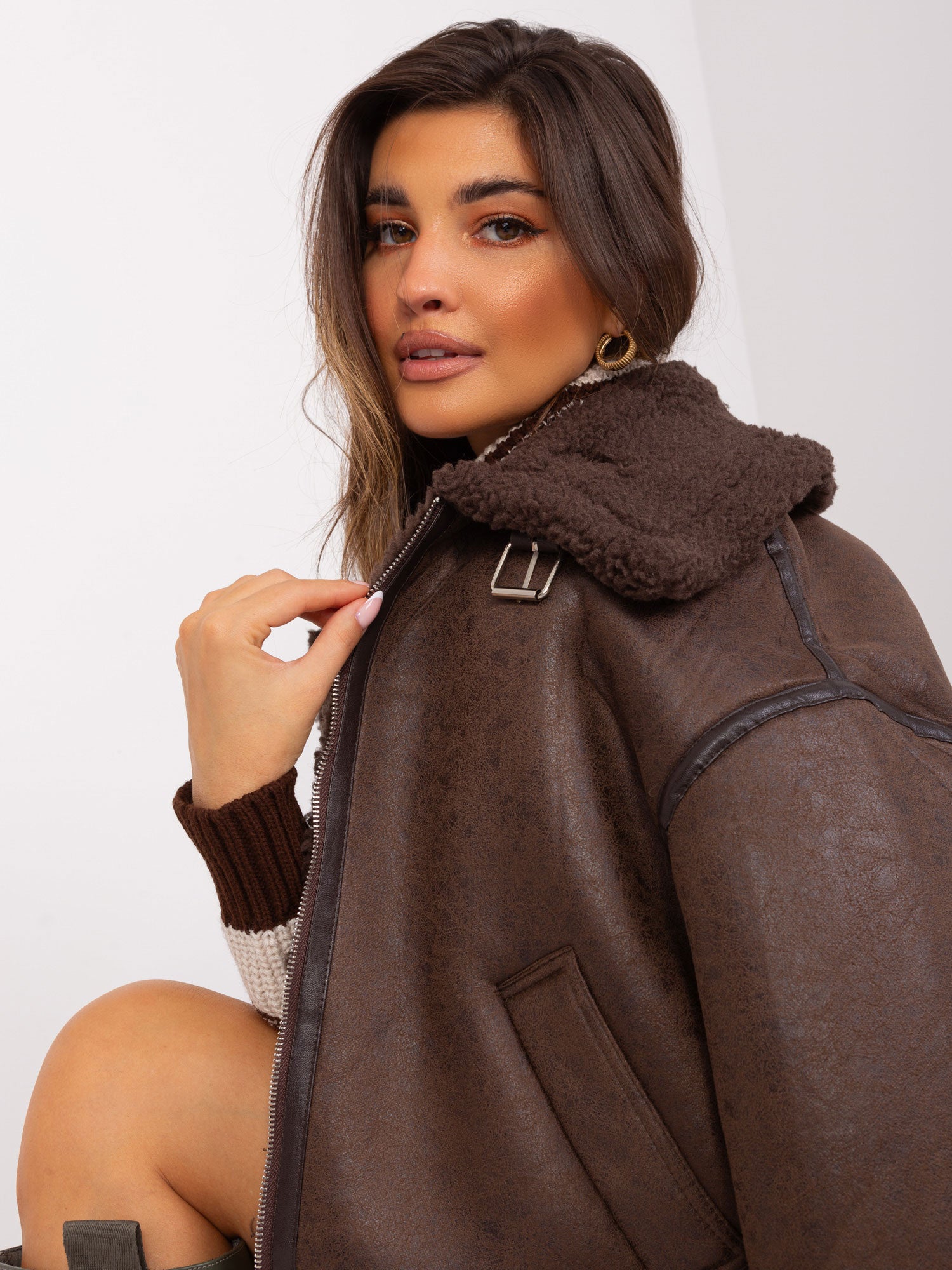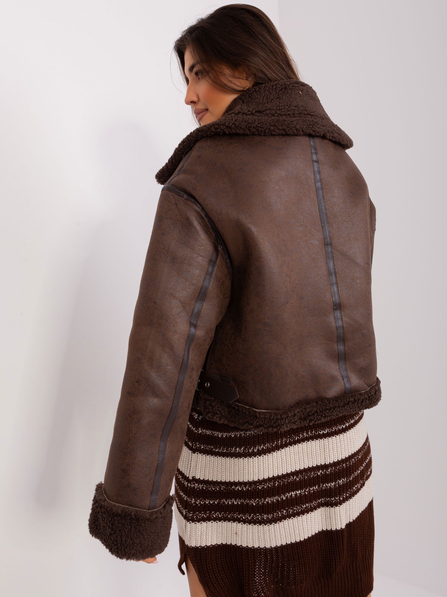 Brązowa ocieplana kurtka zimowa z ekoskóry z kołnierzem.