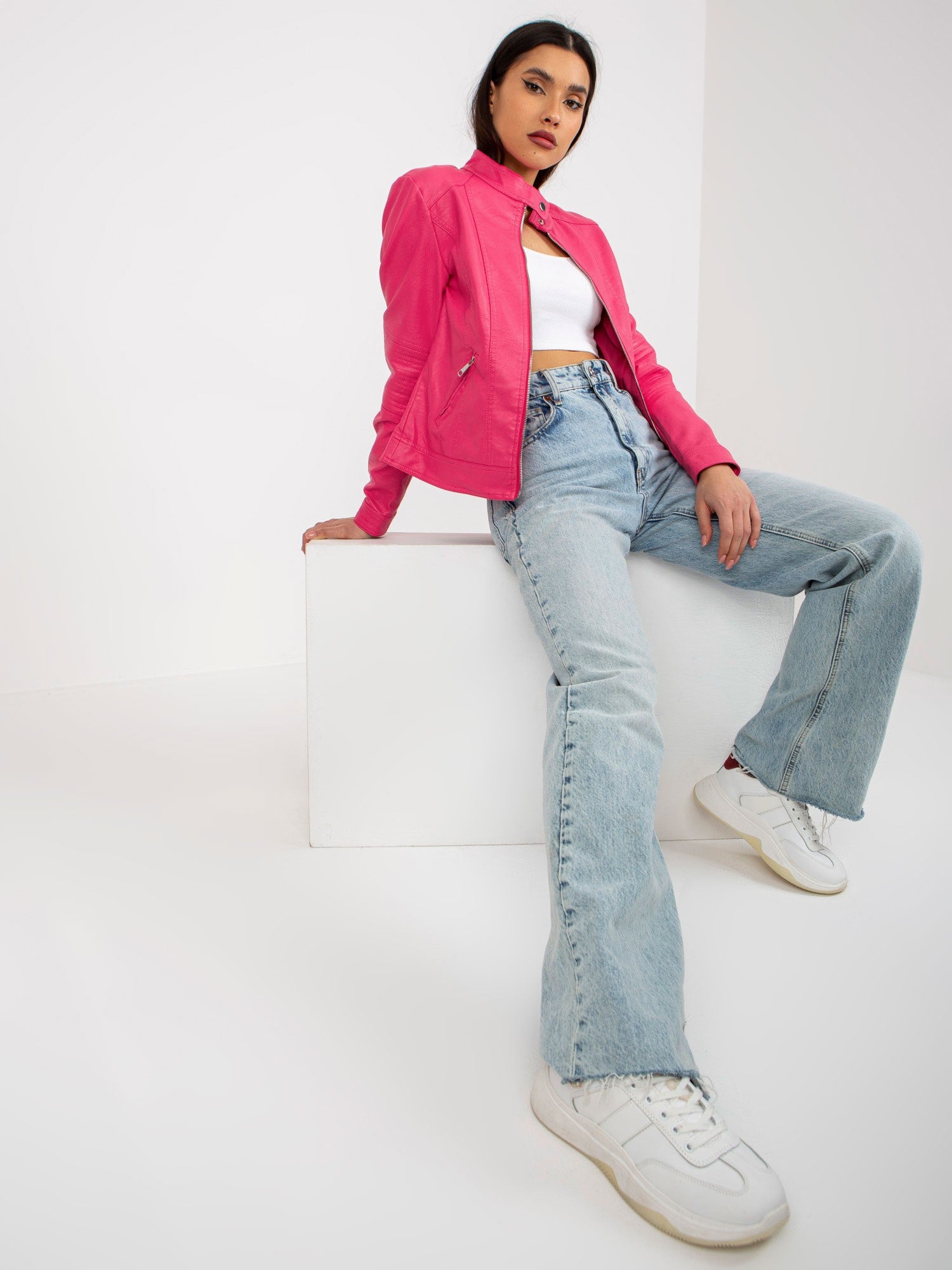 Ciemnoróżowa damska kurtka z ekoskóry biker z kieszeniami .