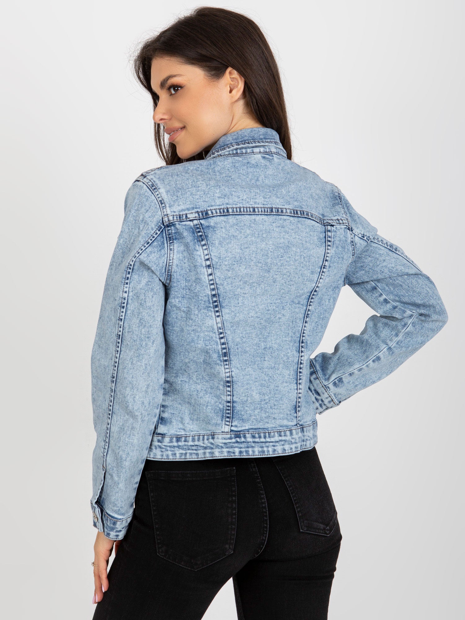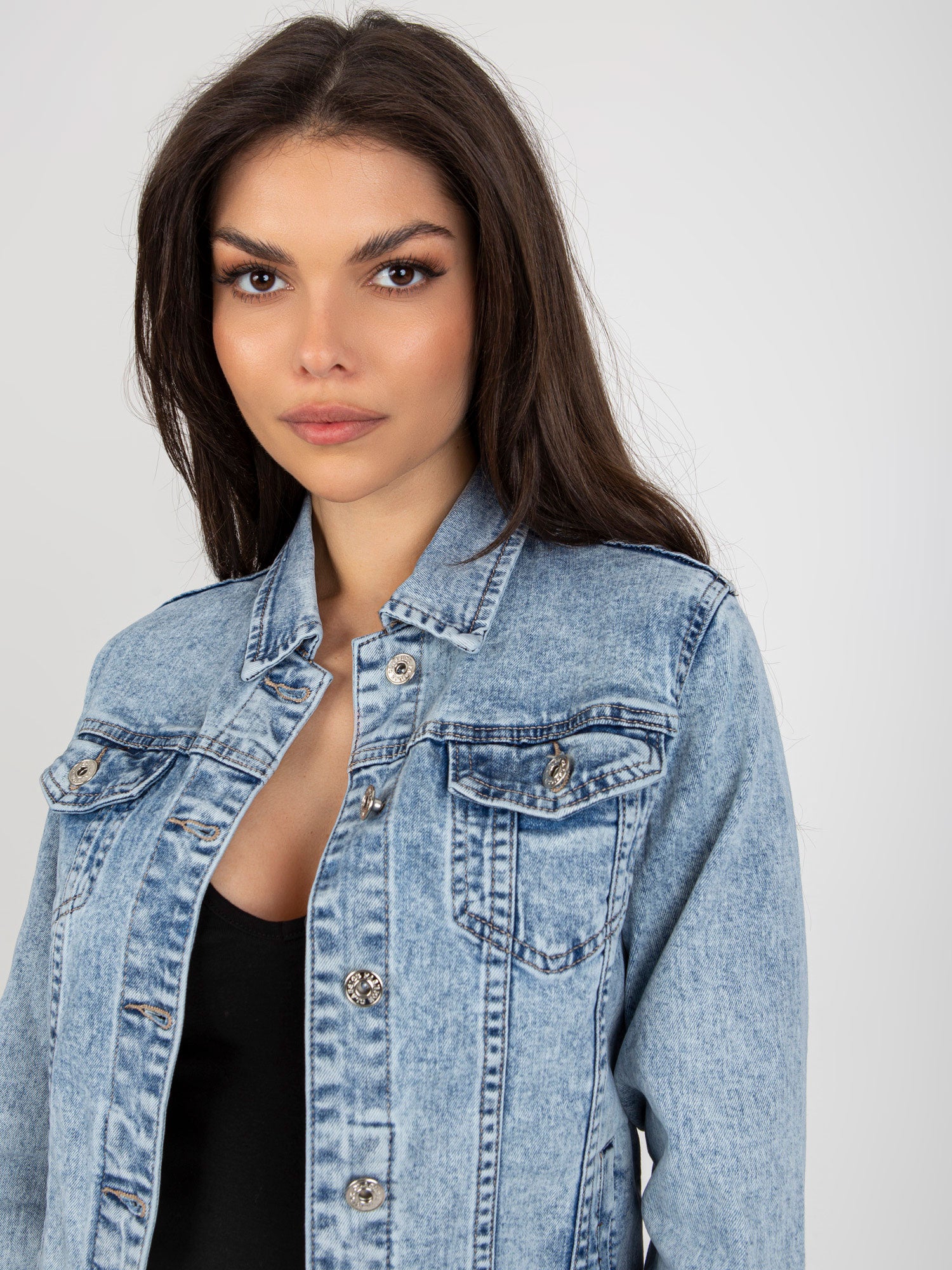 Niebieska krótka kurtka jeansowa z kieszeniami .