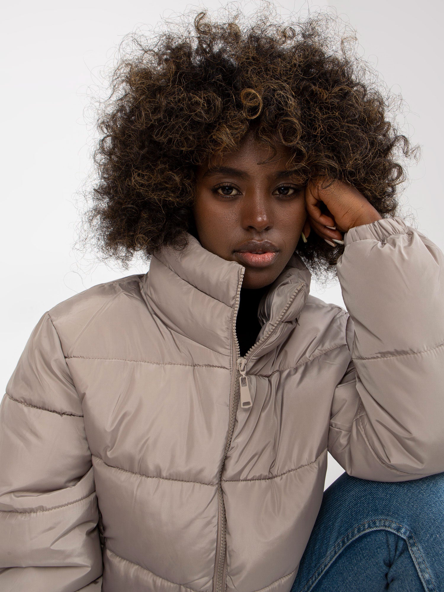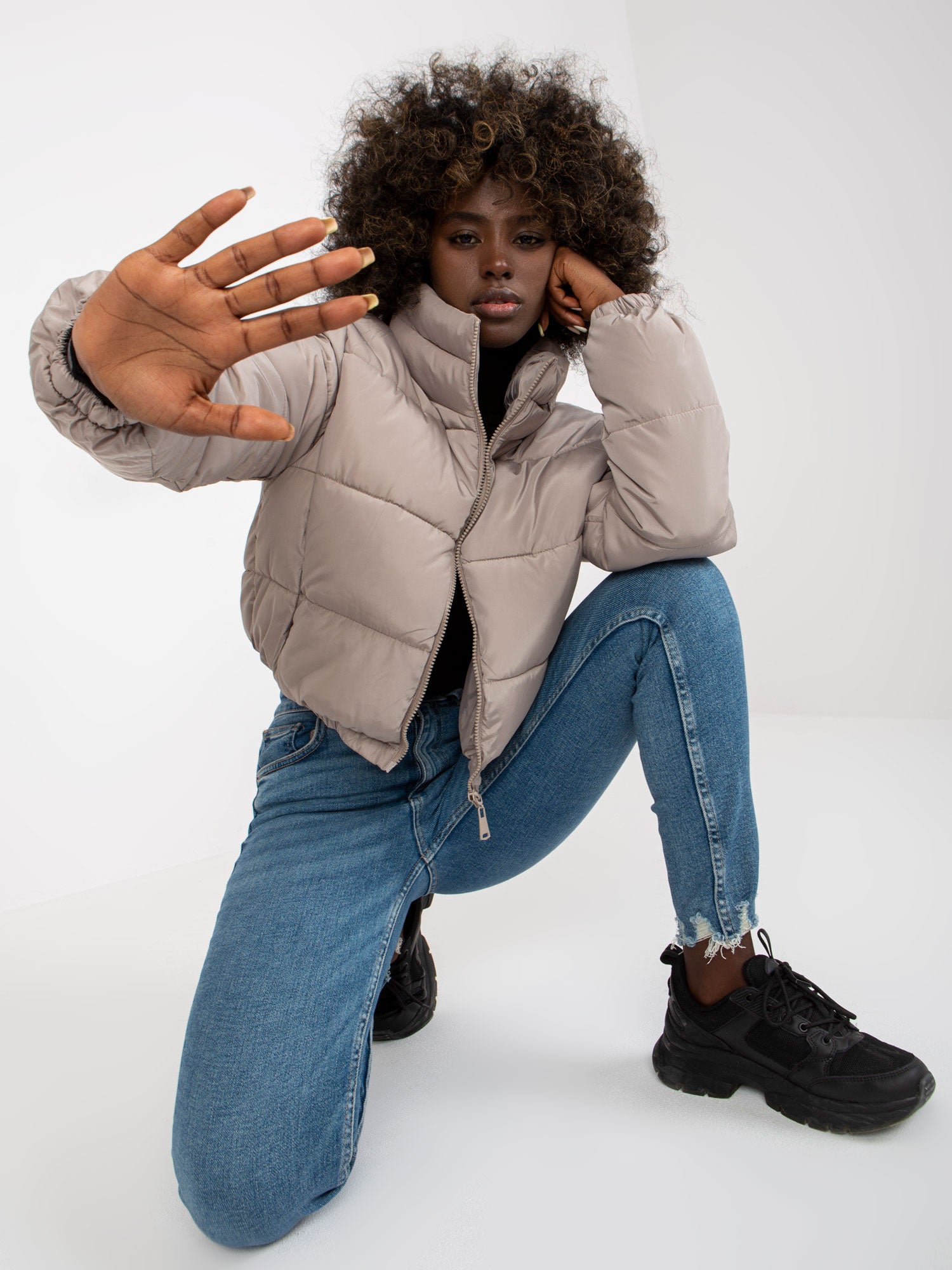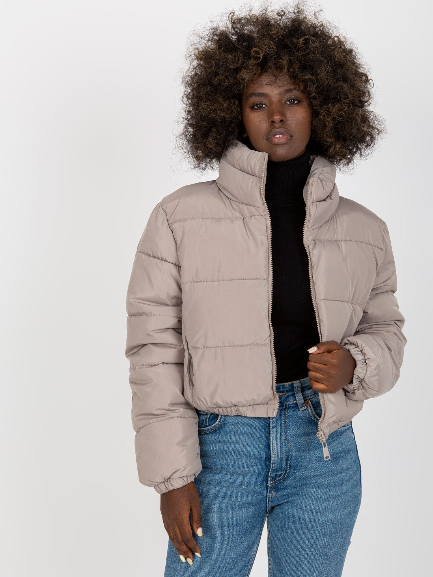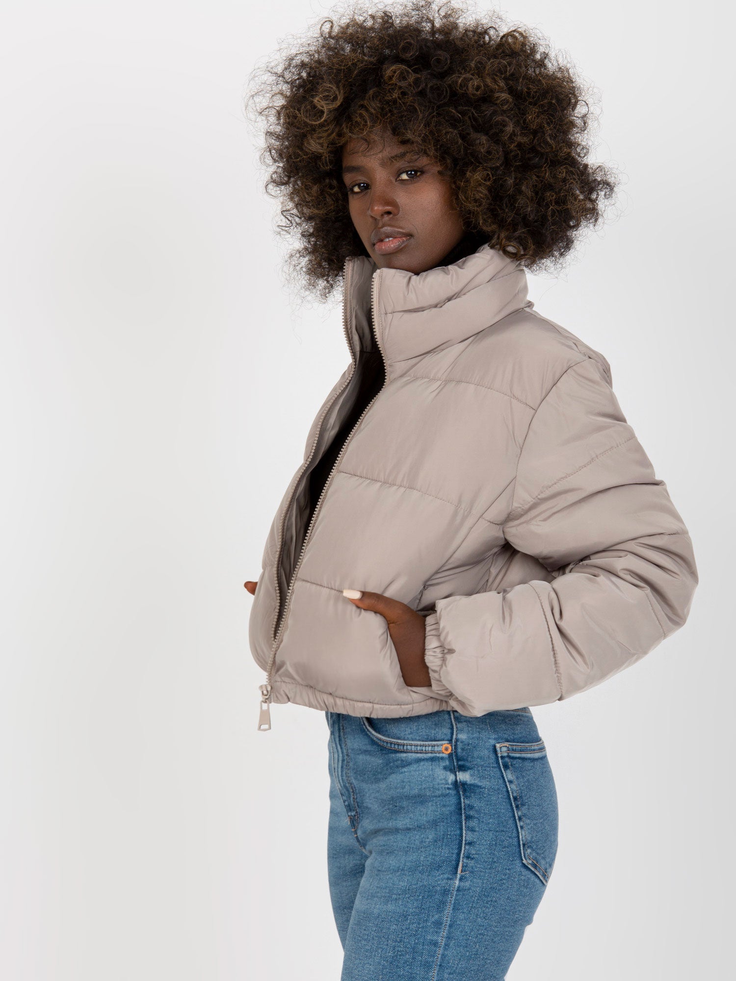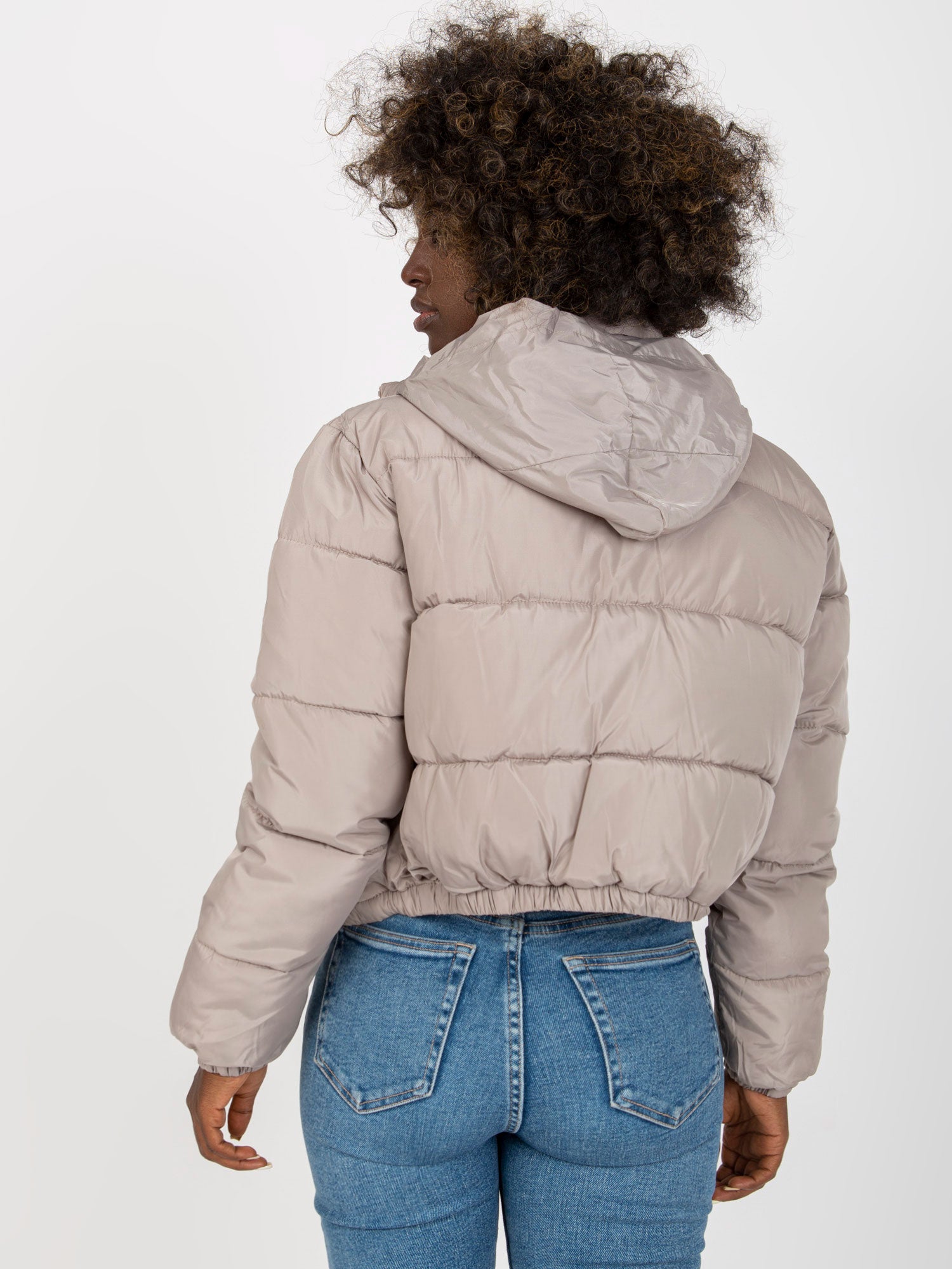 Jasnoszara krótka kurtka zimowa z kapturem Iseline .