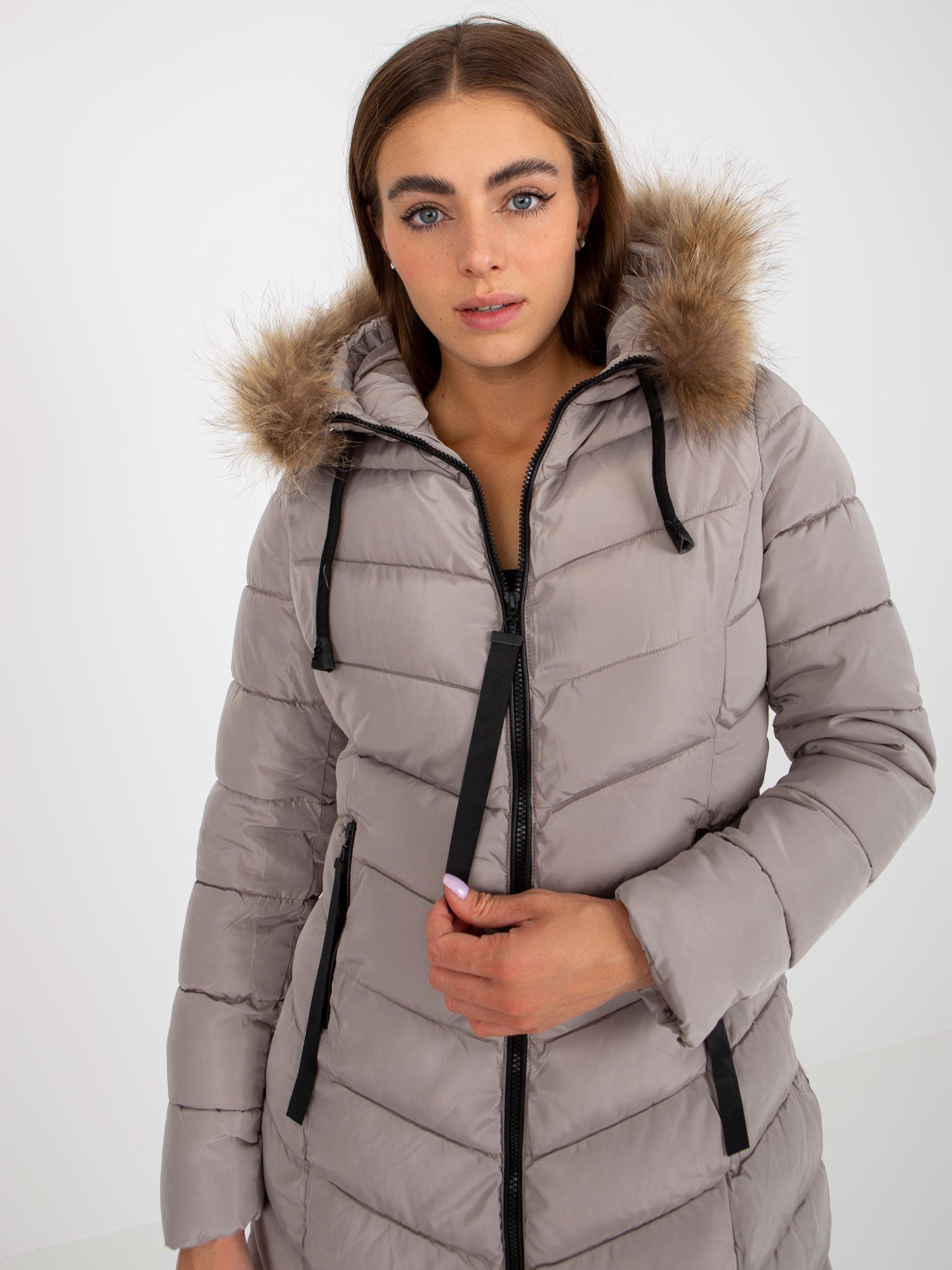 Ciemnobeżowa puchowa kurtka zimowa z pikowaniem .