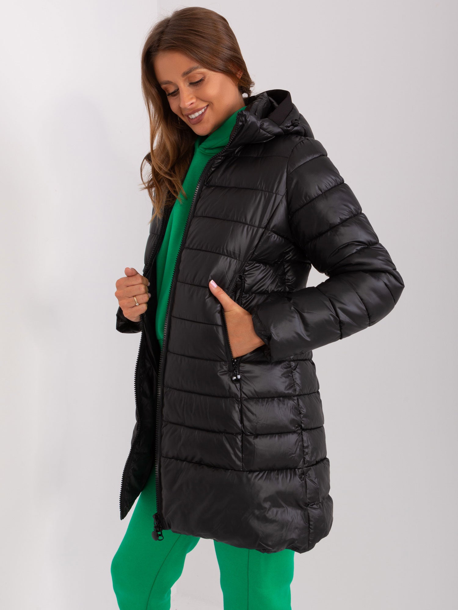 Czarna pikowana kurtka zimowa z kieszeniami .