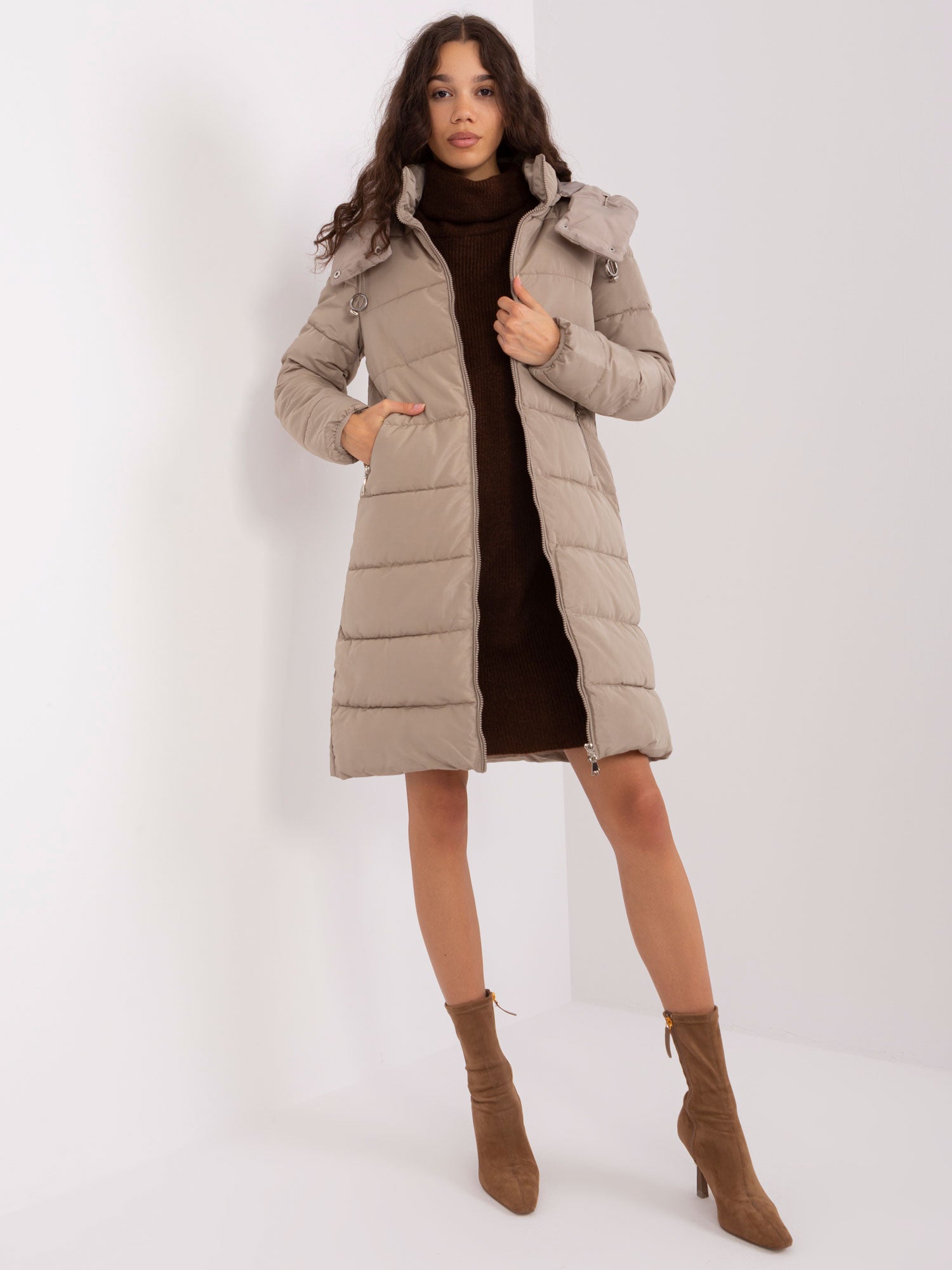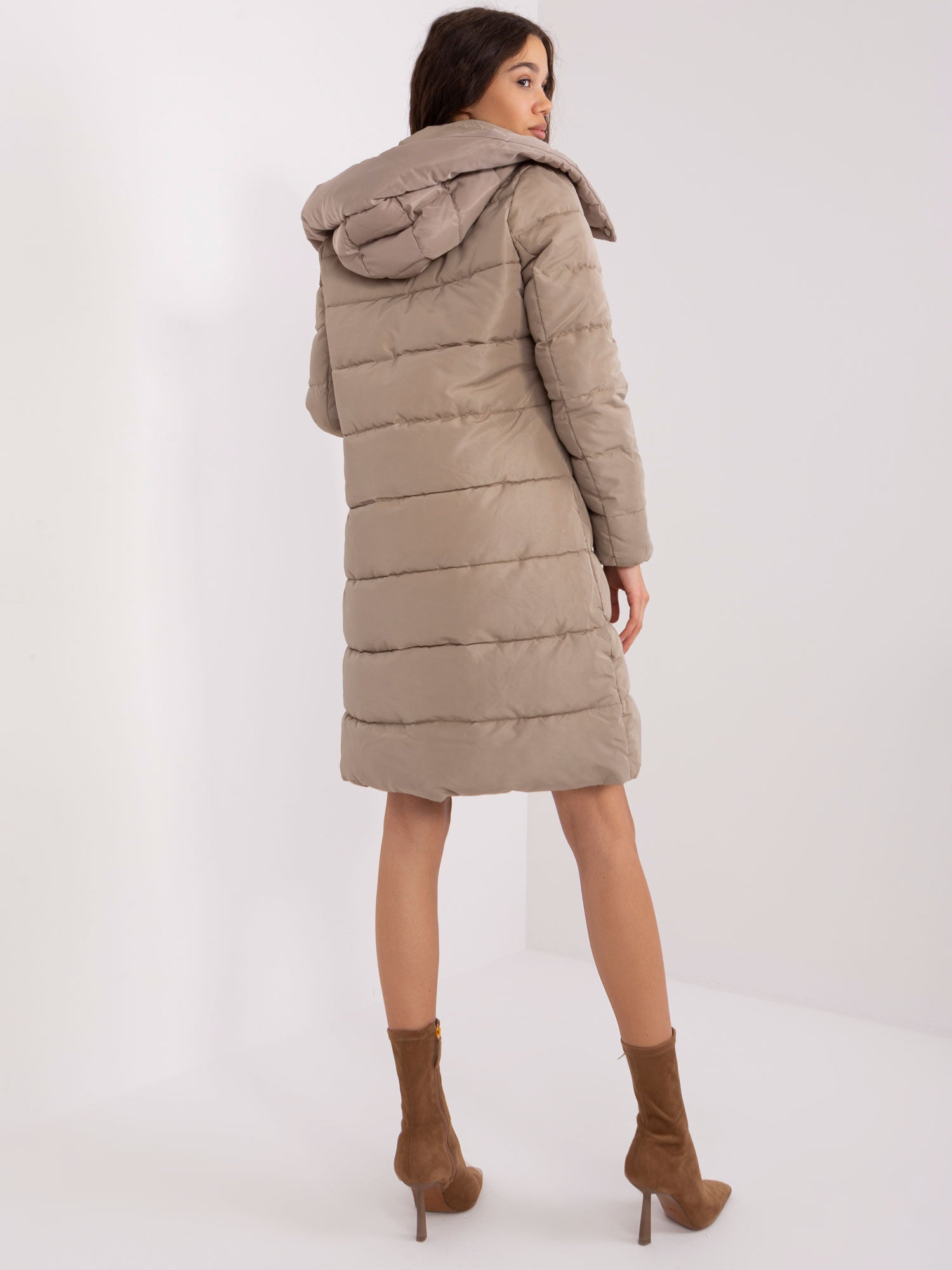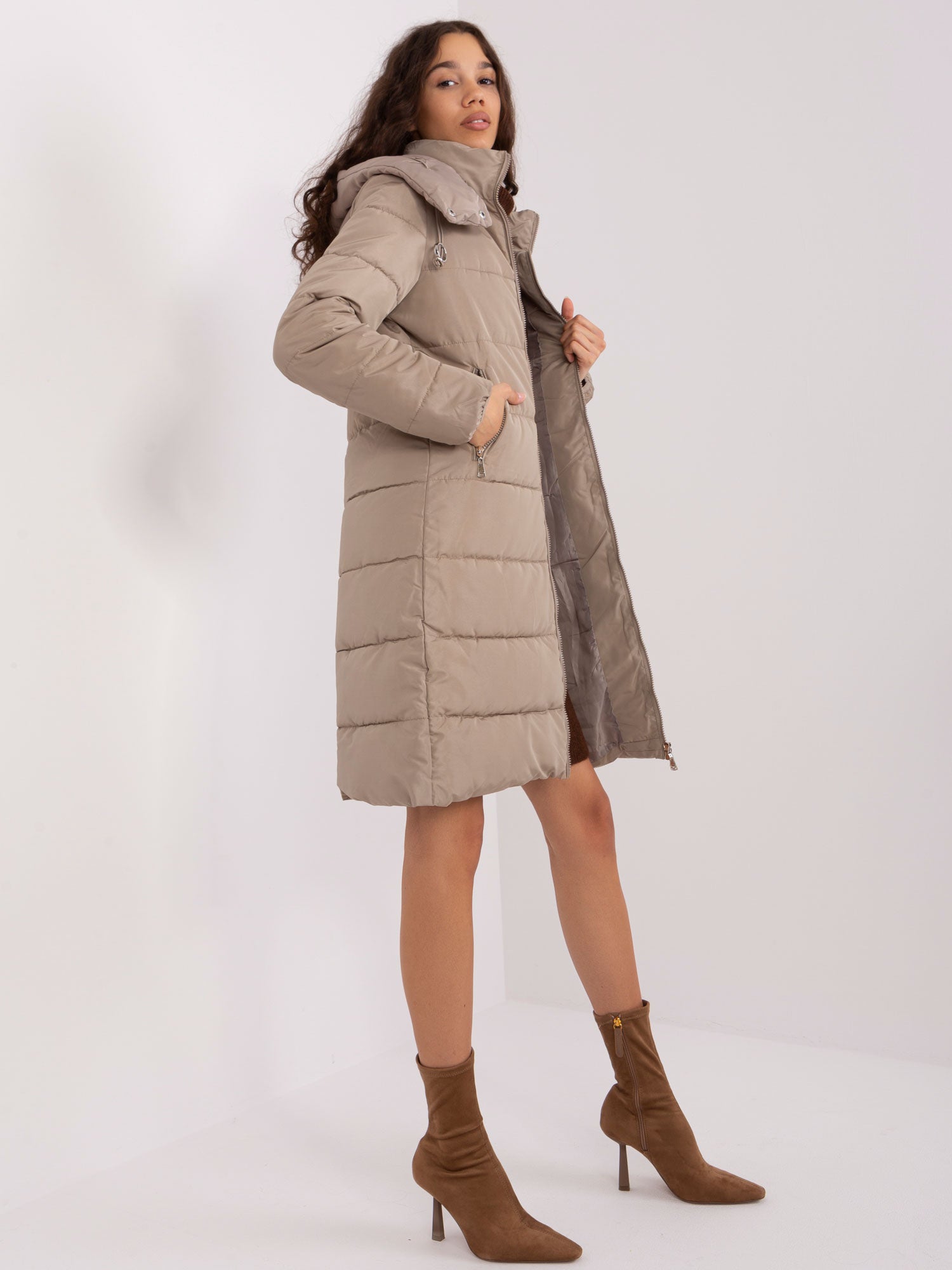Ciemnobeżowa długa kurtka zimowa z pikowaniem .