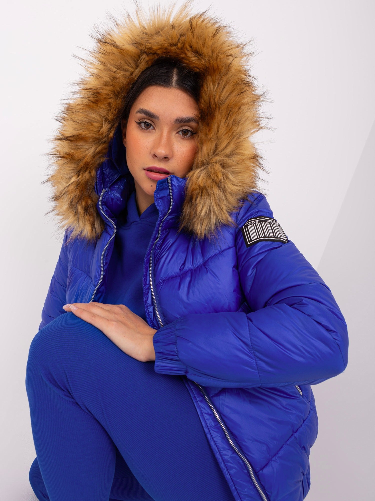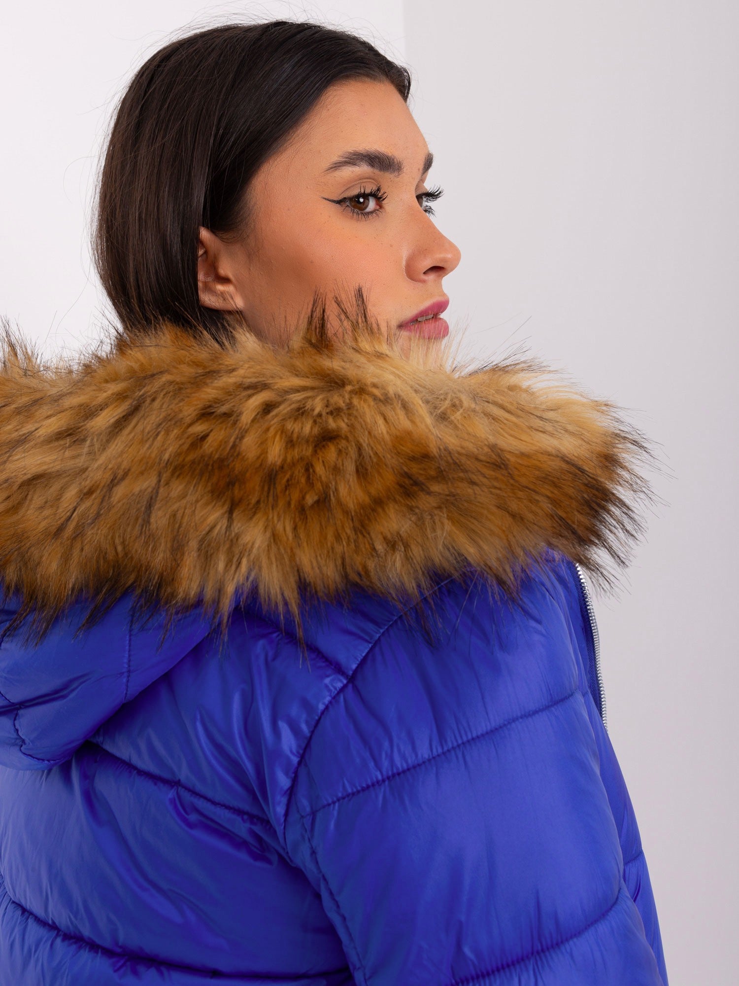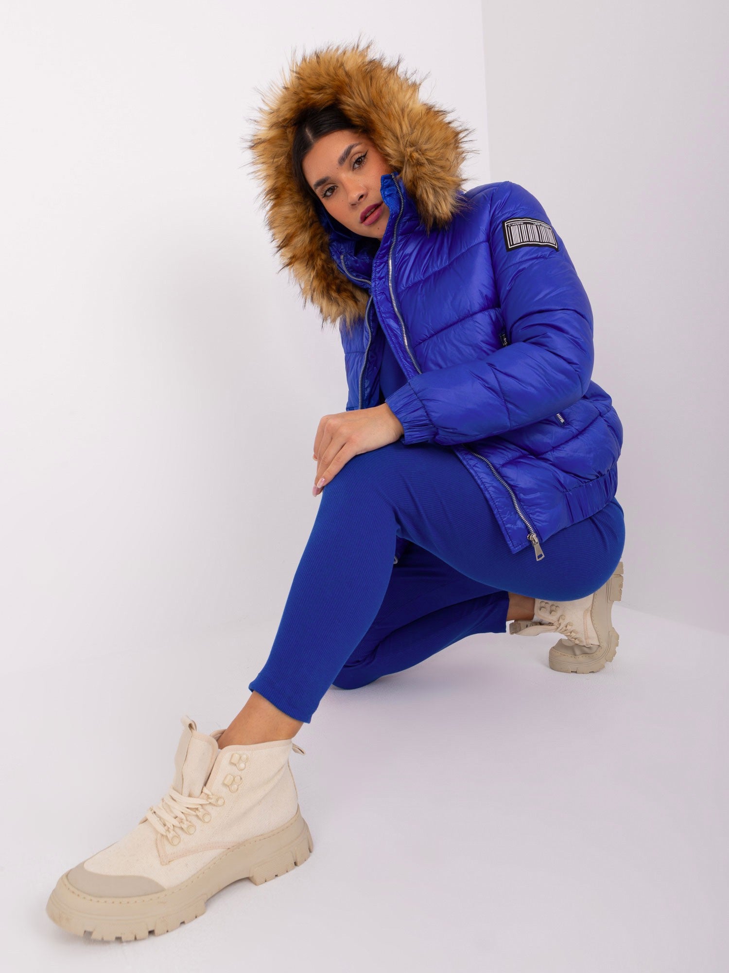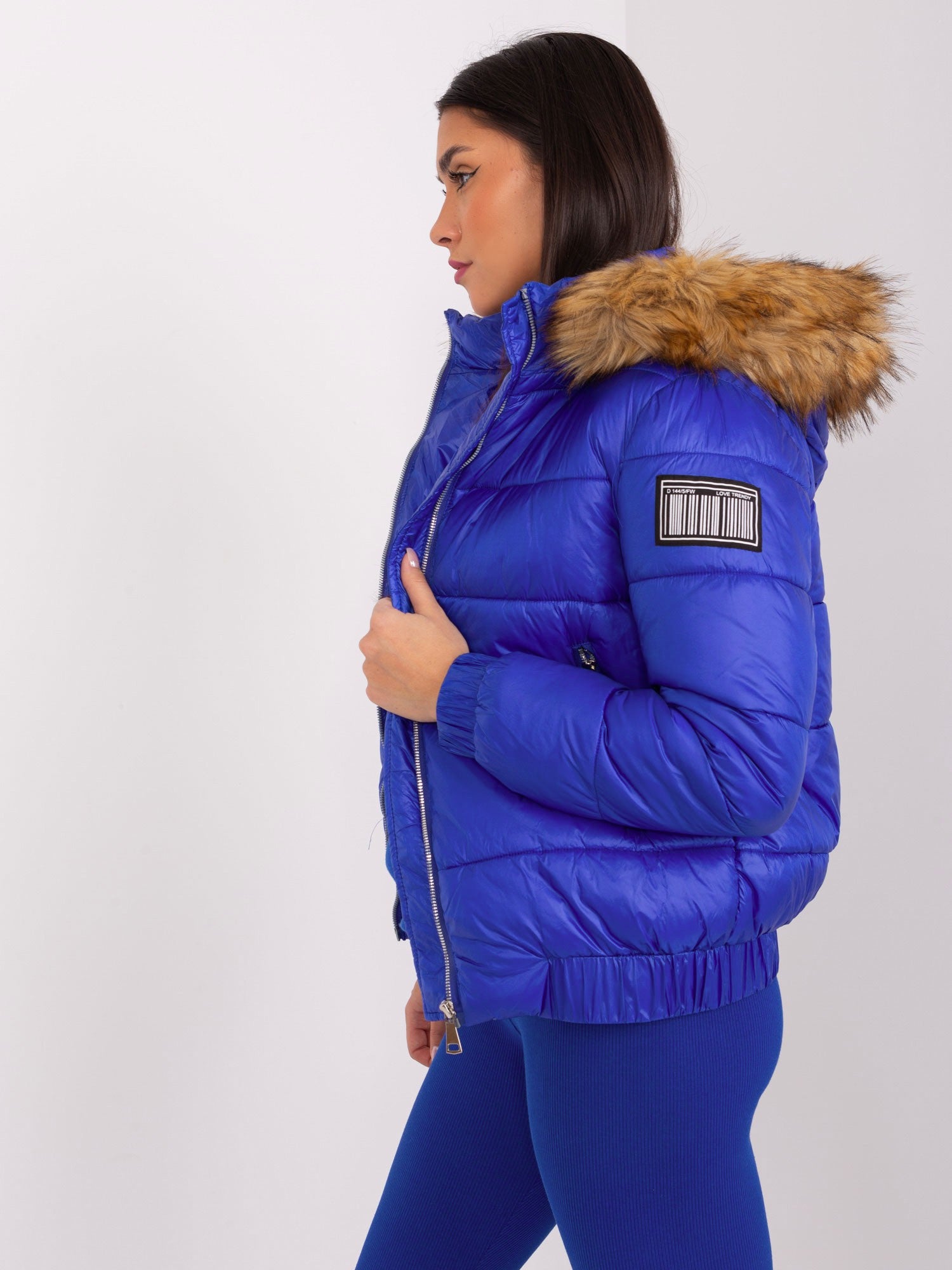 Ciemnoniebieska krótka kurtka zimowa z kapturem .