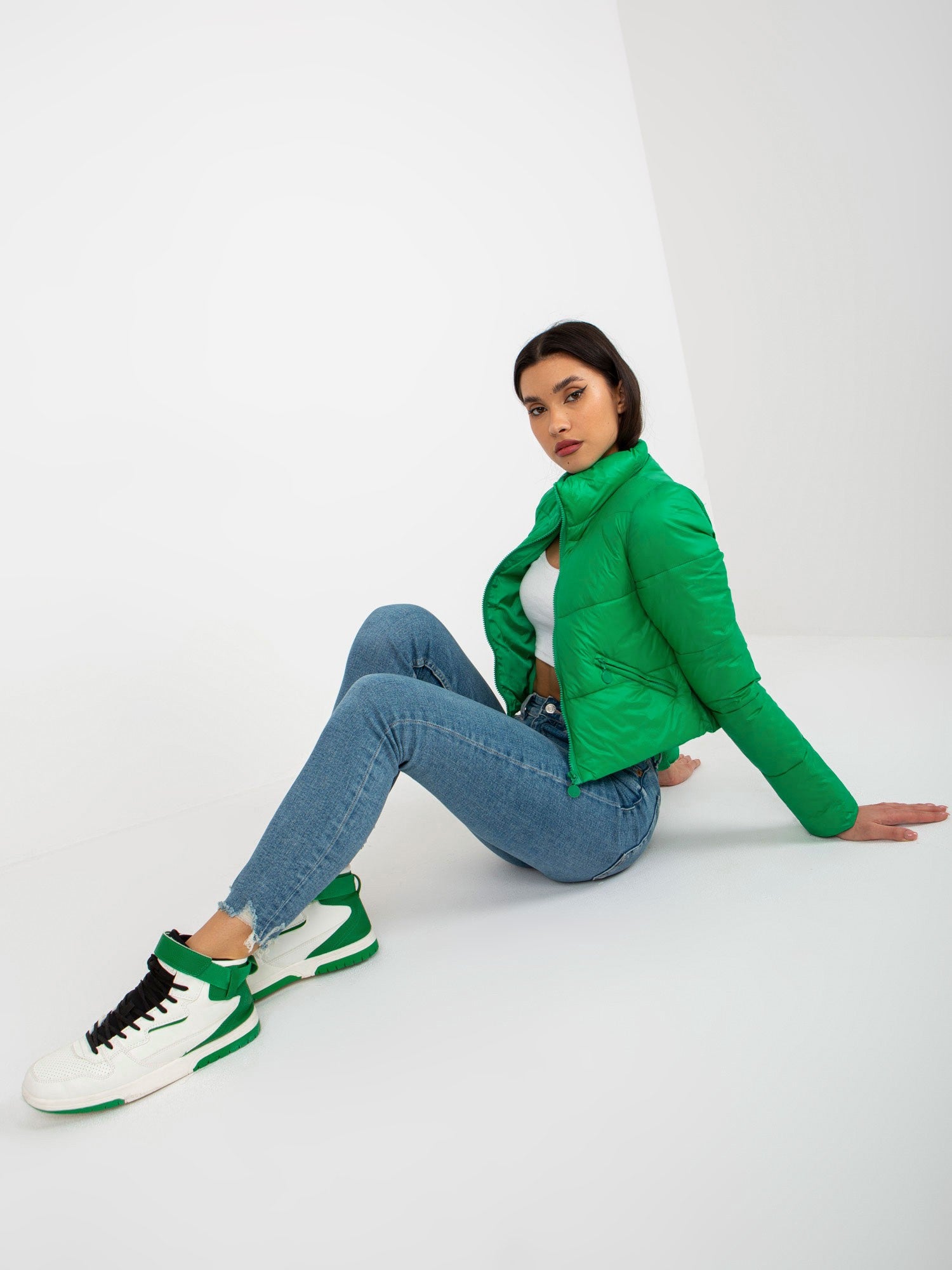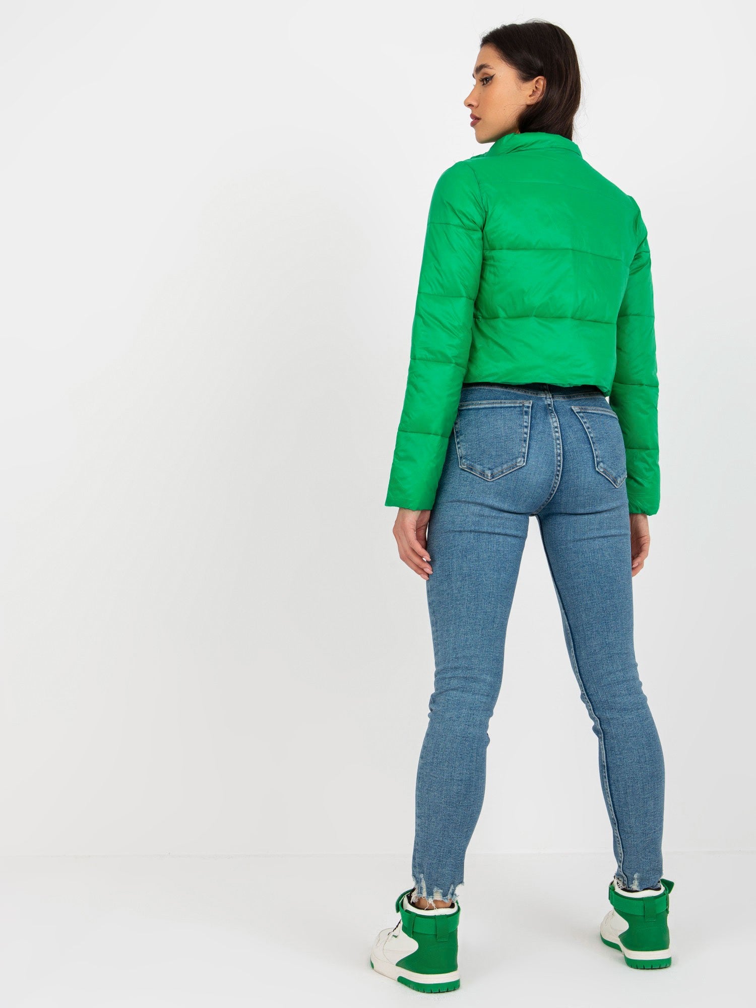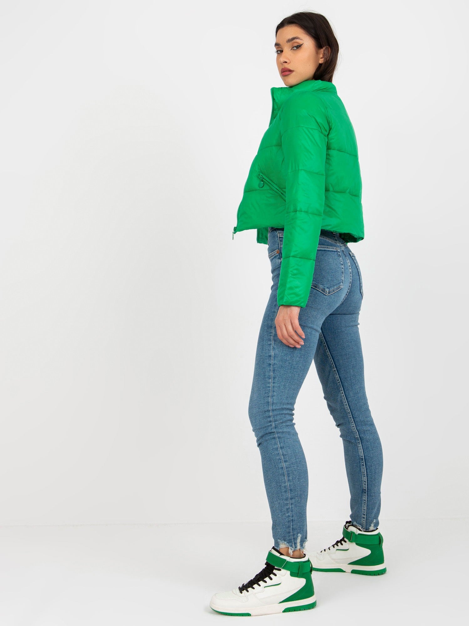 Zielona krótka przejściowa kurtka pikowana z kieszeniami .