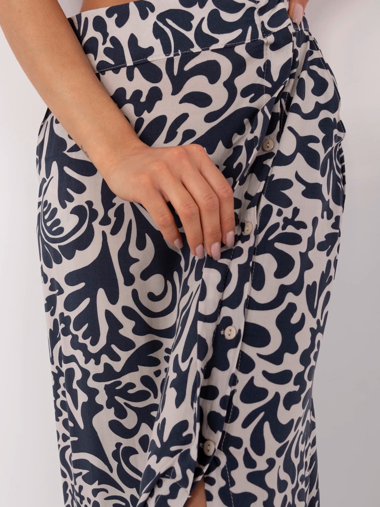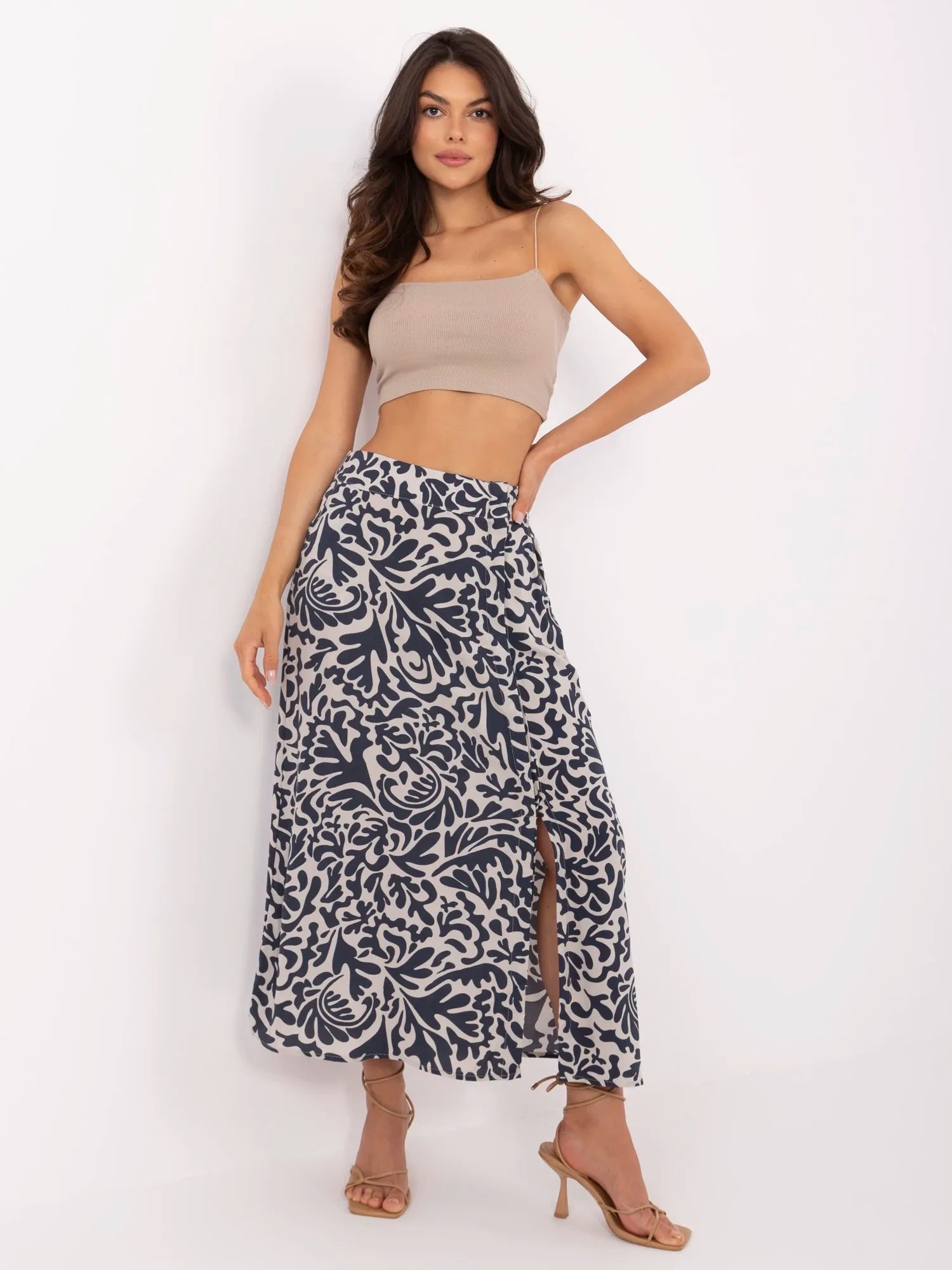 Wymiary spódnicy w rozmiarze S mierzone na płasko: szerokość w pasie - 38 cm (na płasko), szerokość w pasie - 47 cm (po rozciągnięciu), szerokość w biodrach - 53 cm, długość całkowita - 89 cm.