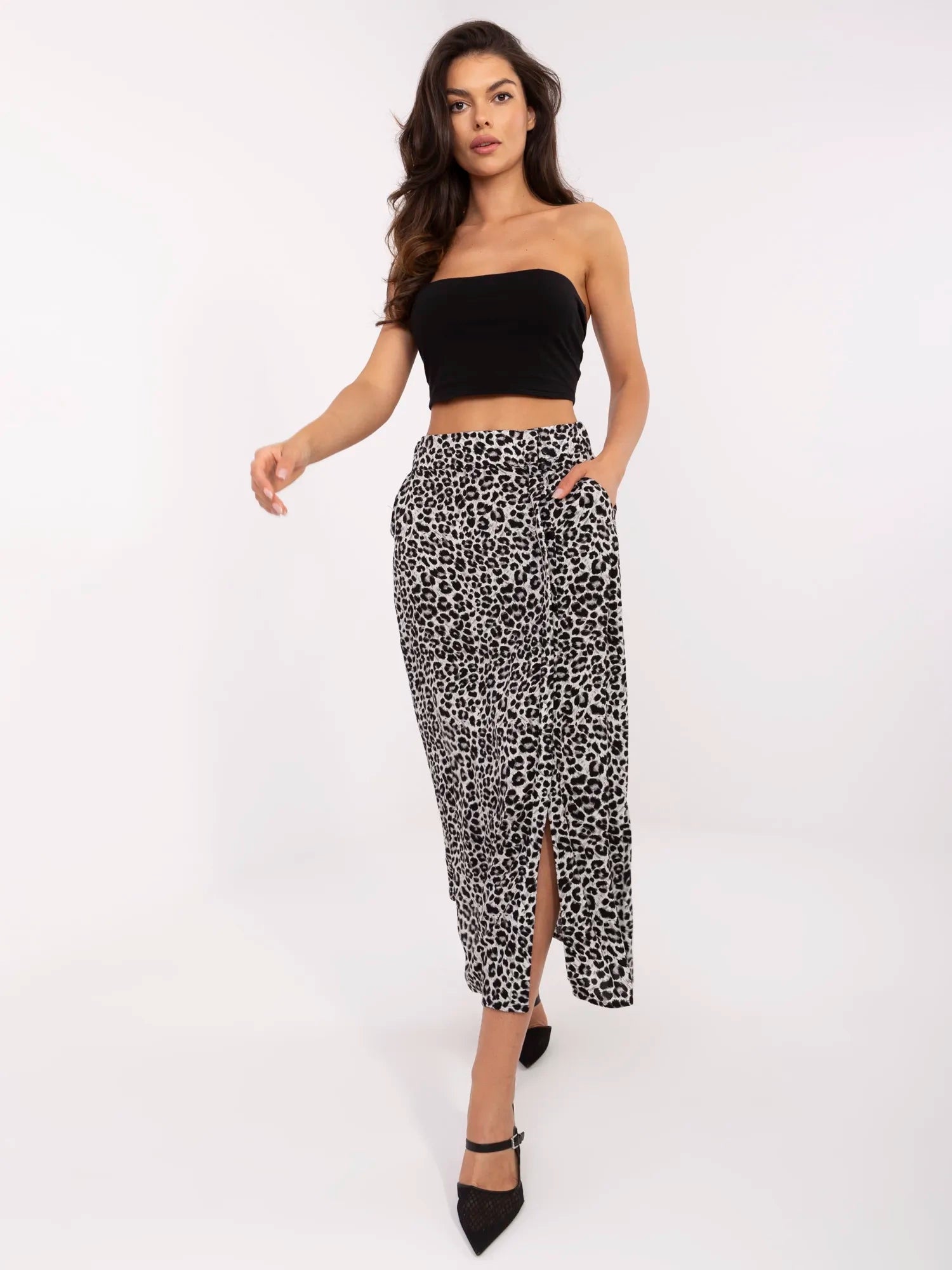 Wymiary spódnicy w rozmiarze S mierzone na płasko: szerokość w pasie - 38 cm (na płasko), szerokość w pasie - 47 cm (po rozciągnięciu), szerokość w biodrach - 53 cm, długość całkowita - 89 cm.