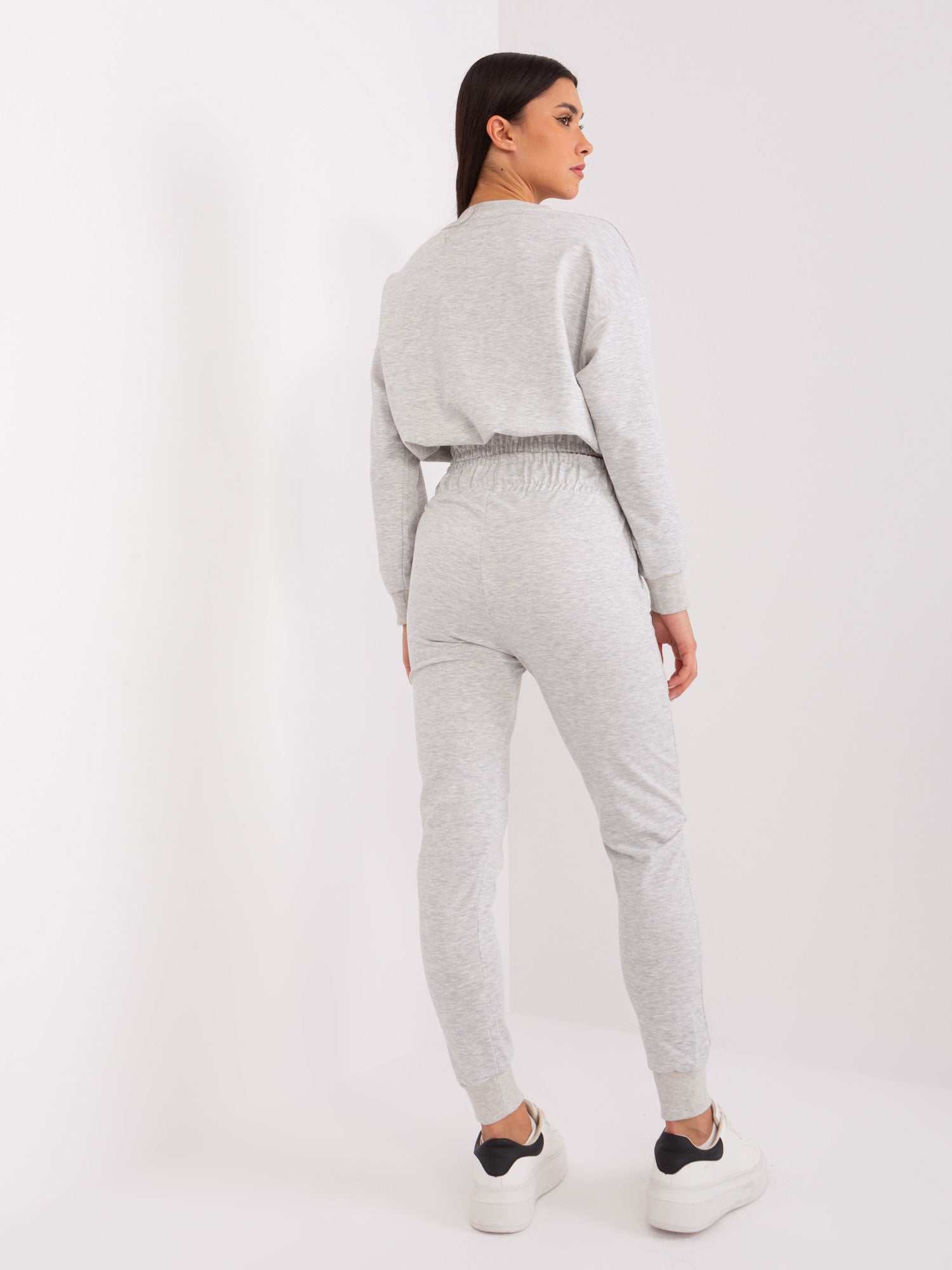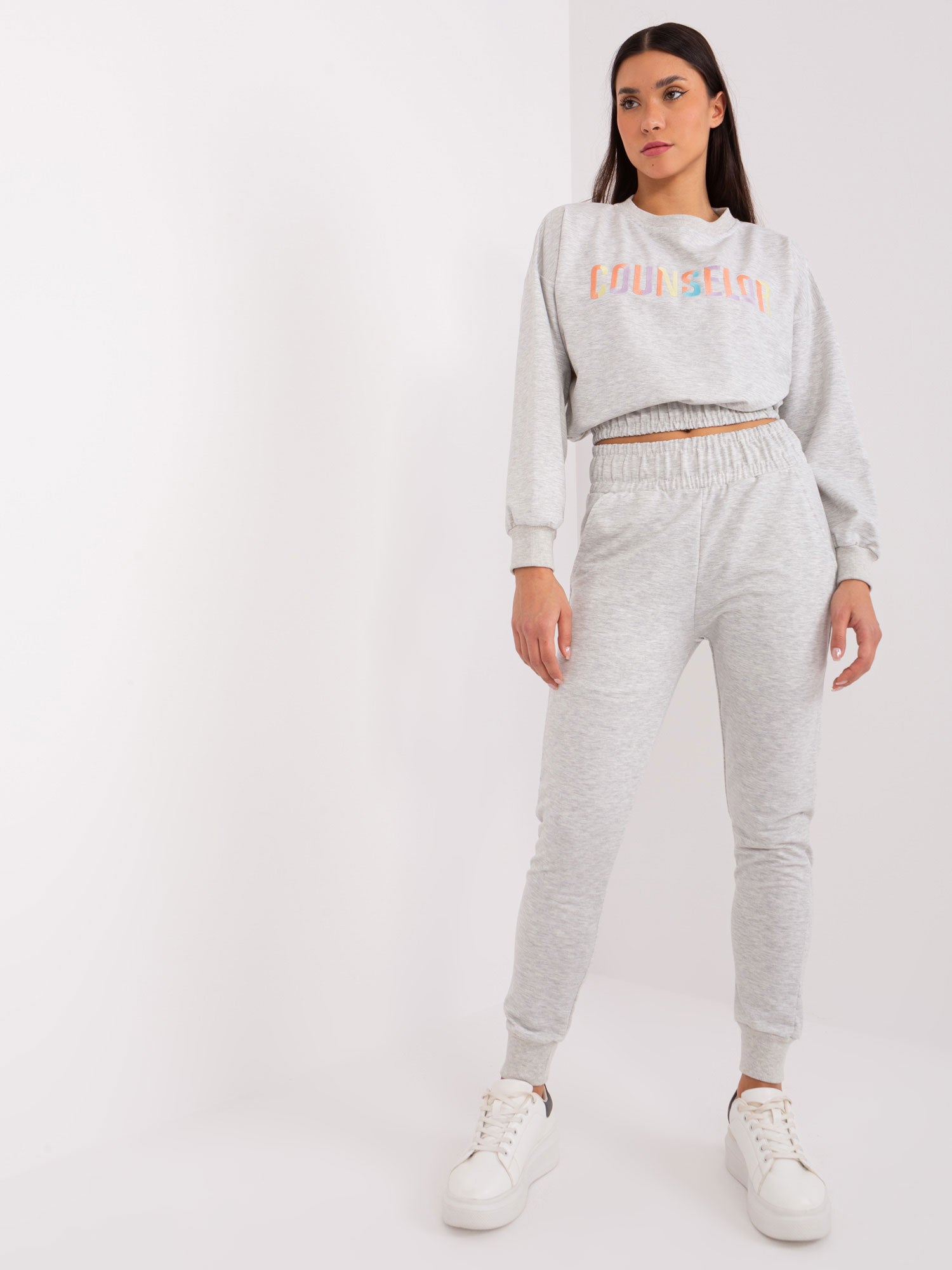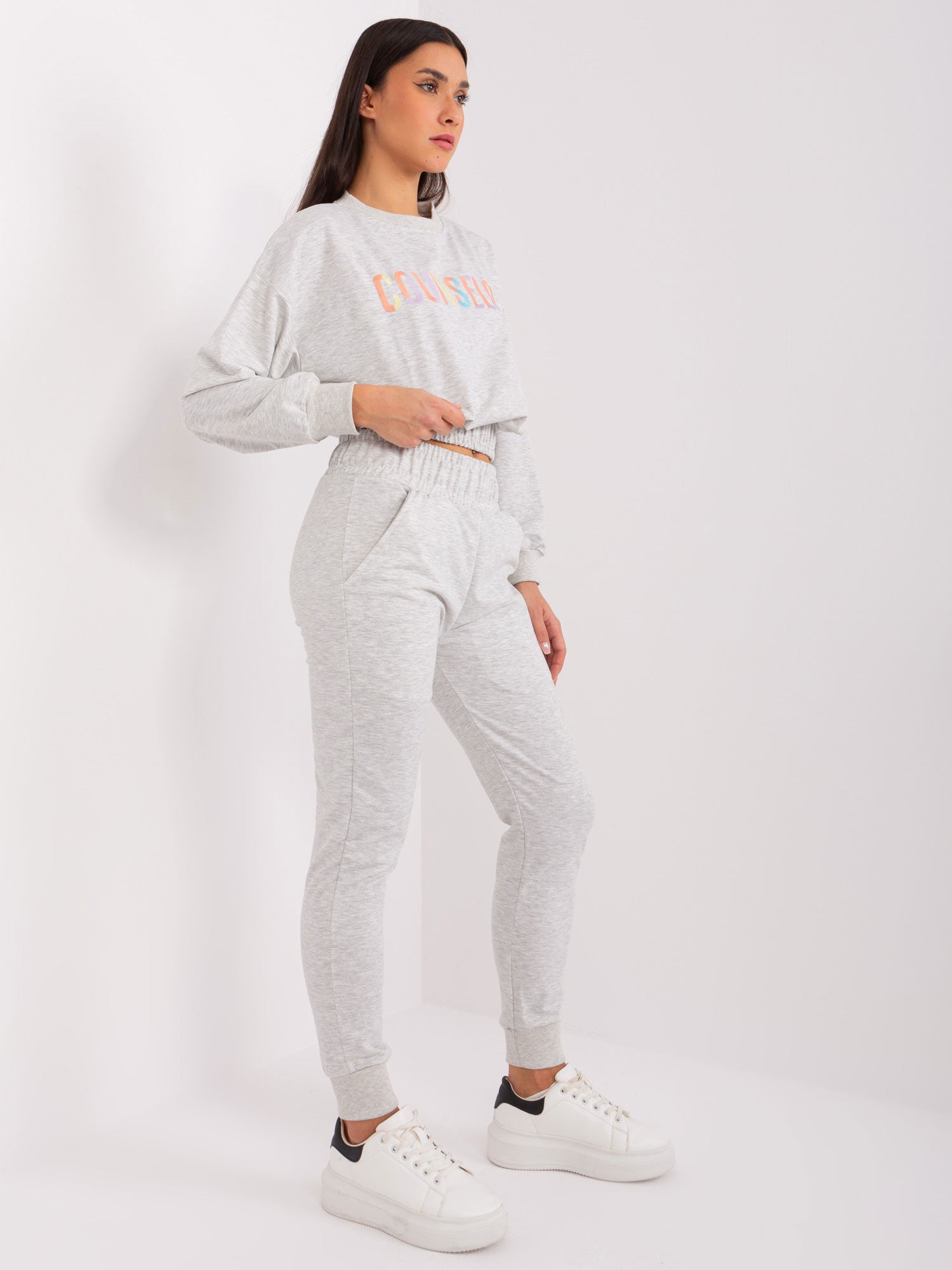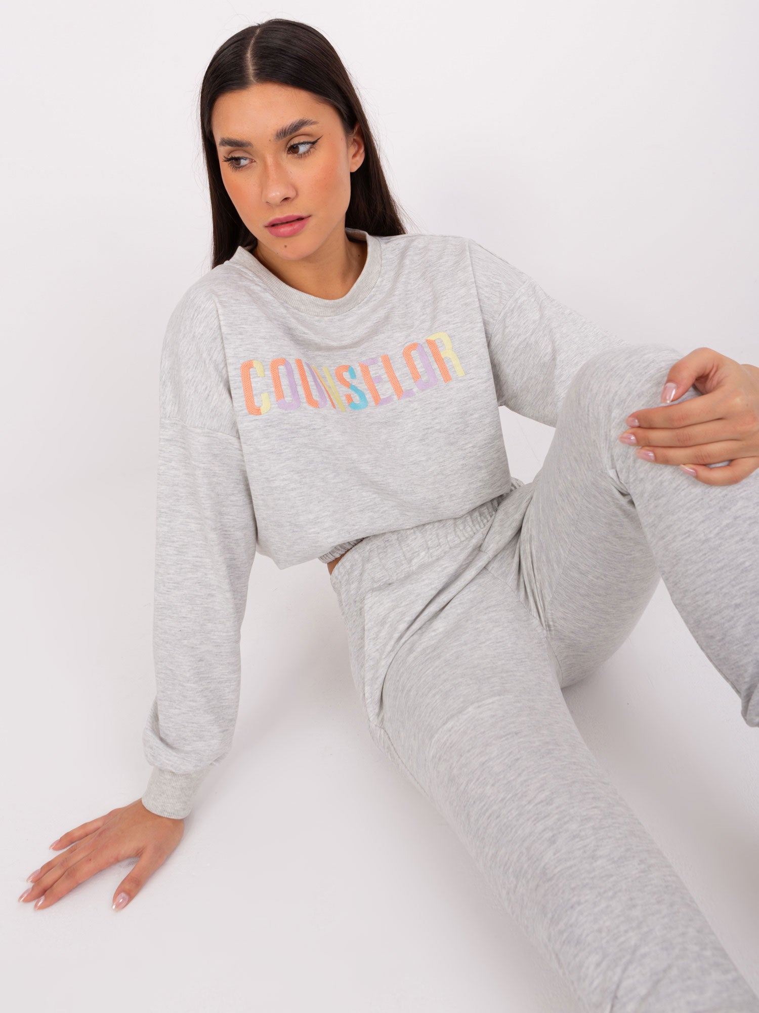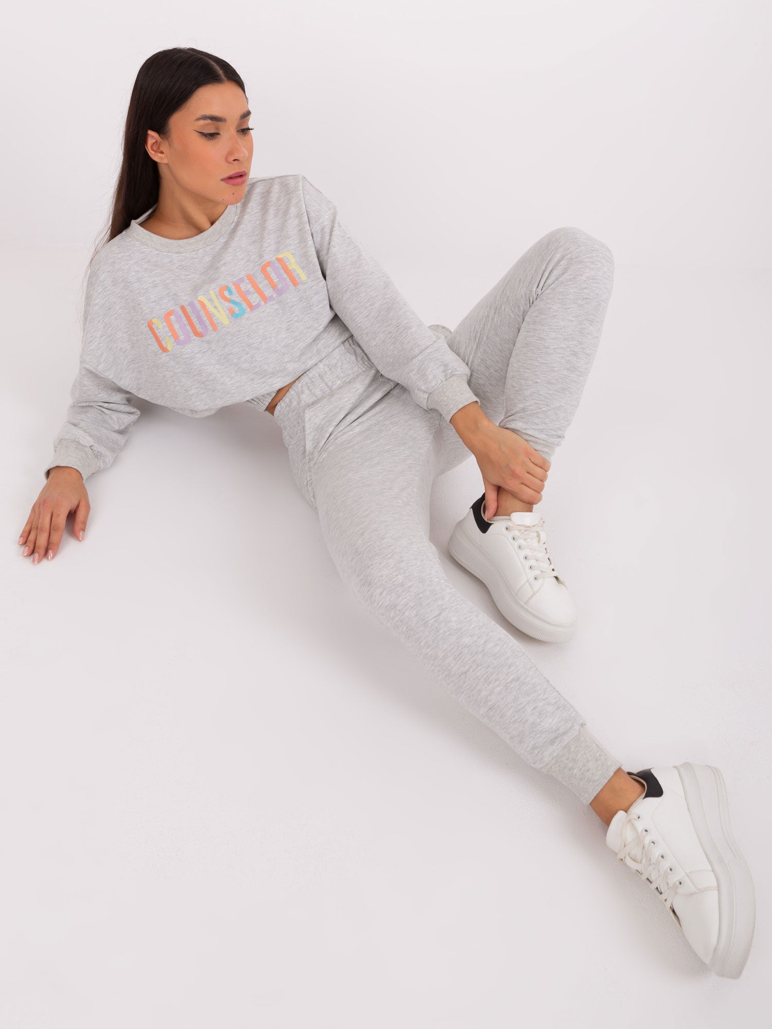 Jasnoszary casualowy komplet z bluzą z kolorowym napisem .