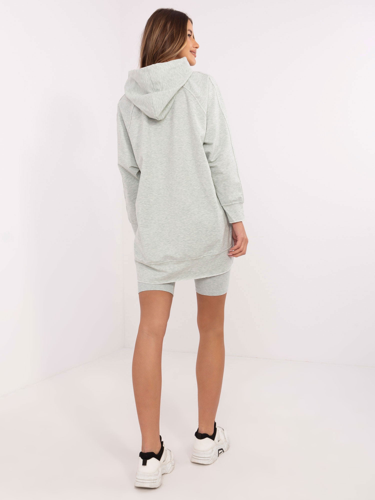 Wymiary kompletu w rozmiarze one size mierzone na płasko: szerokość pod pachami - 64 cm, długość rękawa - 56 cm, długość bluzy - 78 cm, szerokość w pasie - 32 cm, długość kolarek - 50 cm.