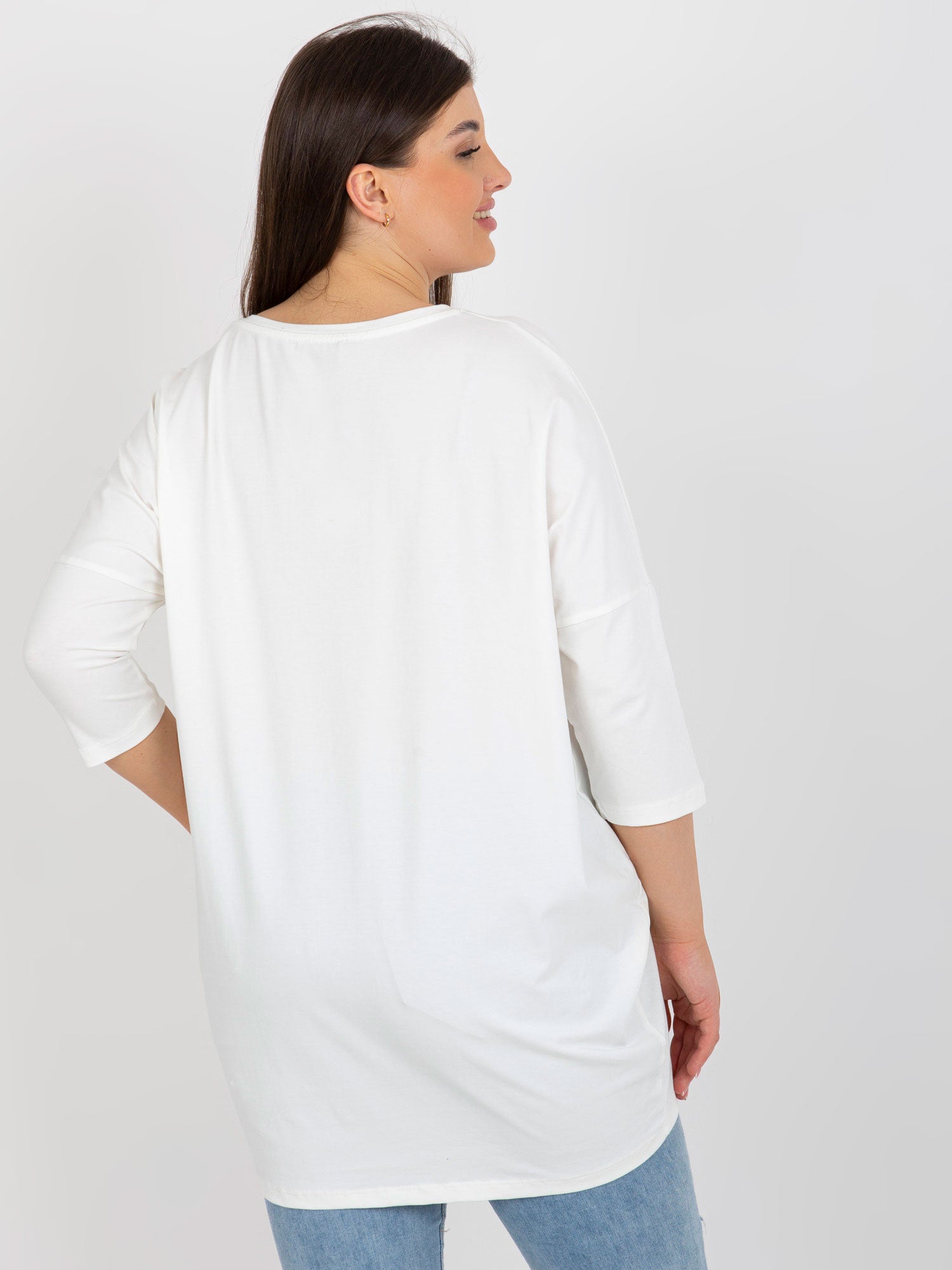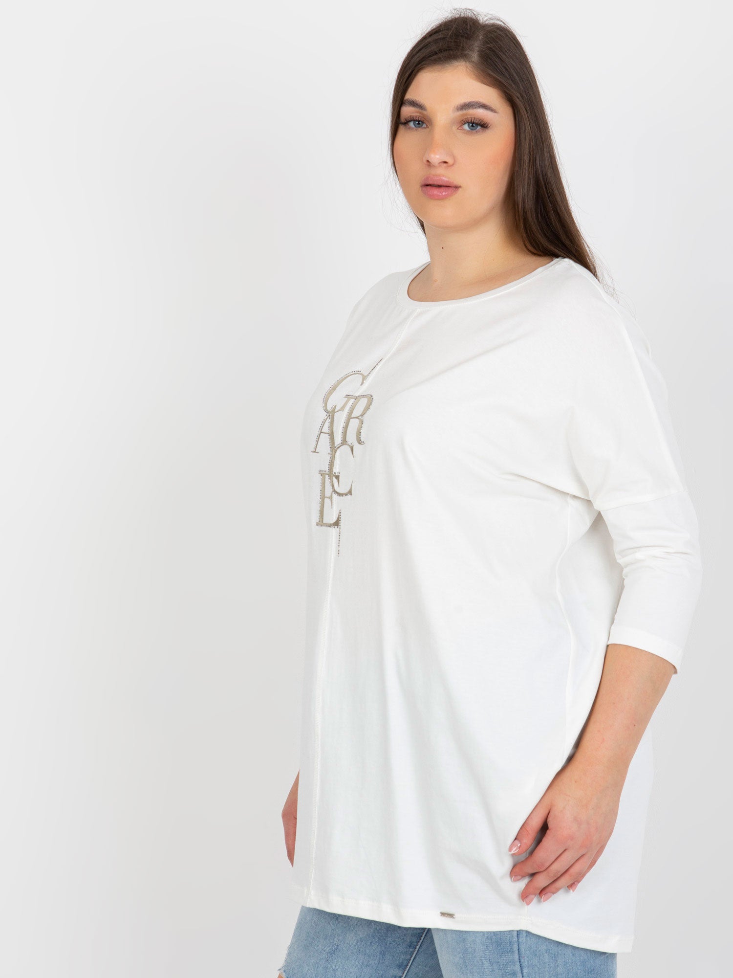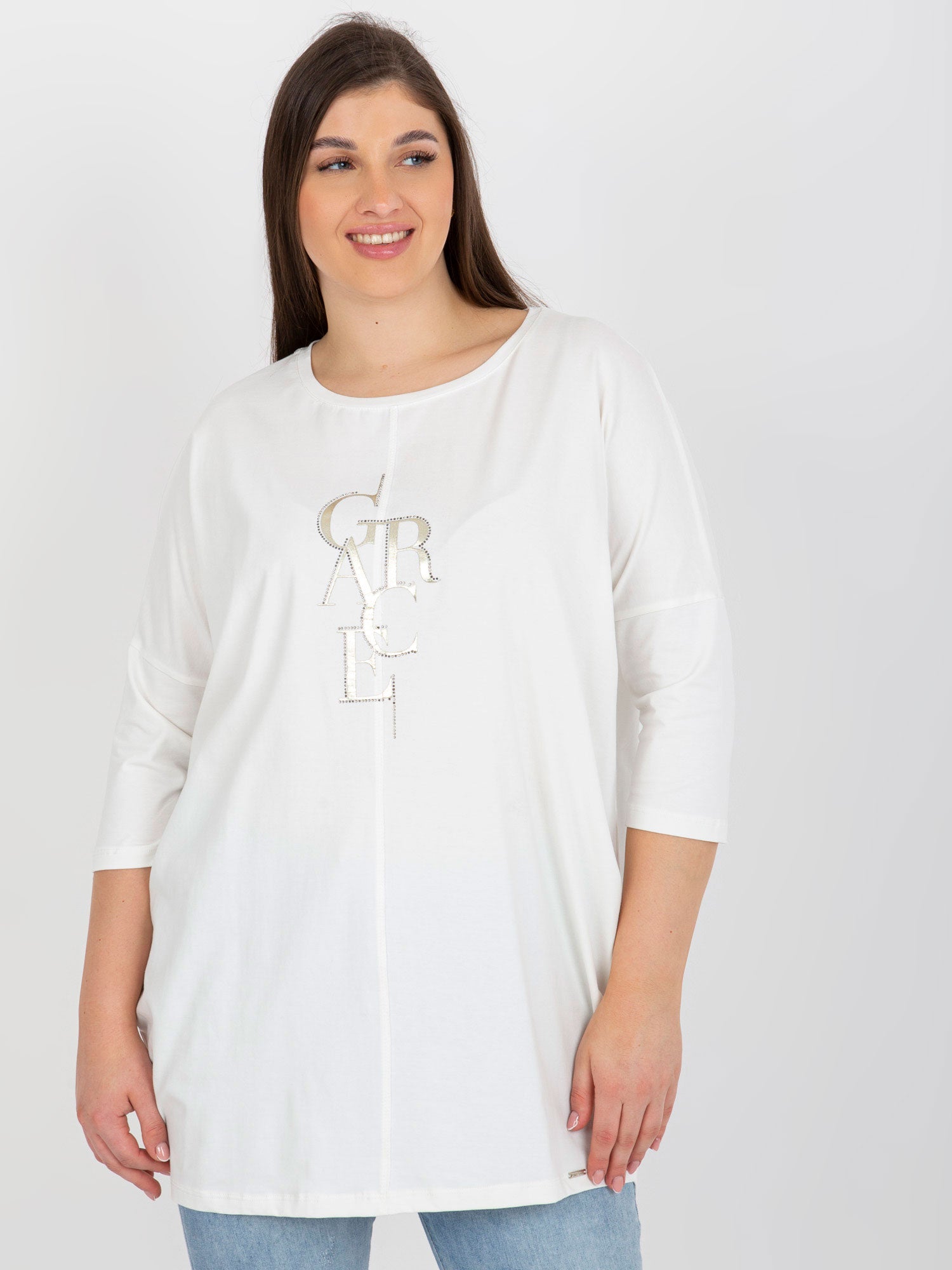 Ecru bluzka plus size z błyszczącym nadrukiem .