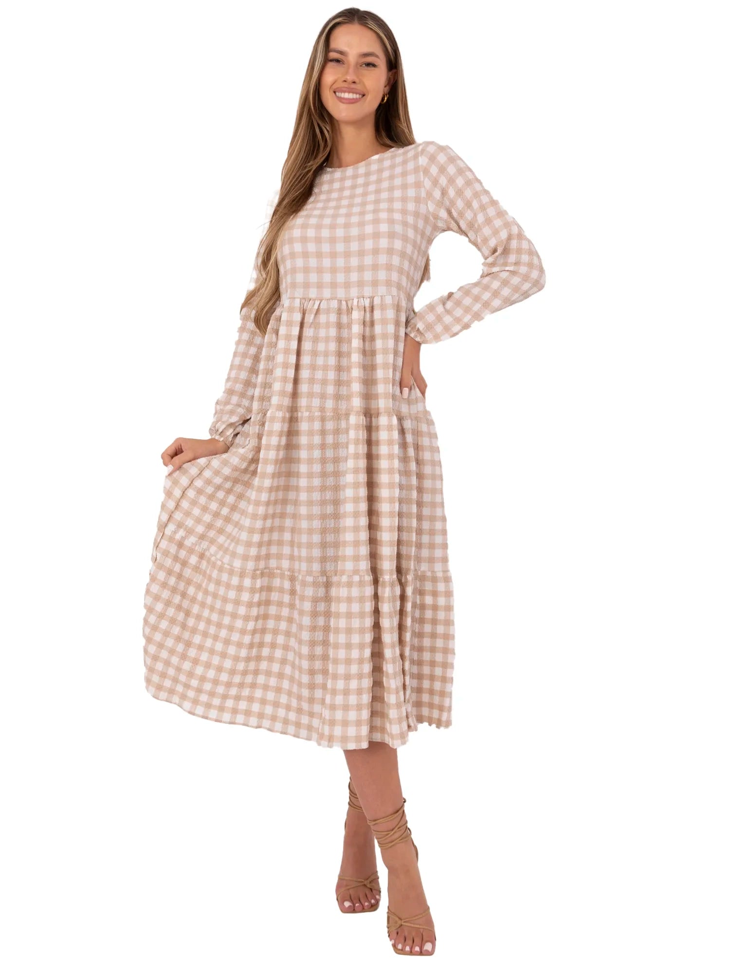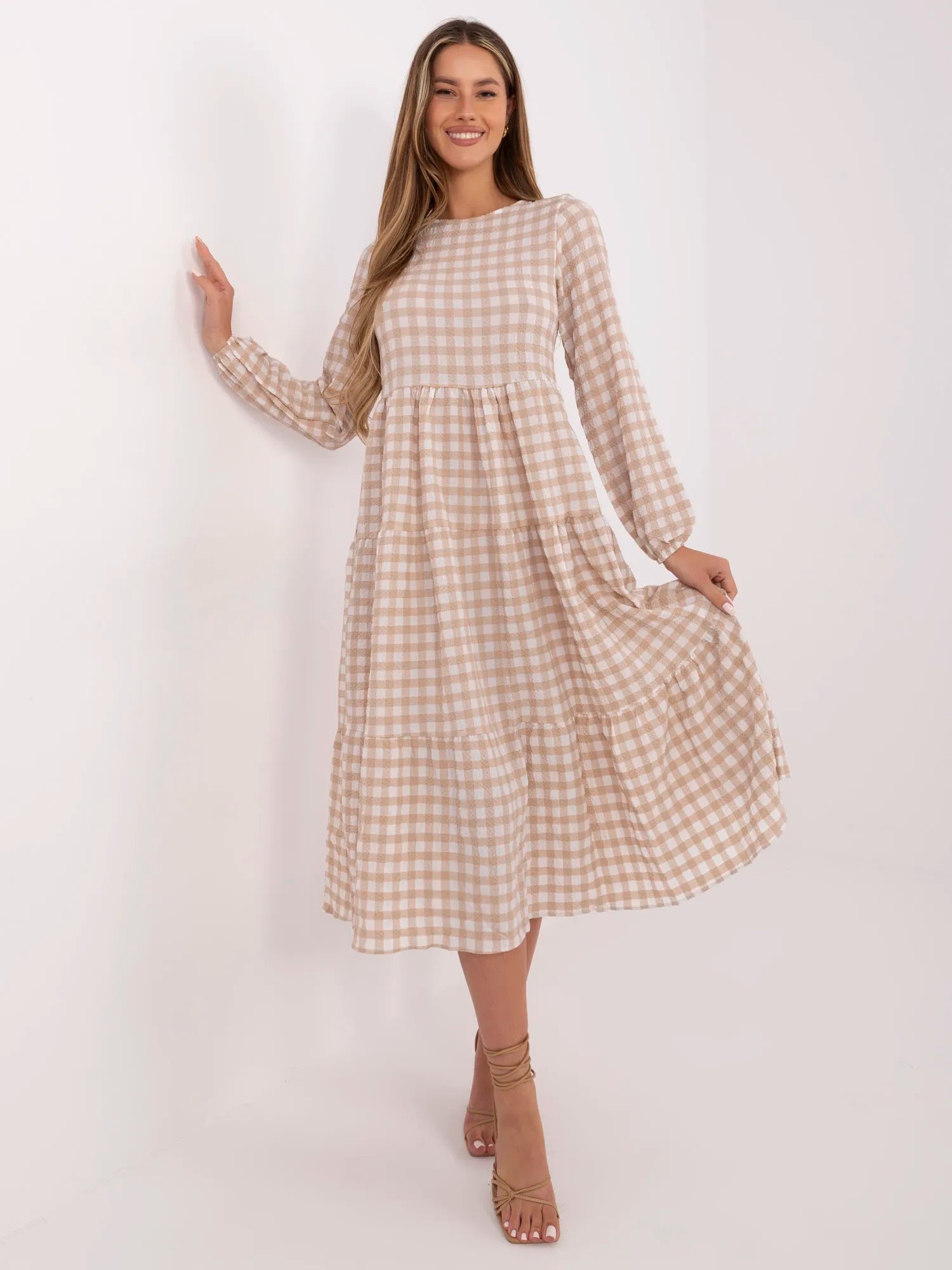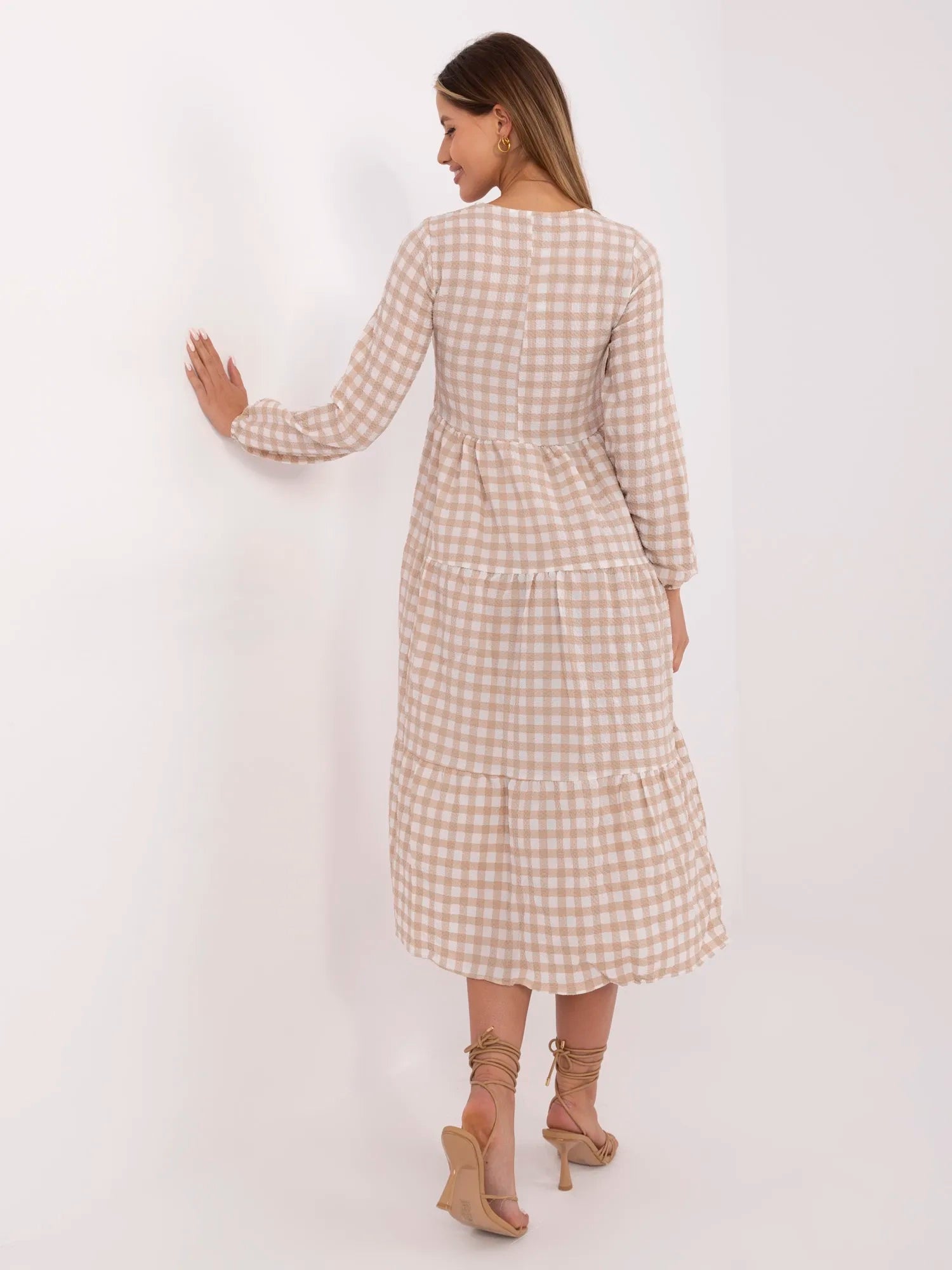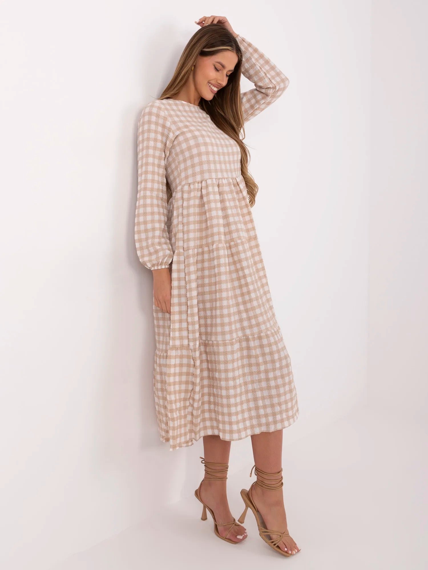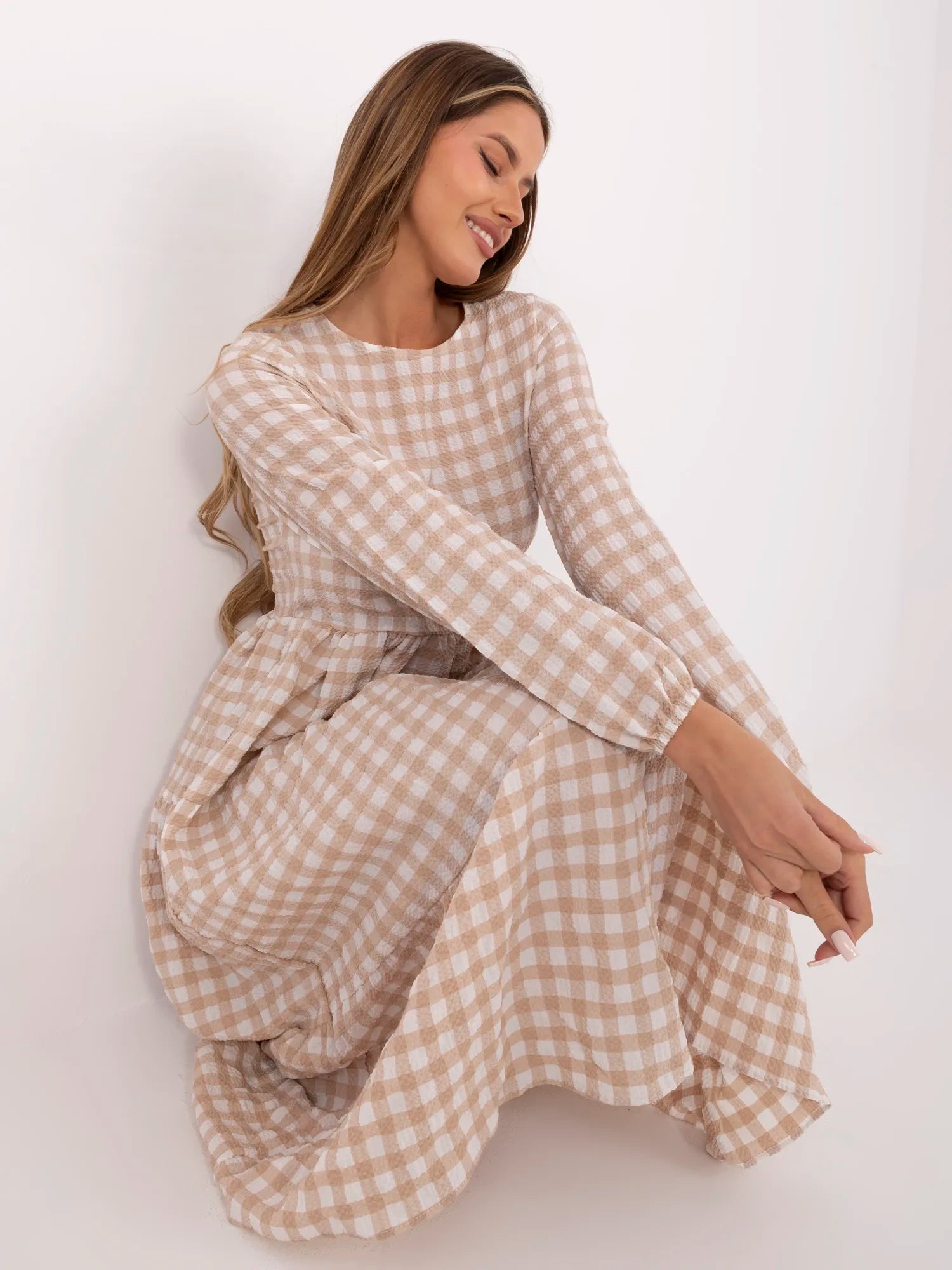 RUE PARIS Beżowa długa sukienka w kratę.