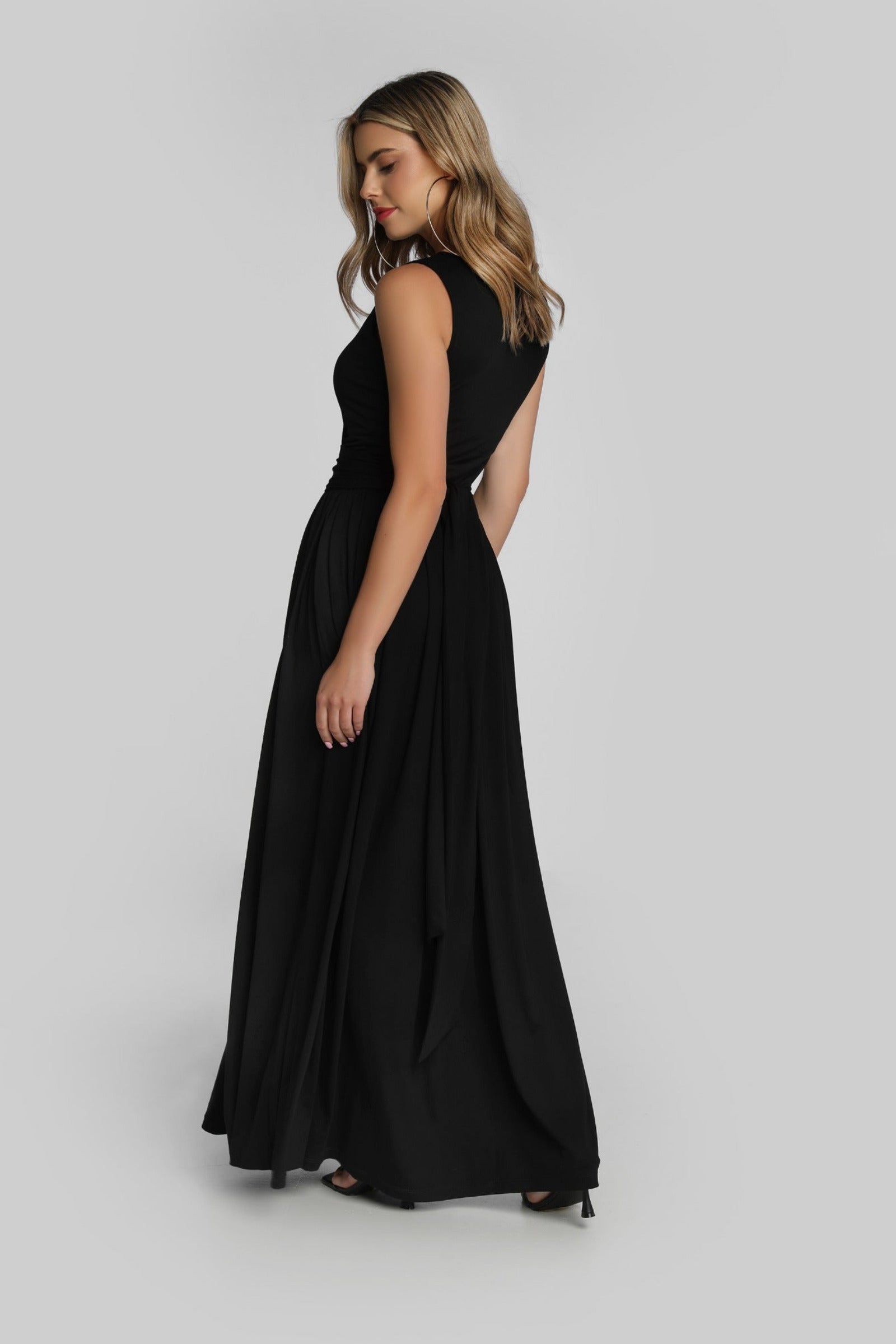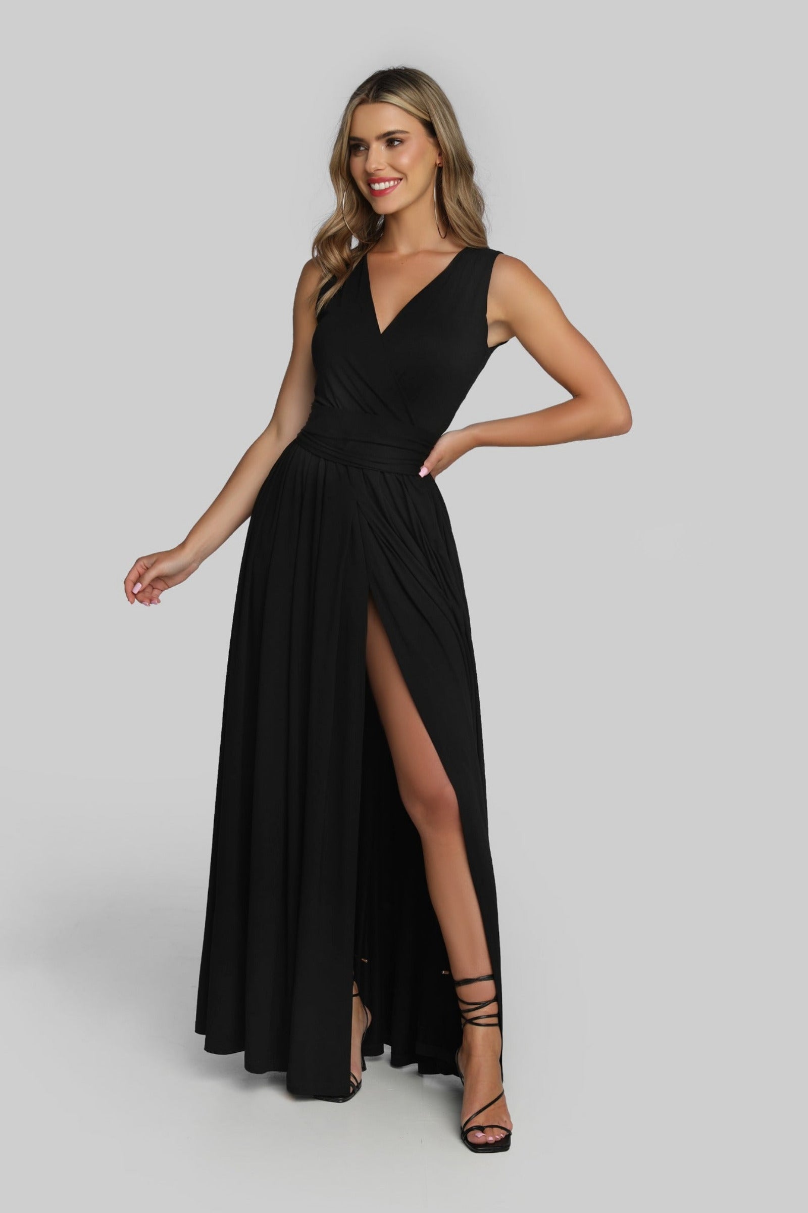 Sukienka maxi z kopertową górą. Dół sukienki uszyty jest z aż 3 metrów wiskozy, dzięki czemu sukienka niesamowicie pracuje w ruchu. Rozcięcie na środku sprawia, że sukienka nabiera niepowtarzalnej lekkości. Dodatkowo ma kieszenie w szwach bocznych (bo wiemy, że kochacie kieszenie!). Do sukienki dołączony jest pasek, który zakrywa gumkę oraz marszczenie w talii i sprawia, że sukienka nabiera jeszcze bardziej eleganckiego wymiaru.