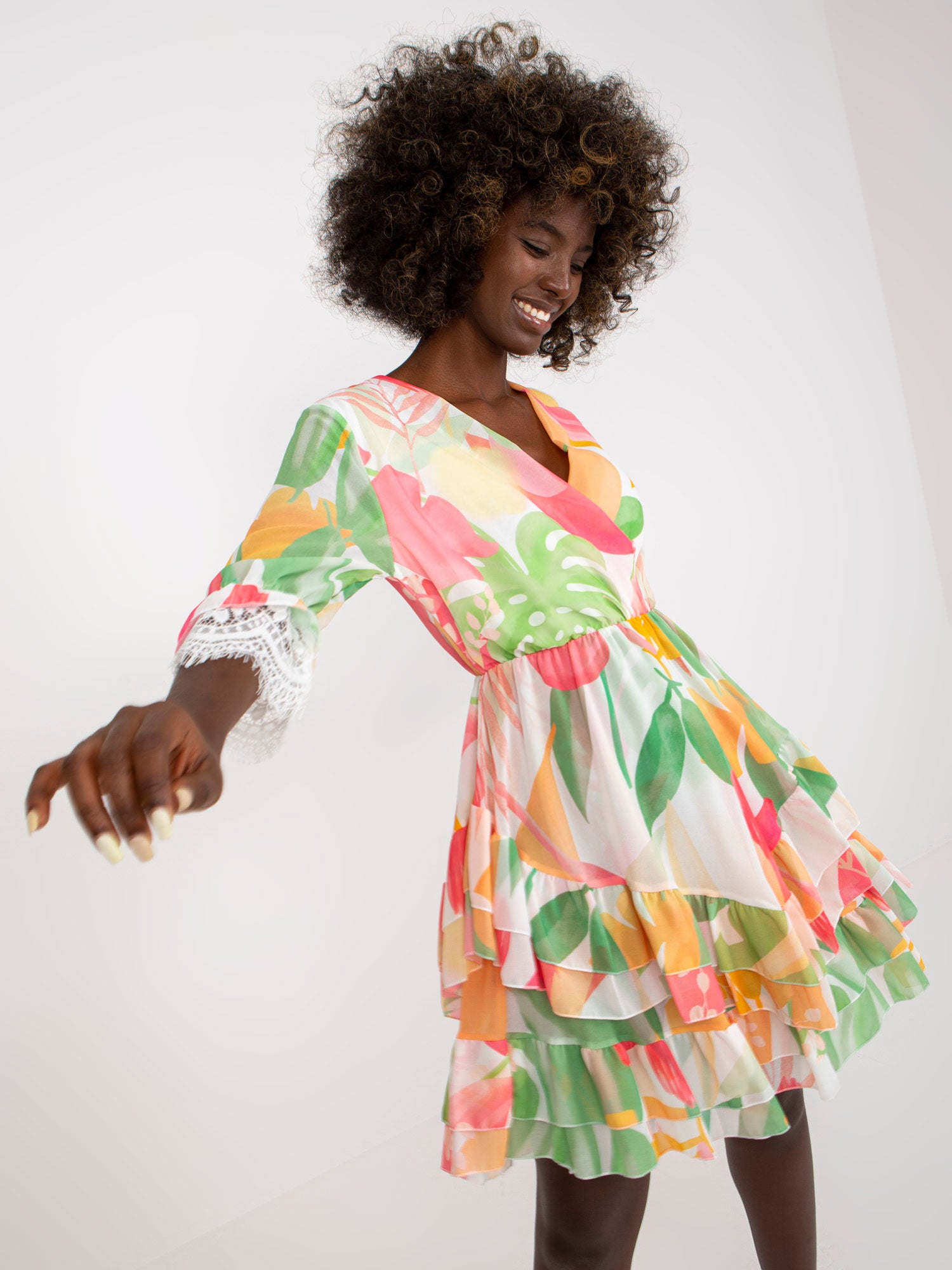 Różowo-zielona kopertowa sukienka z falbanami i printem .